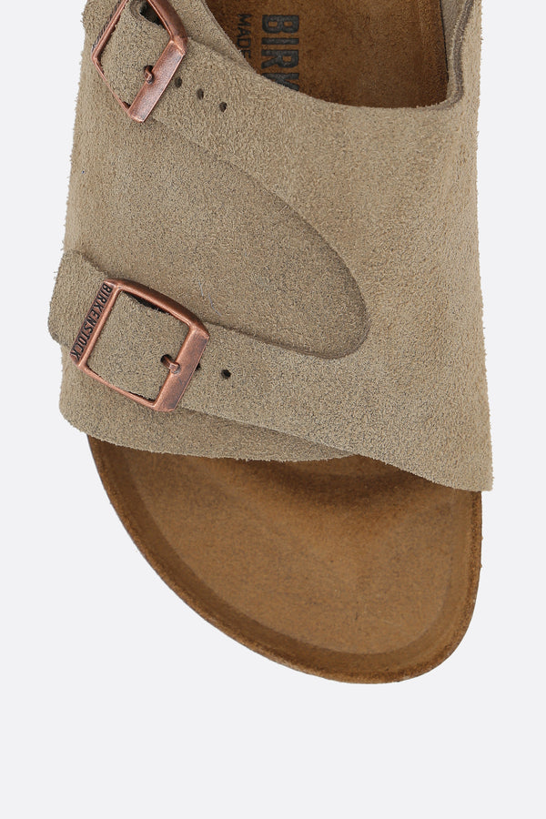Birkenstock flat sandals crafted in taupe grey suede. Featuring a round-toe silhouette, adjustable buckled straps, leather lining and lightweight Eva rubber sole. The design is completed by the iconic lettering logo embossed on side.