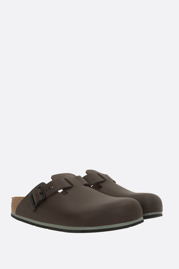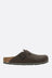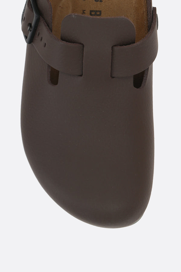 Birkenstock flat mules crafted from brown pebbled leather. Featuring a rounded toe, adjustable strap with metal buckle, leather lining, and lightweight EVA rubber sole. The design is completed with the iconic embossed logo on the side.