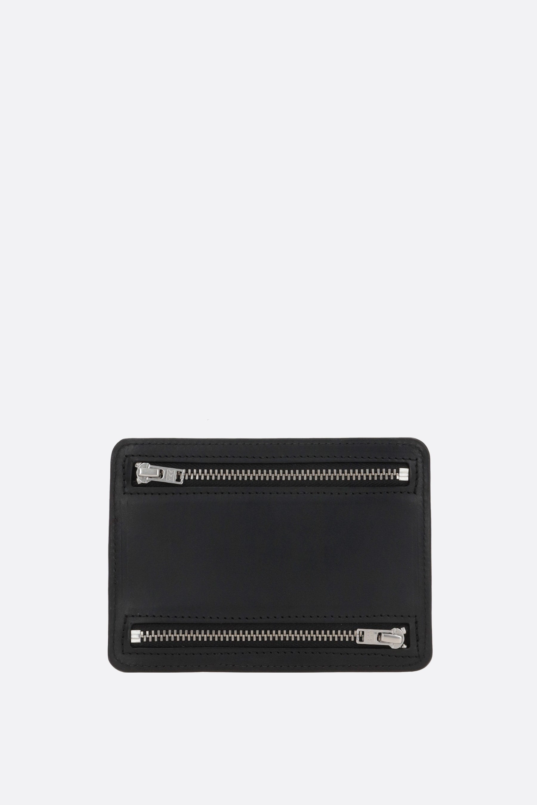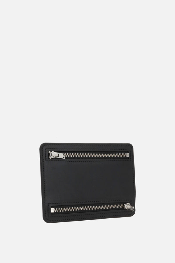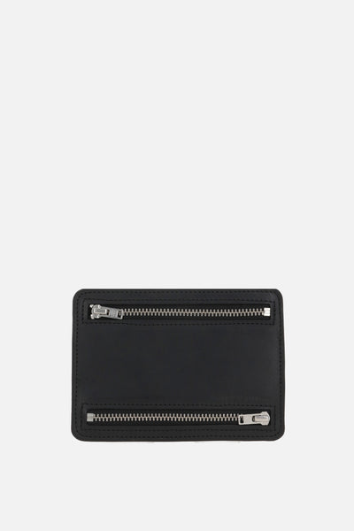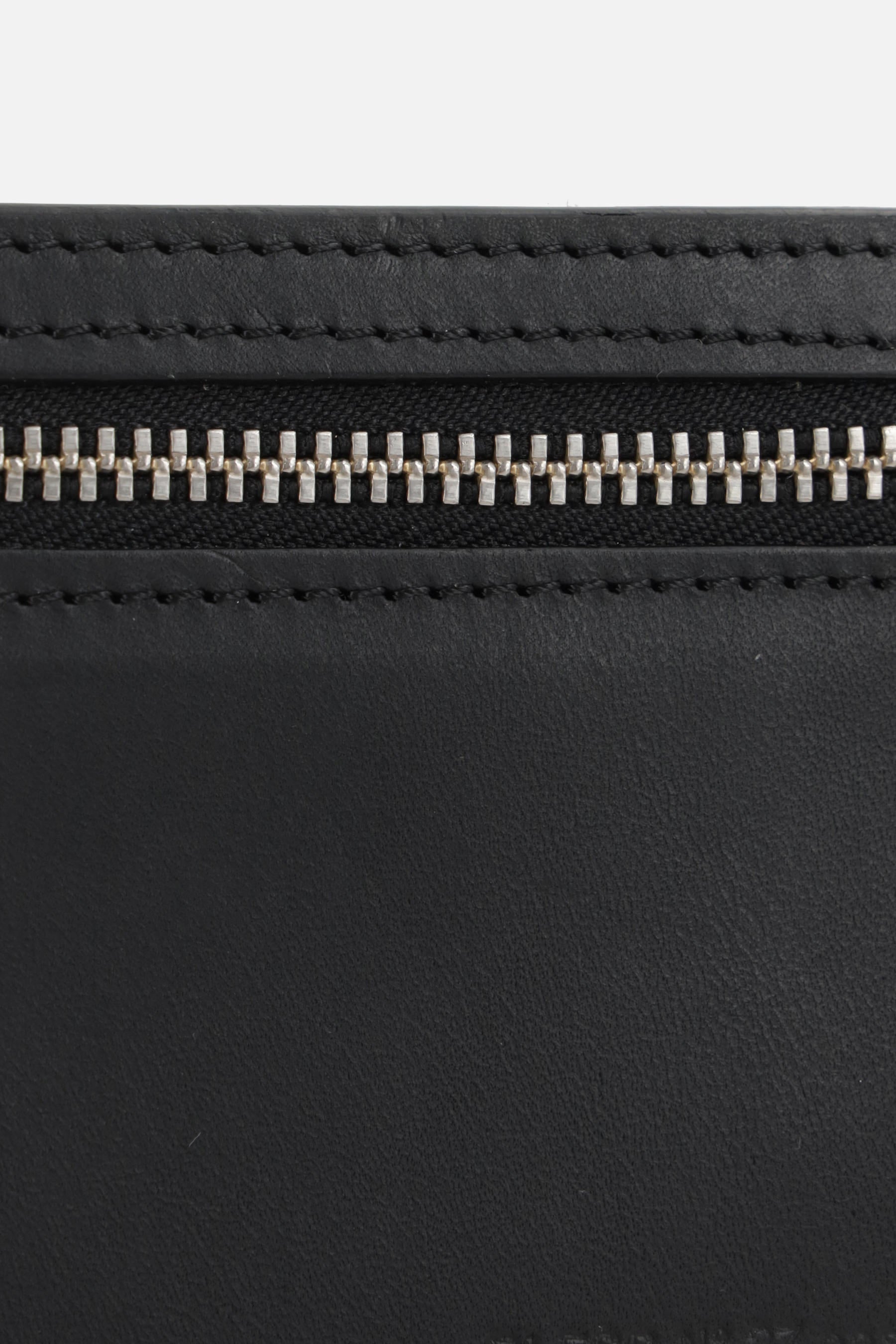 Bless coin purse crafted in black smooth leather with lettering logo embossed on front. It features silver-tone hardware, four zip pockets and fabric lining.