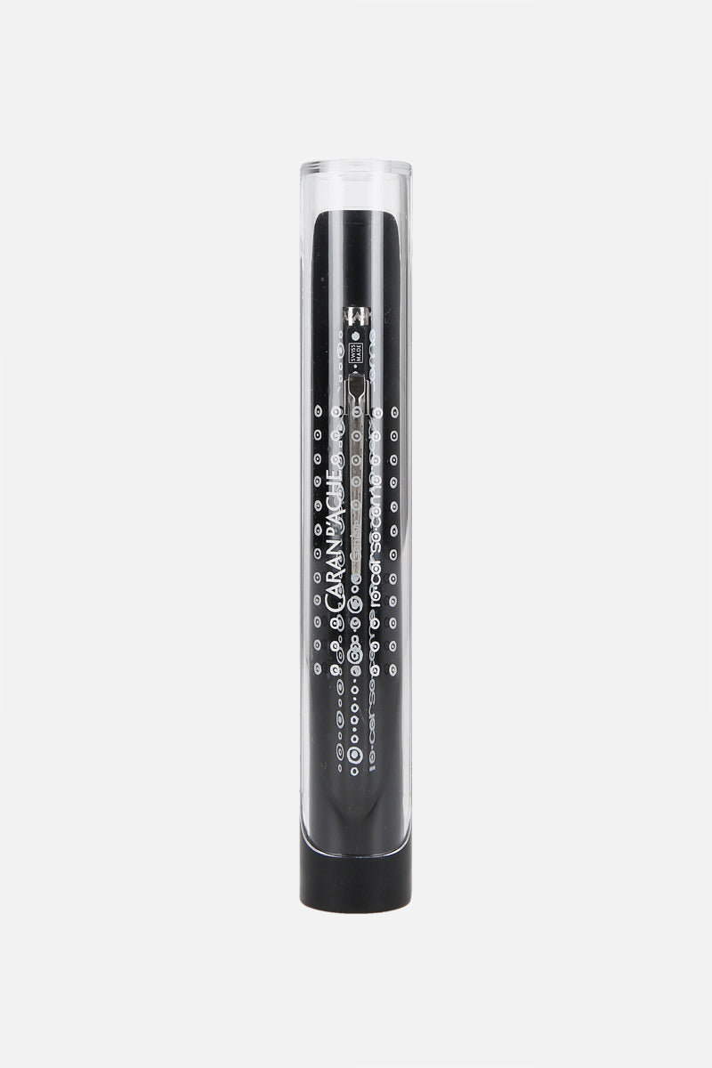 Hexagonal ballpoint pen by Caran d'Ache, created in collaboration with 10 Corso Como. Made of silver/black metal with a bubbles print and contrasting logo. Black ink.