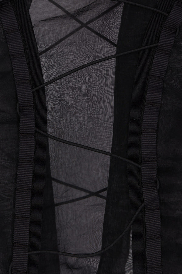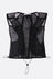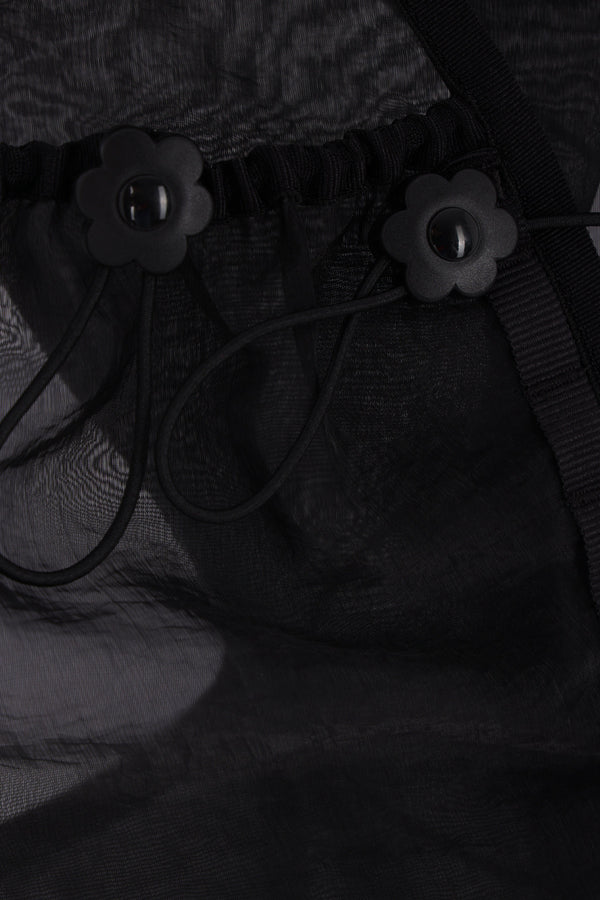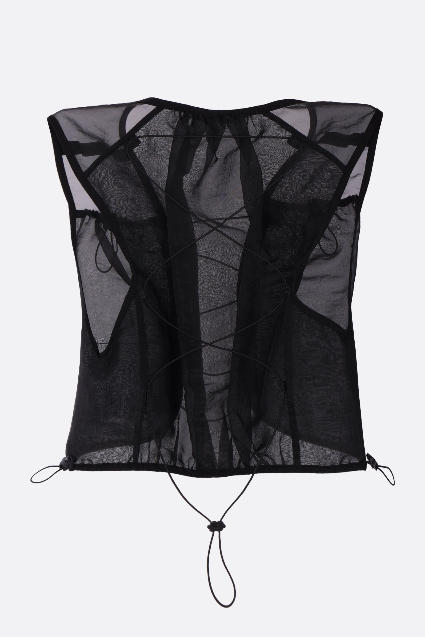 Cecilie Bahnsen cropped vest crafted from black Liquid Myrtia fabric with tonal grosgrain trim. Featuring a V-neckline, front drawstring closure, and a straight hem.