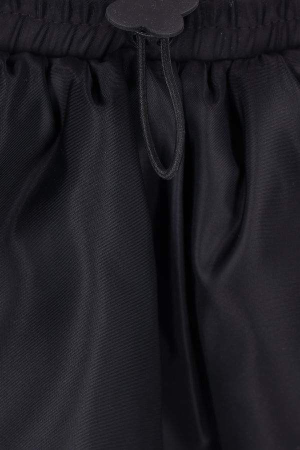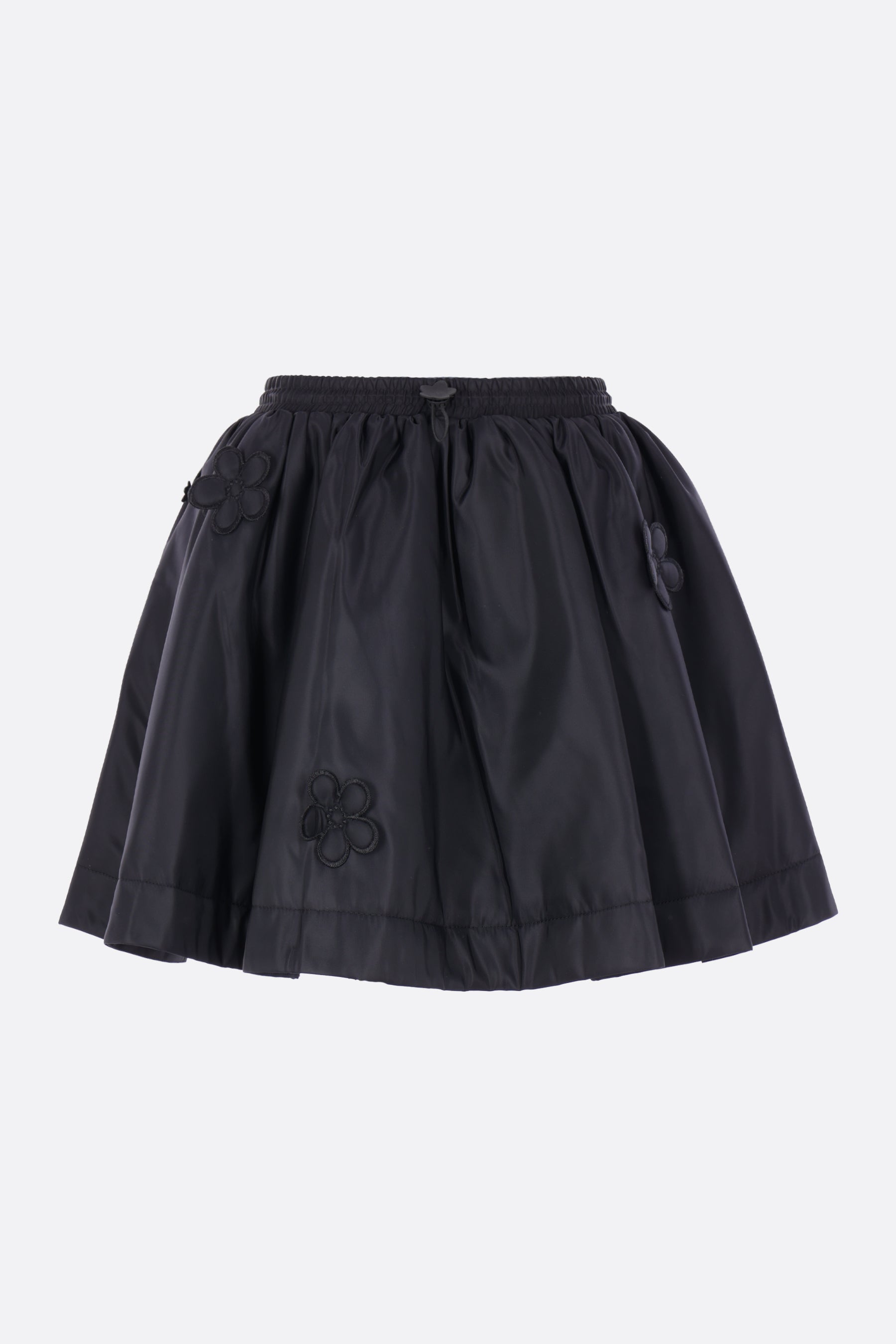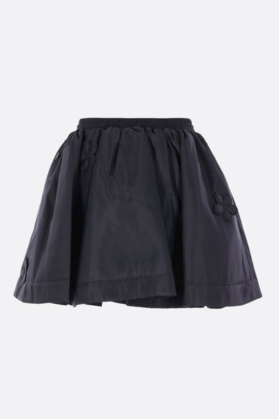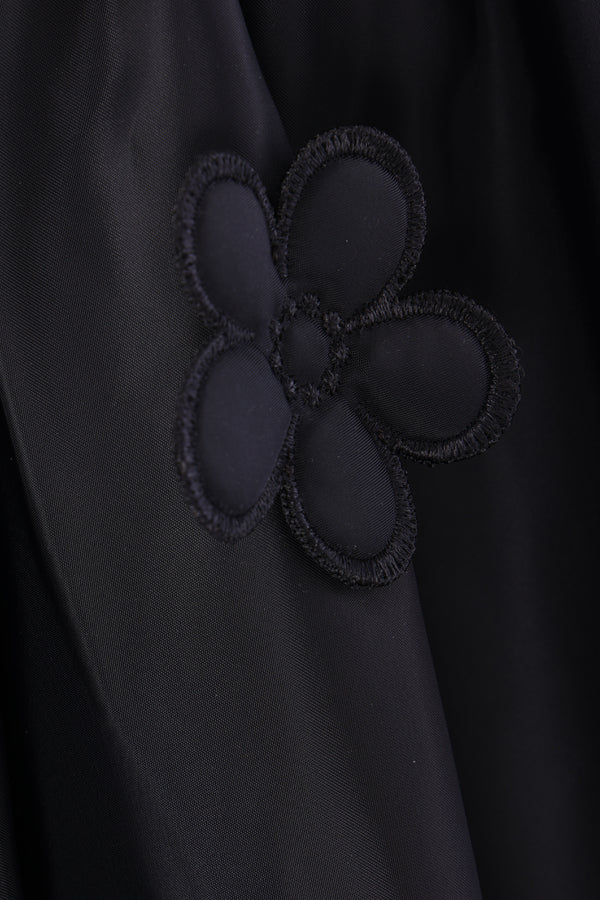 Cecilie Bahnsen circle skirt crafted from black padded nylon with floral appliqués. Featuring an elasticized waistband with drawstring, side zip pockets, and a lined interior.