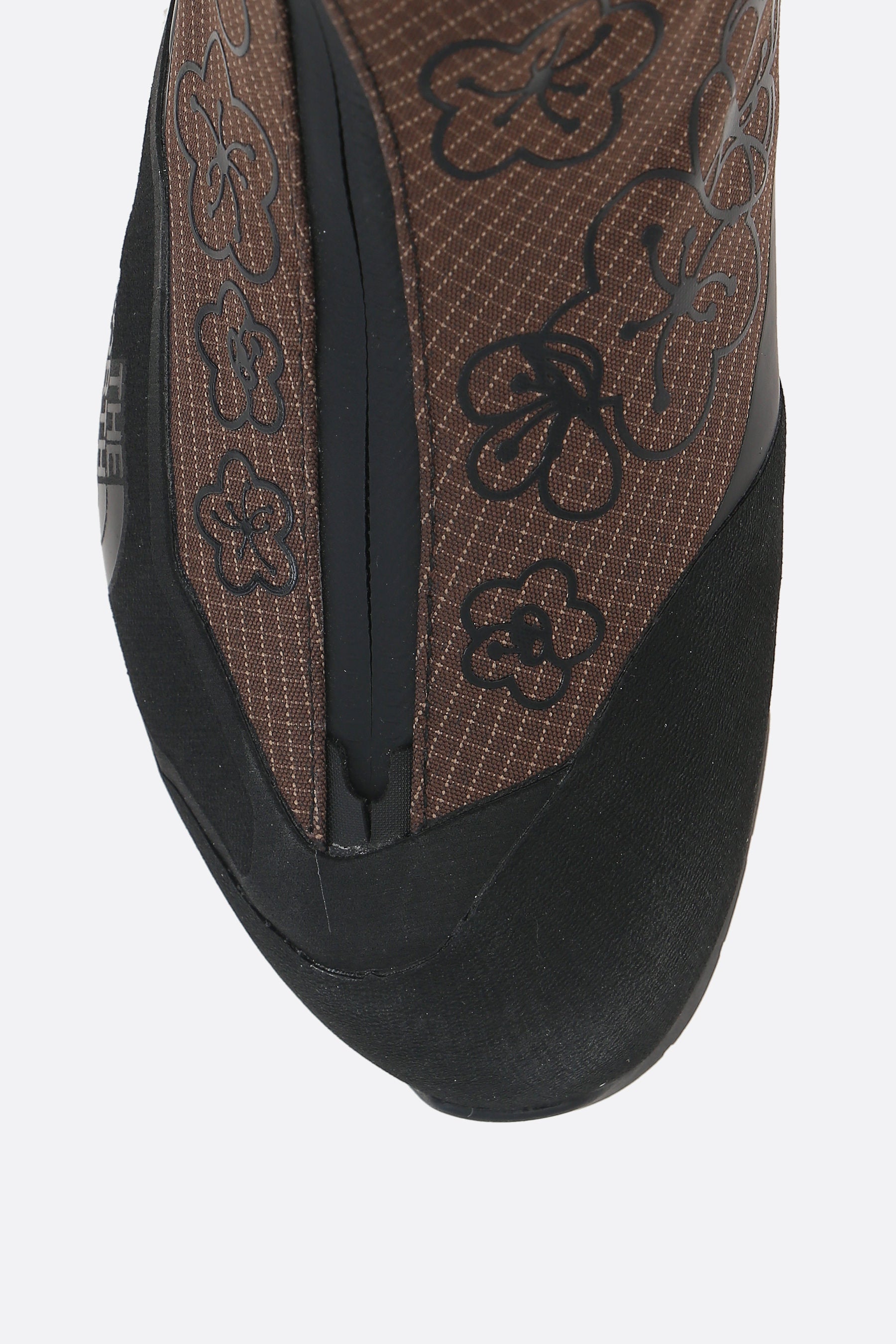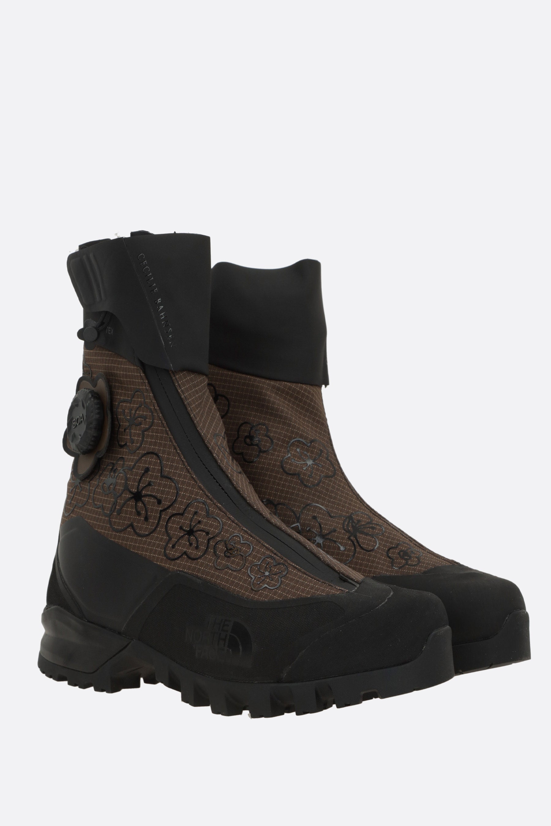 Cecilie Bahnsen x The North Face ankle boots crafted from brown GORE-TEX nylon with a floral print and black rubber details. Featuring a rounded toe, off-center zip closure, Velcro strap at the ankle, fabric linings, and a Vibram rubber sole. Completed with logo prints on the outer side.