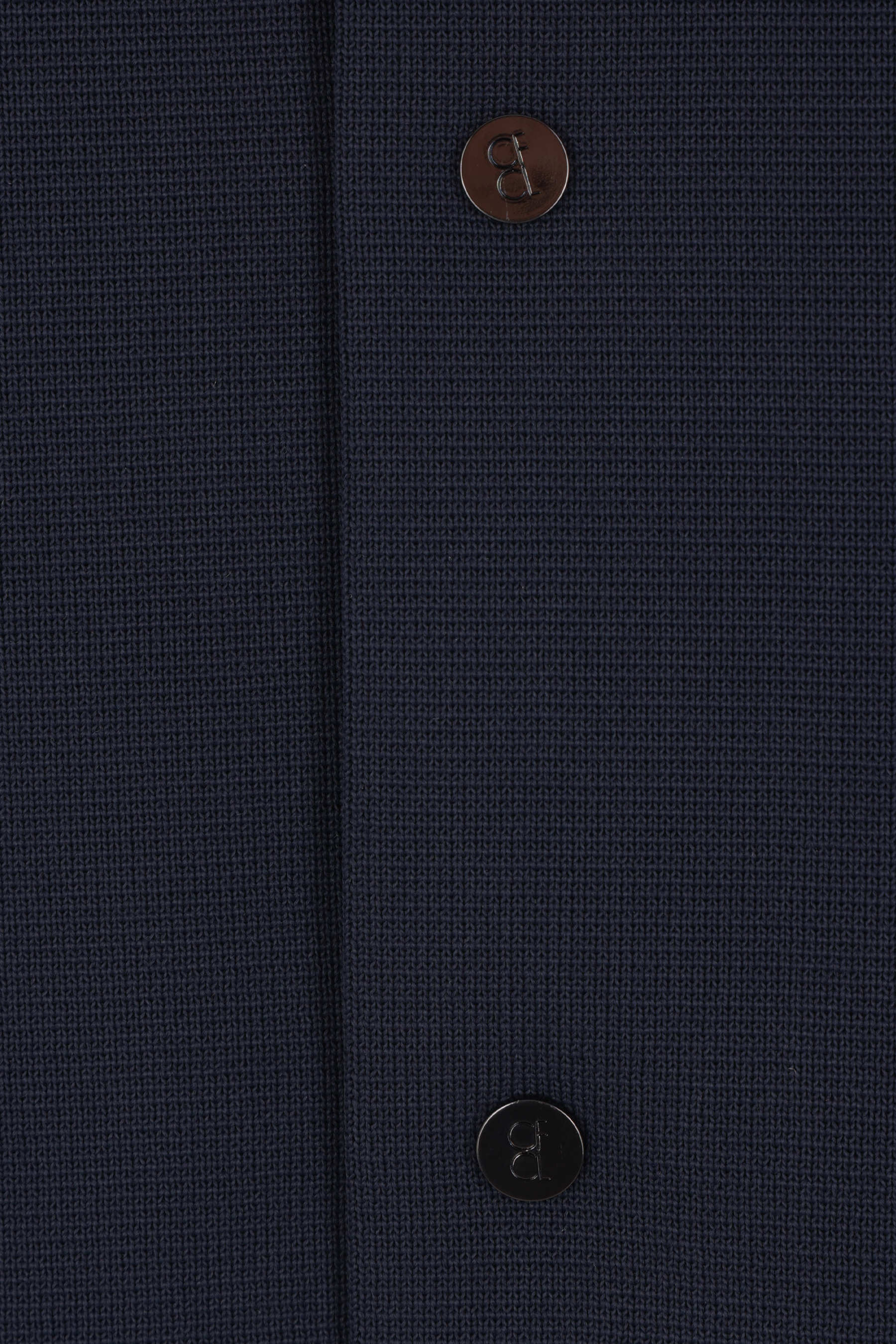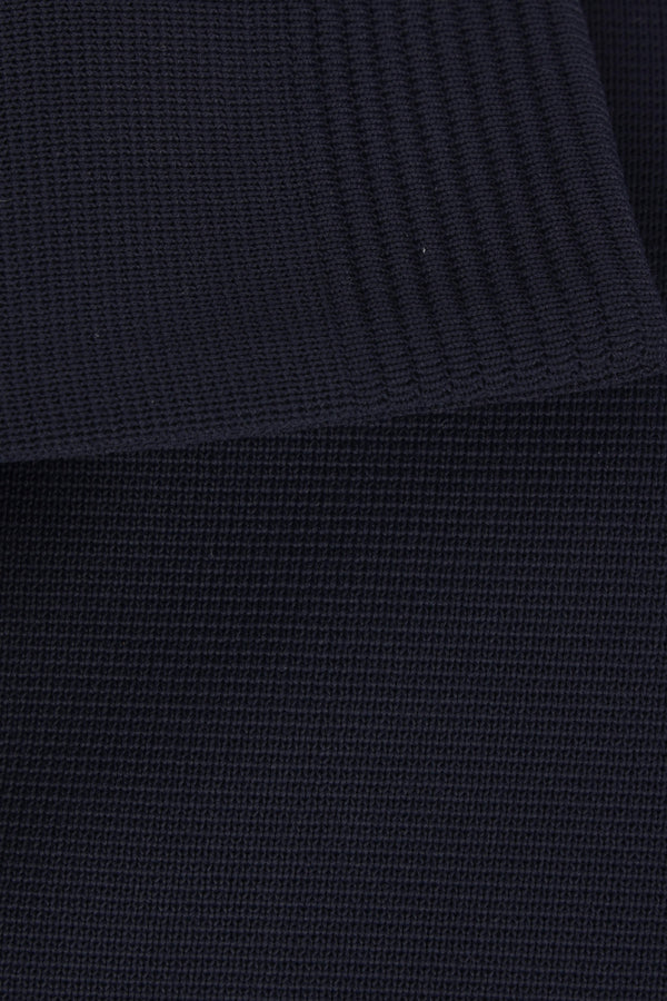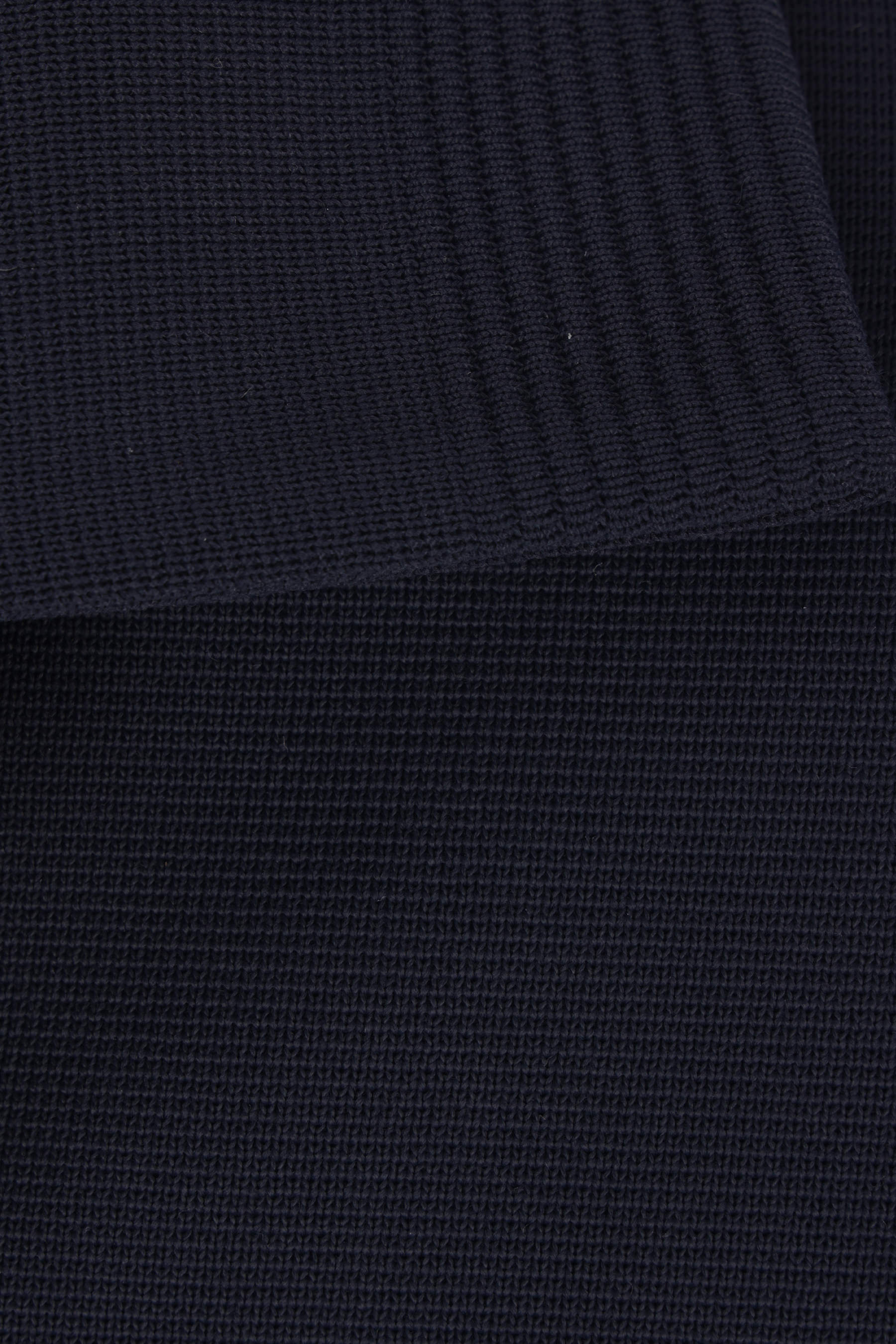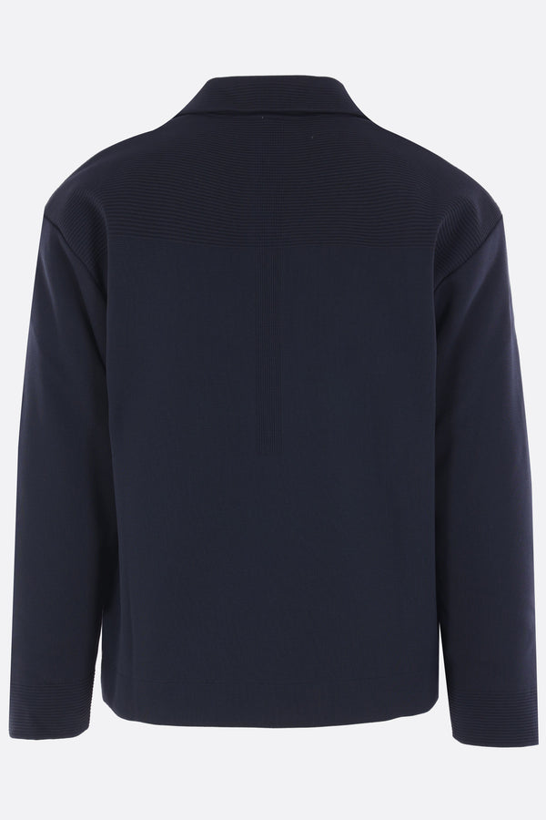 CFCL jacket crafted from blue Milano rib knit. Featuring a pointed collar, front snap-button closure, concealed side pockets, long sleeves, ribbed trims, and a straight hem with drawstring. Finished with a quilted lining.