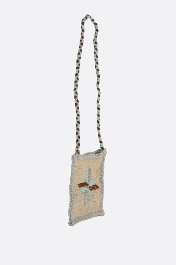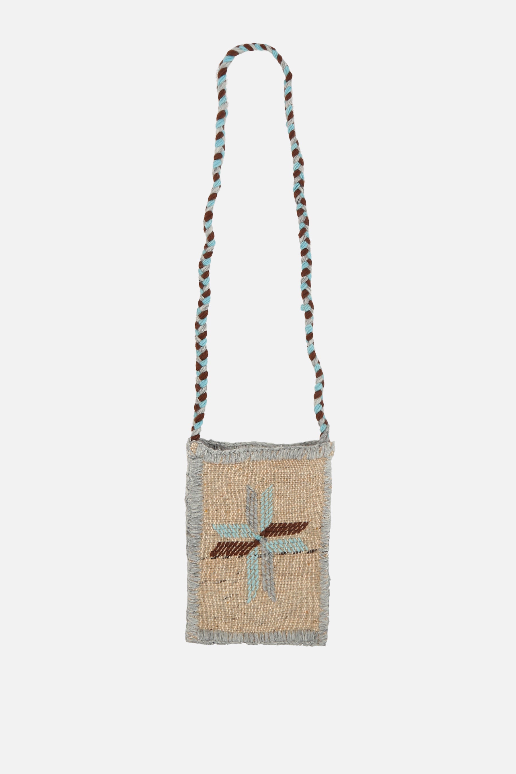 Chamula pocket bag handcrafted from natural wool with contrasting stitched edges and graphic embroidery on both sides. Featuring a multicolor braided wool shoulder strap and an unlined interior. The artisanal production makes each piece unique, with slight variations that make it truly special.