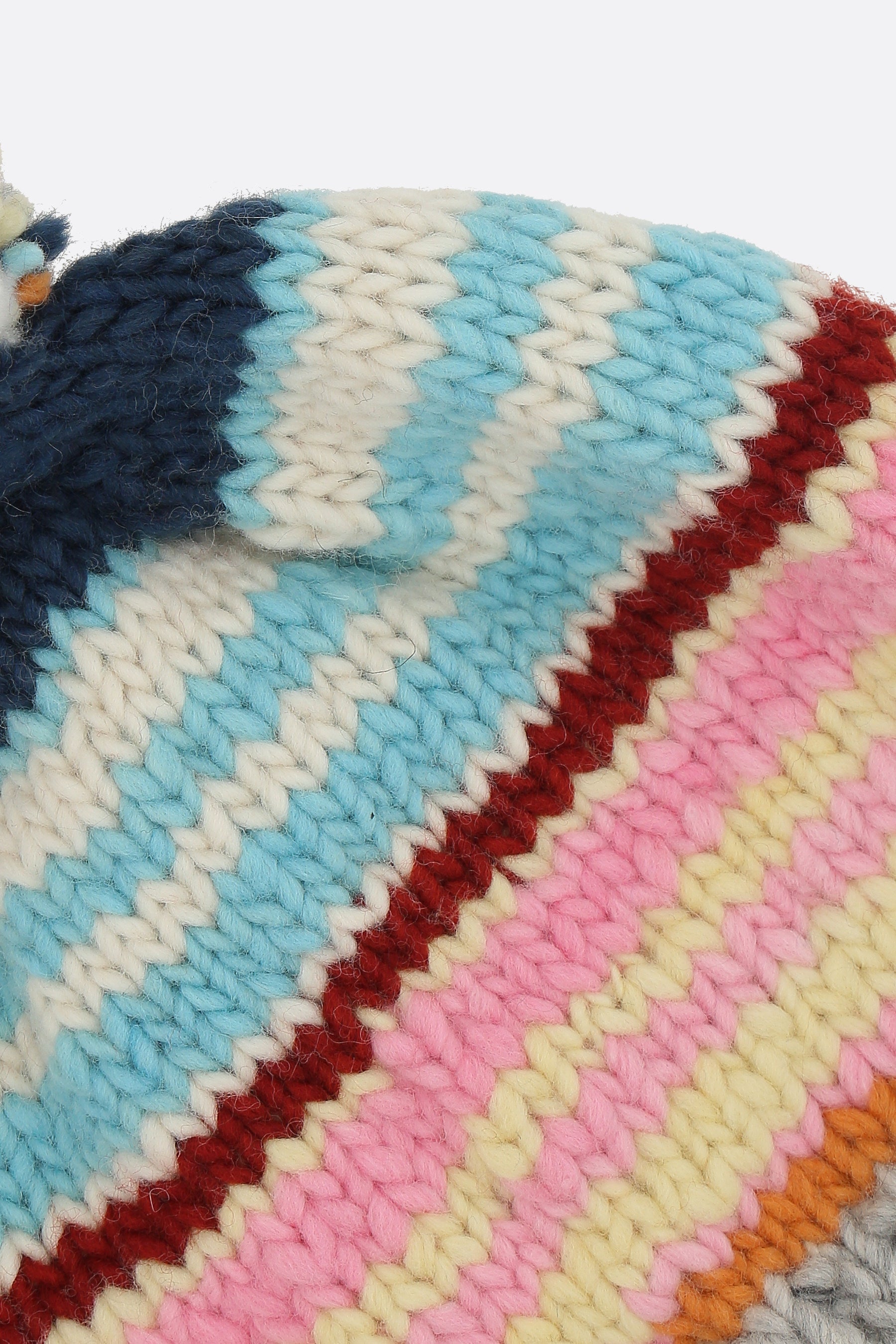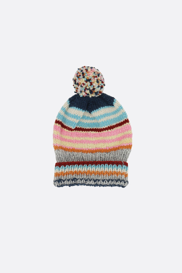Chamula beanie handknitted in wool with a colorful striped pattern. Features a folded brim and a matching pom-pom.