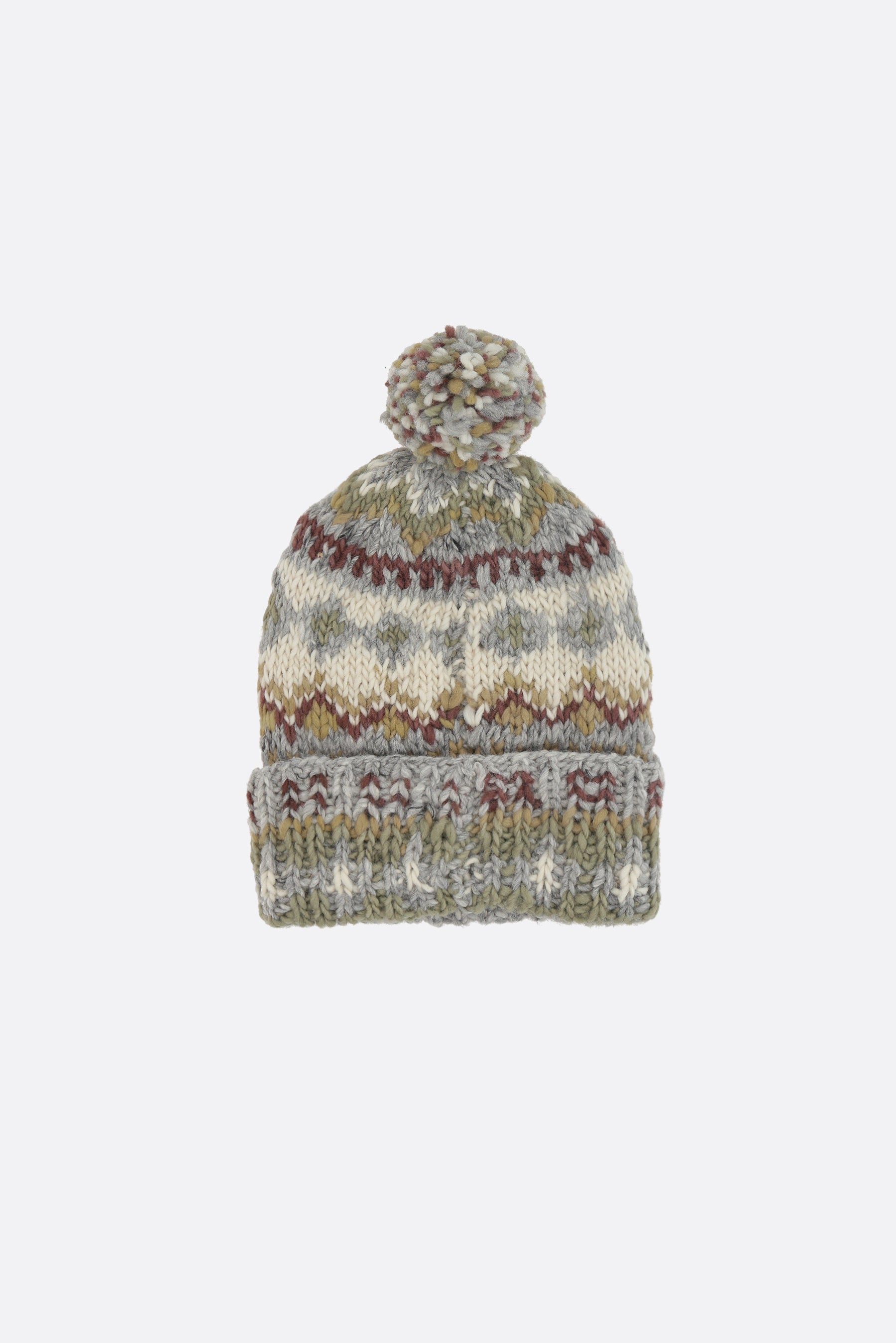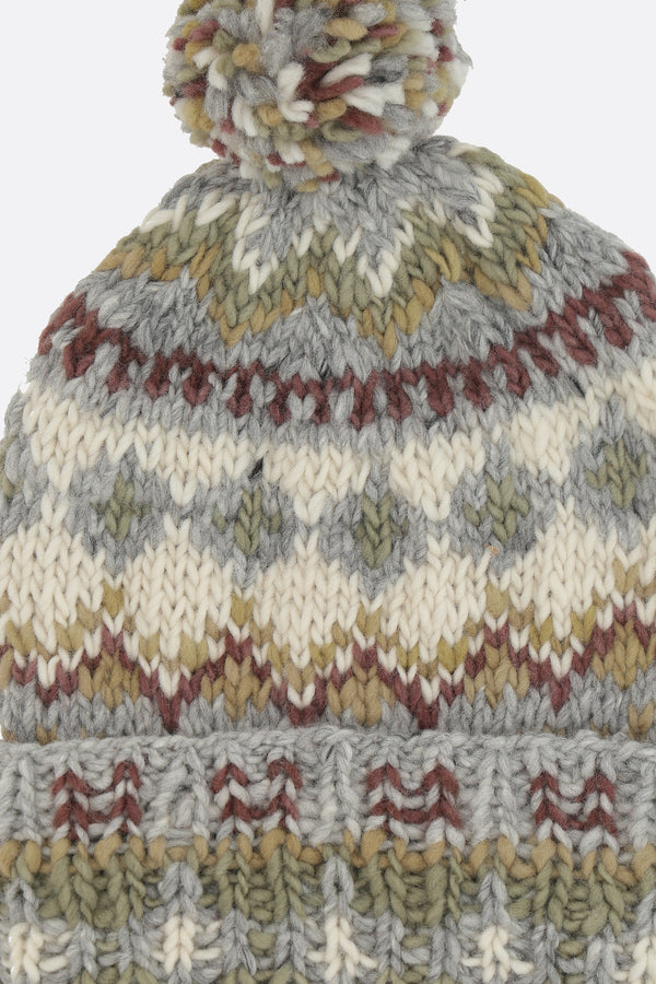 Chamula beanie handknitted in wool with Fair Isle pattern #3. Features a folded brim and a matching pom-pom.