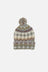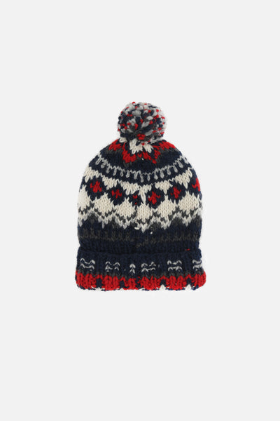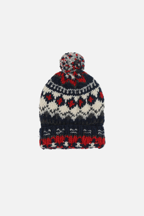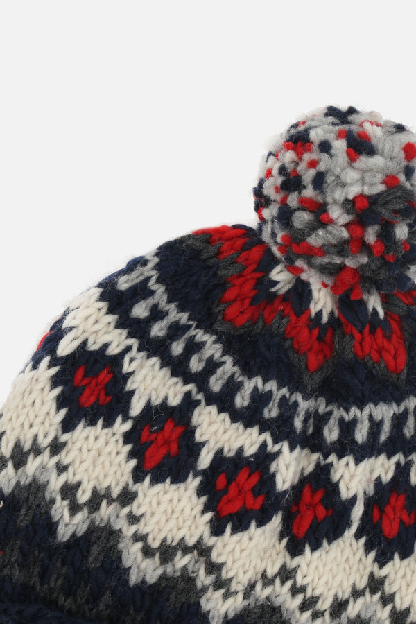 Chamula beanie handknitted in wool with Fair Isle pattern #3. Features a folded brim and a matching pom-pom.