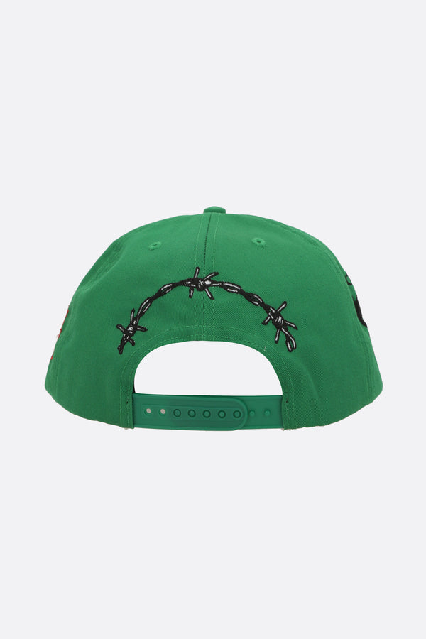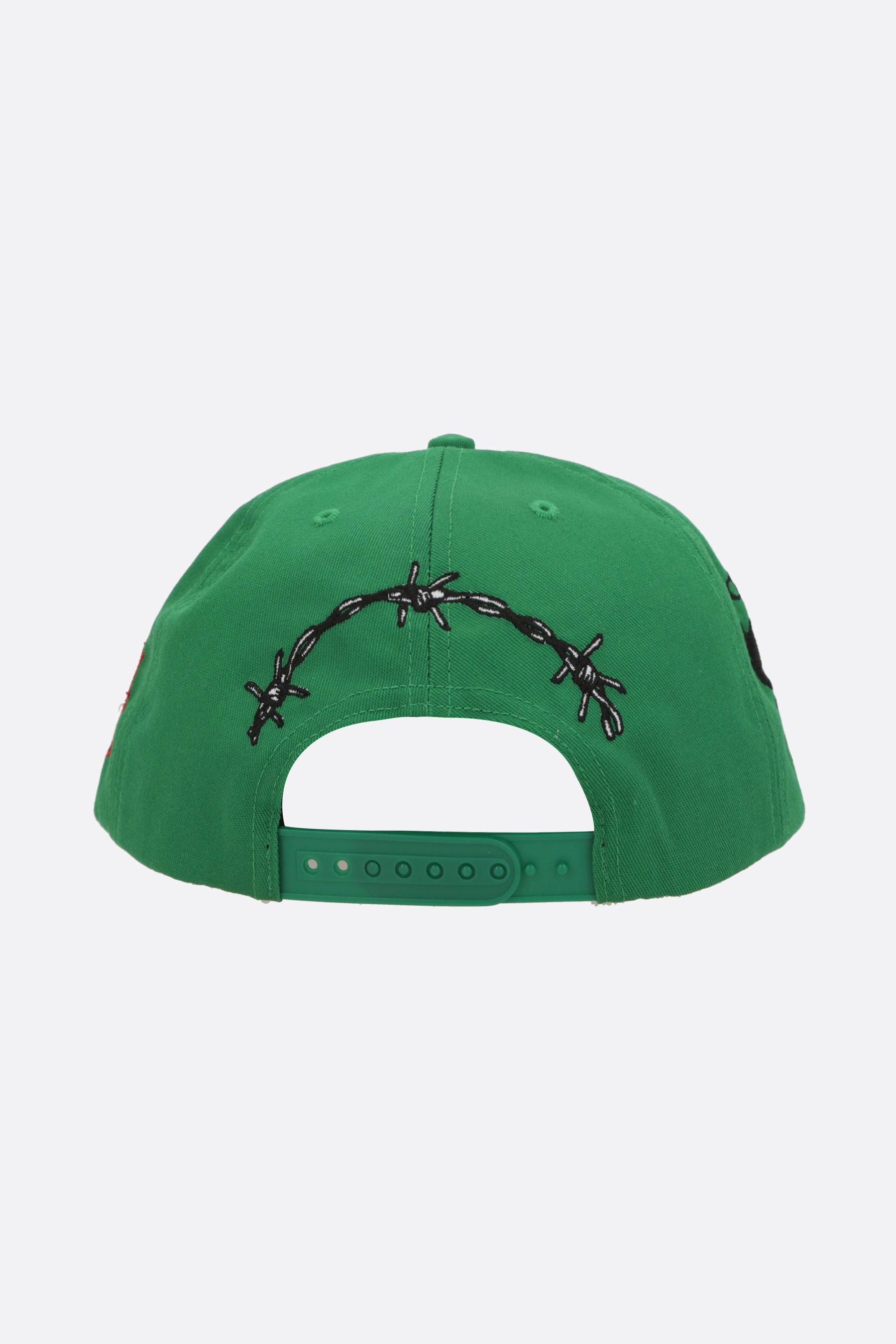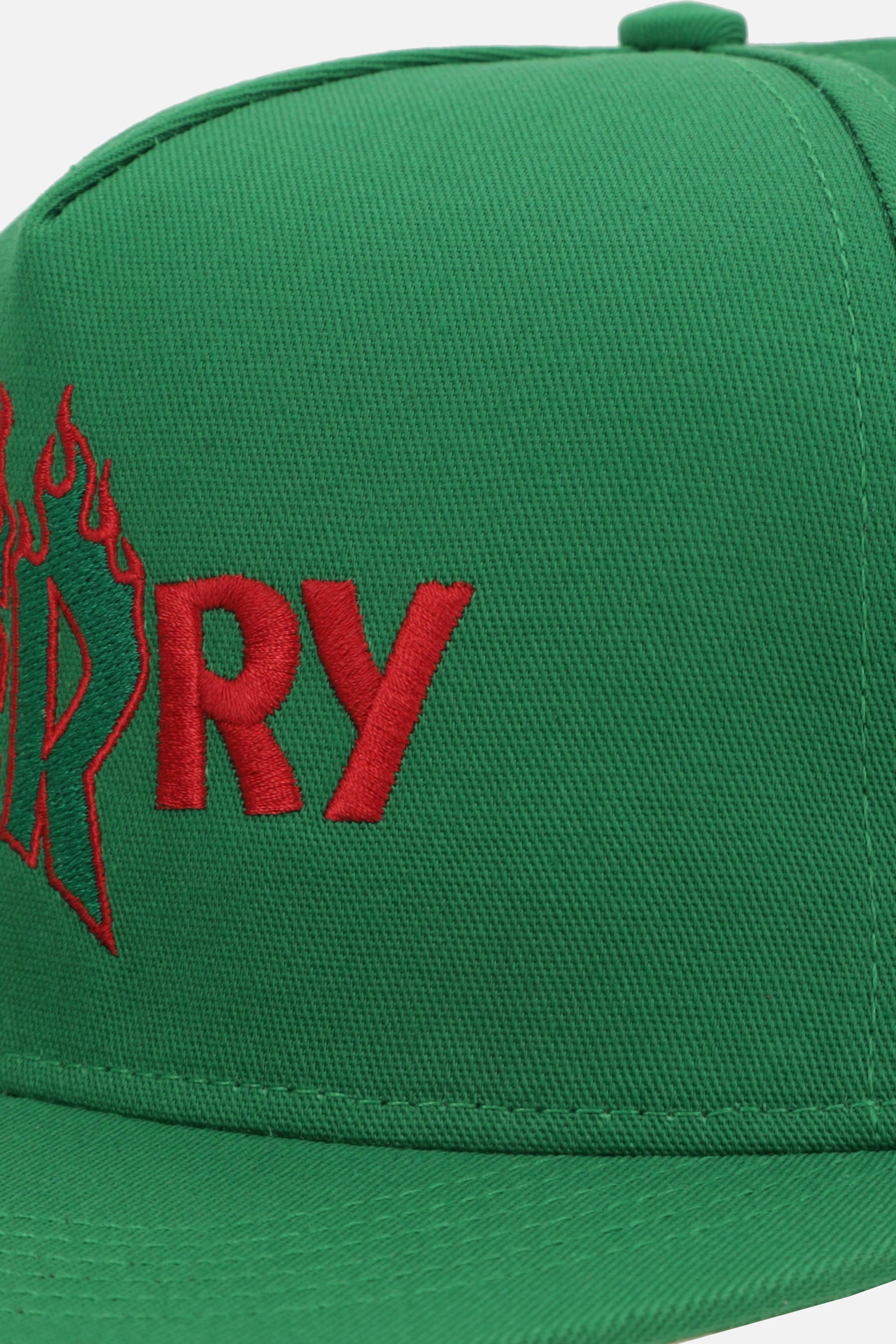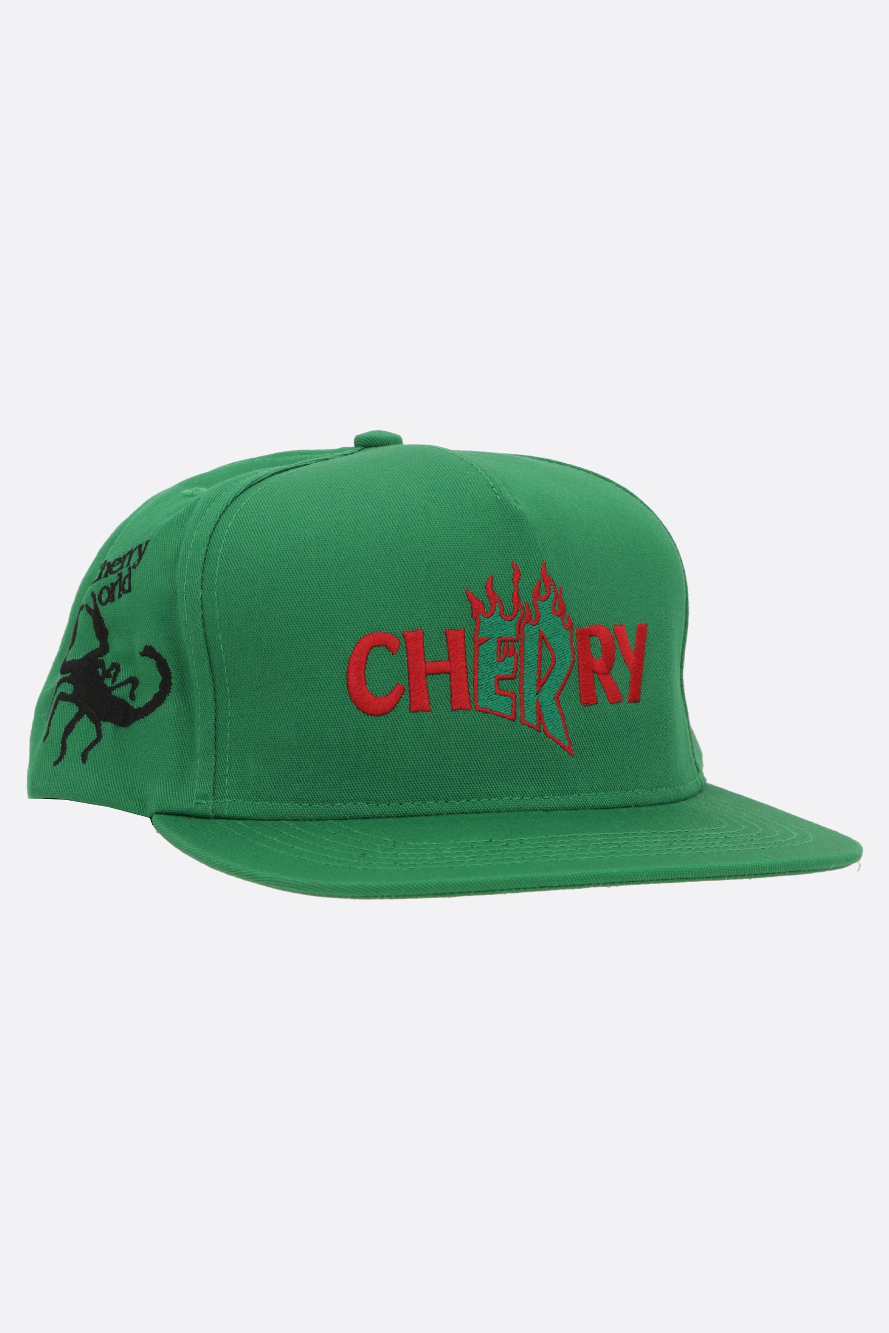 Cherry World cap crafted from green cotton gabardine, featuring "Cherry" embroidery and an adjustable back closure.
