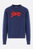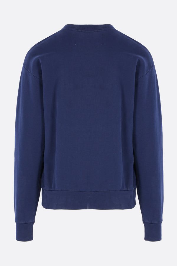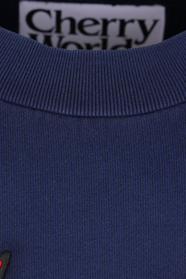 Cherry World sweatshirt crafted from blue cotton jersey, featuring a textured Cherry patch on the chest. It has a crew neckline, long sleeves, and ribbed trims, completed with a Home Grown patch on one sleeve.