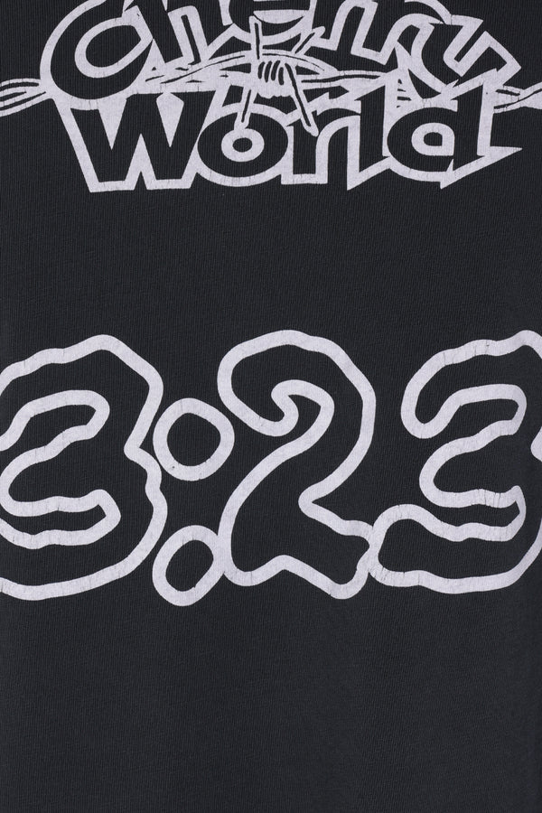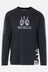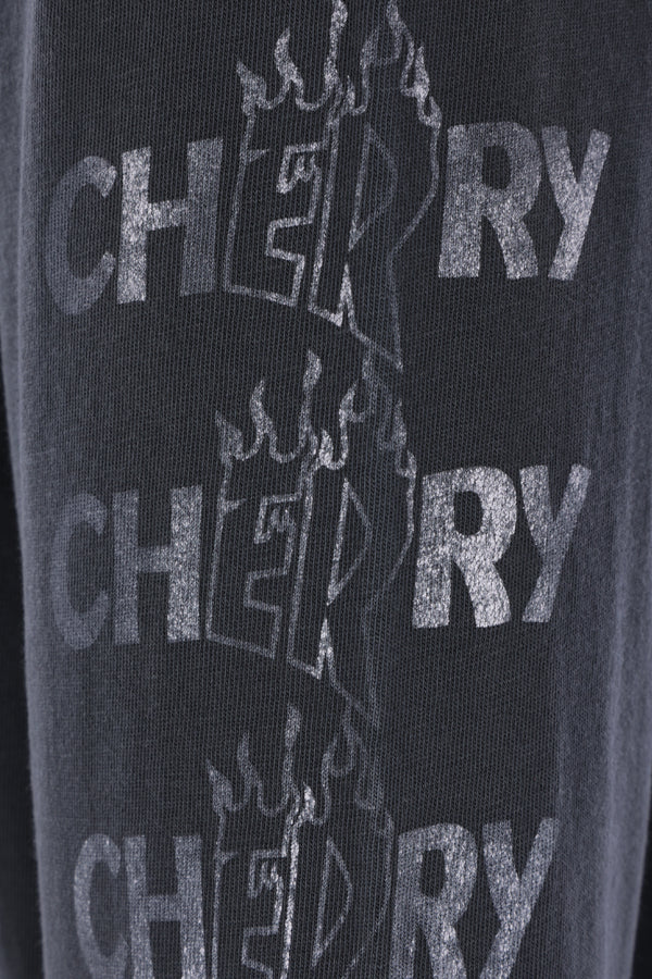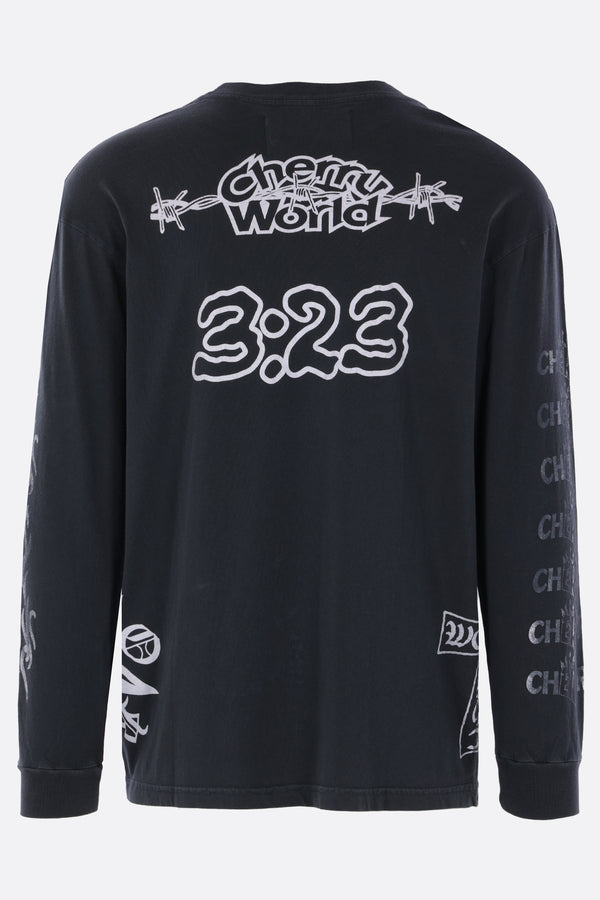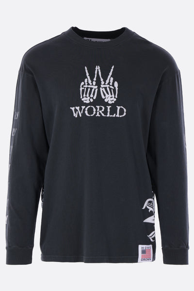 Cherry World T-shirt crafted from faded black cotton jersey, featuring Skeleton prints in multiple areas. Designed with a crew neckline, long sleeves, and a straight hem finished with a Home Grown patch.