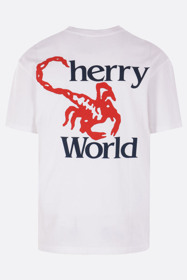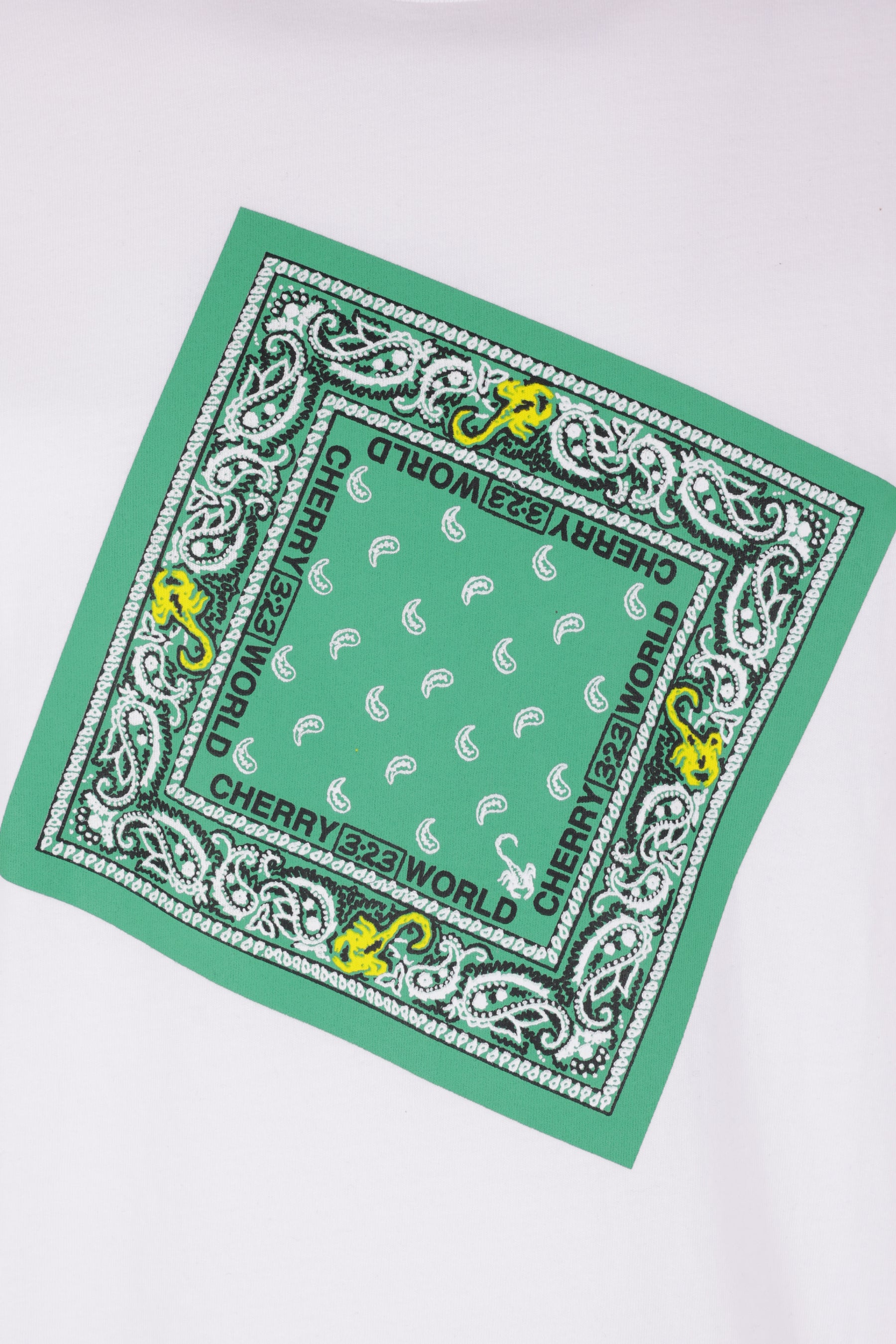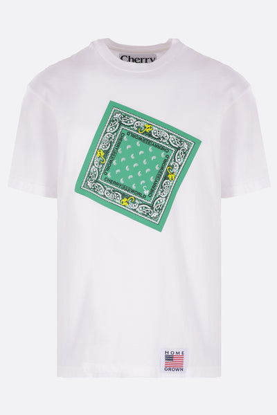 Cherry World t-shirt crafted from white cotton jersey, featuring a Bandana print on the front and a logo print on the back. It has a crew neckline, short sleeves, and a straight hem with a Home Grown patch.