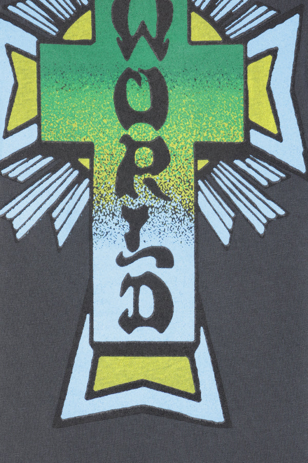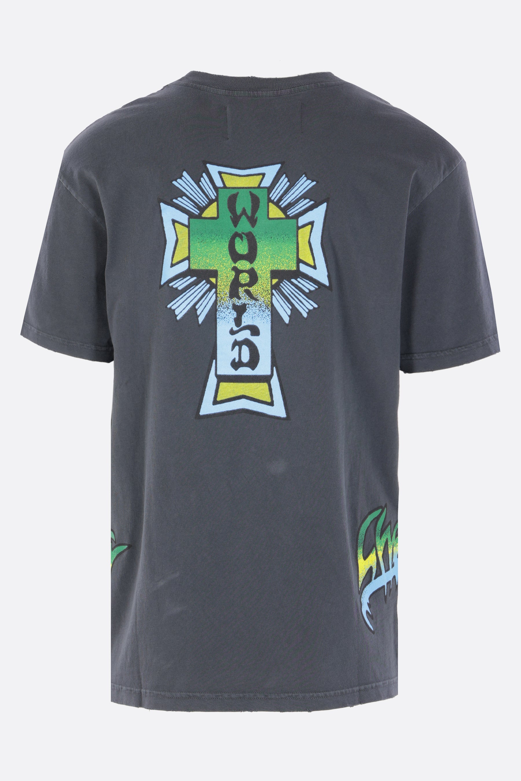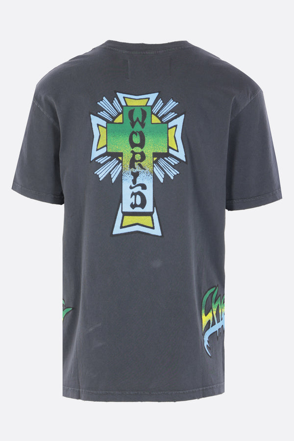 Cherry World t-shirt crafted from washed black cotton jersey with a vintage effect, featuring logo prints in multiple areas. It has a crew neckline, short sleeves, and a straight hem with a Home Grown patch.