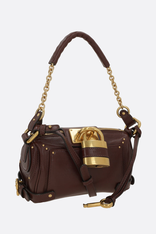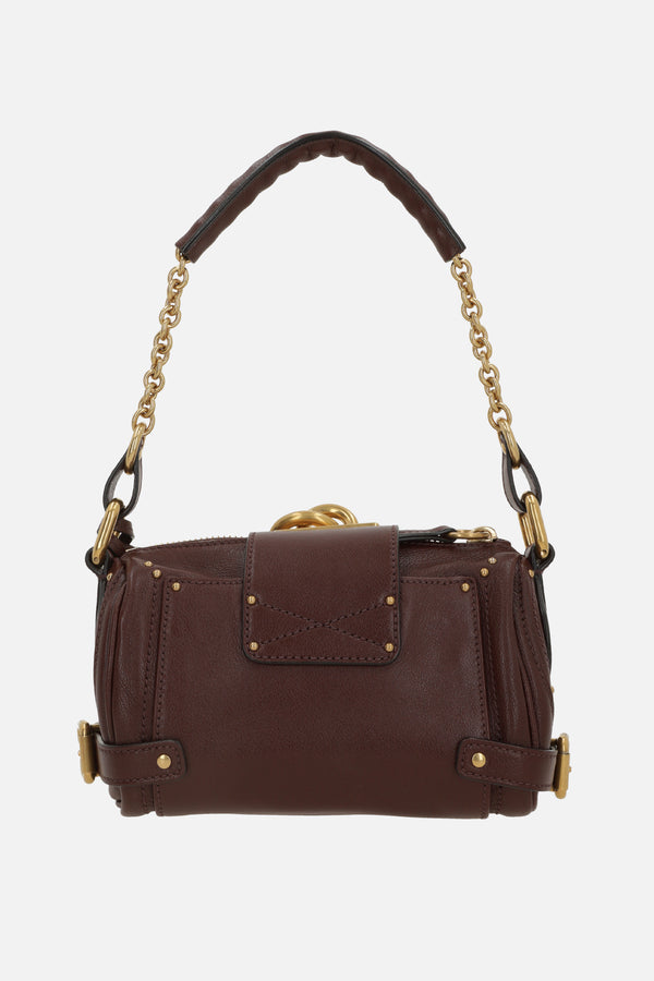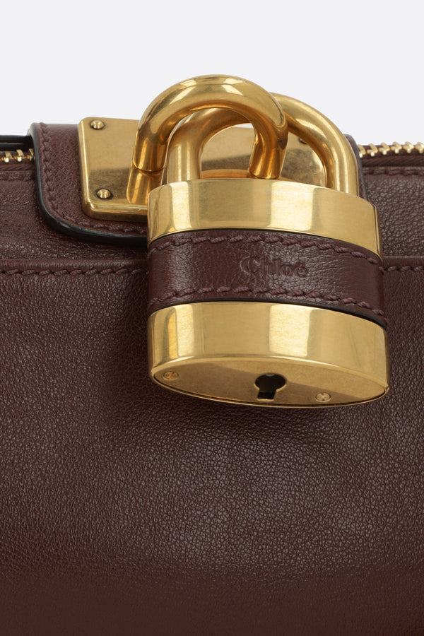 Chain bag by Chloé crafted from grained burnt brown leather. Featuring antique gold-tone hardware, zip closure, a chain shoulder strap, and an adjustable/removable crossbody strap. The interior is lined in black canvas. The design is completed with two external pockets, a decorative padlock with embossed logo, and side straps.