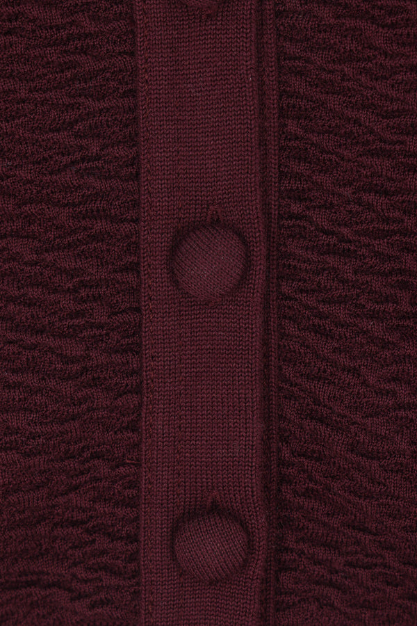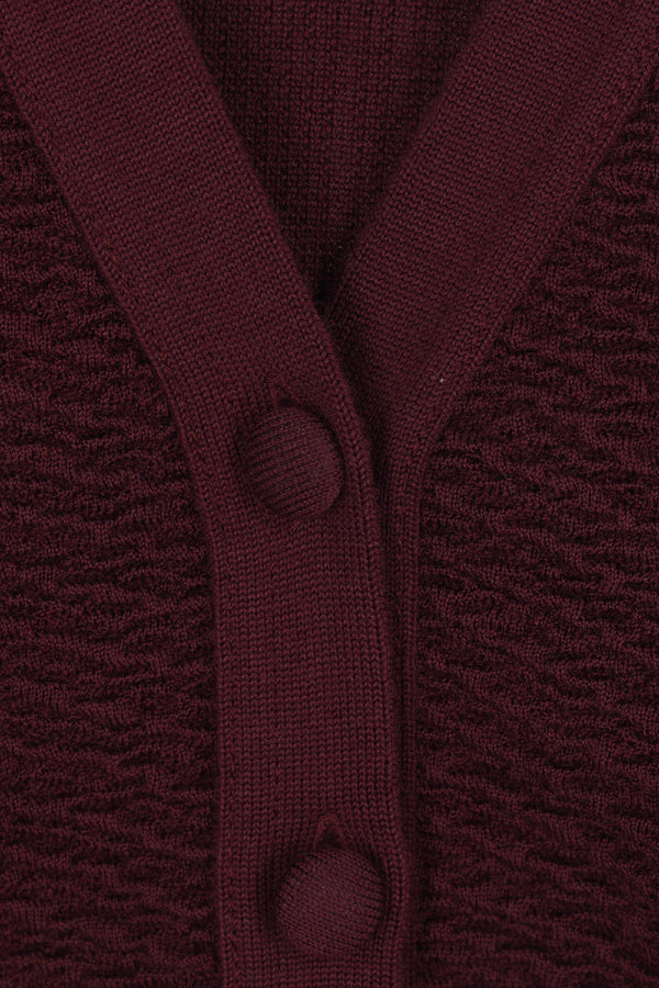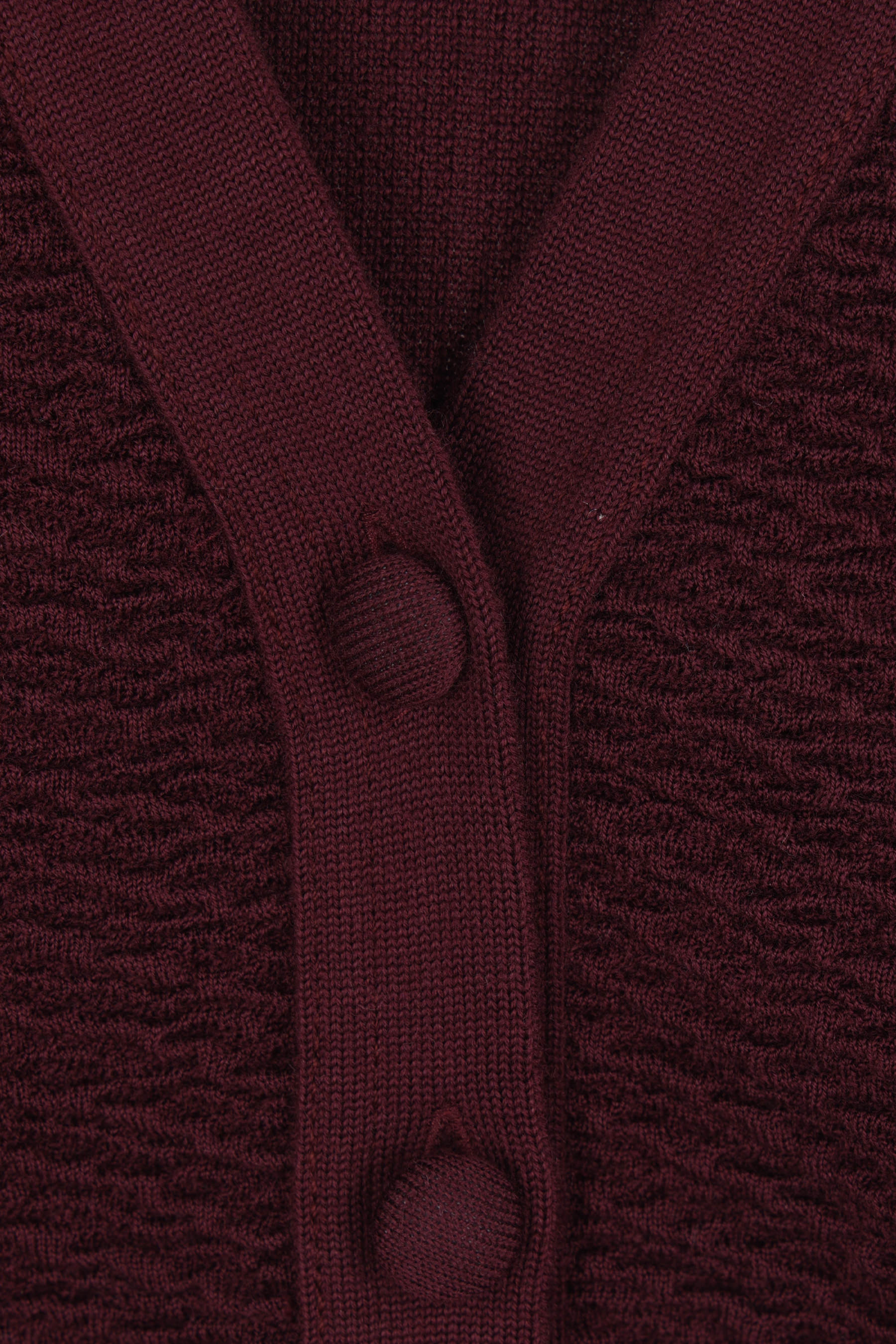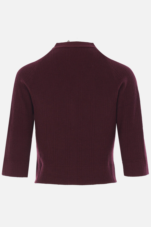 Chloé cardigan made of purple wool knit. Features a V-neckline, front tone-on-tone button closure, 3/4 sleeves, ribbed edges, and a straight hem.