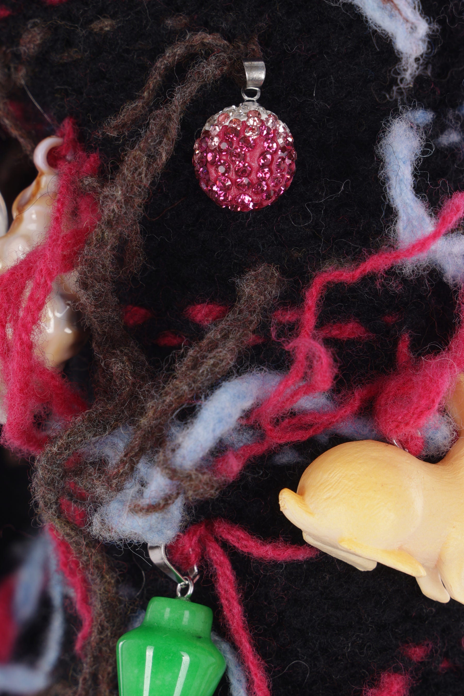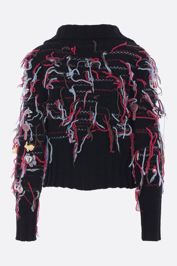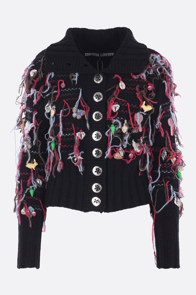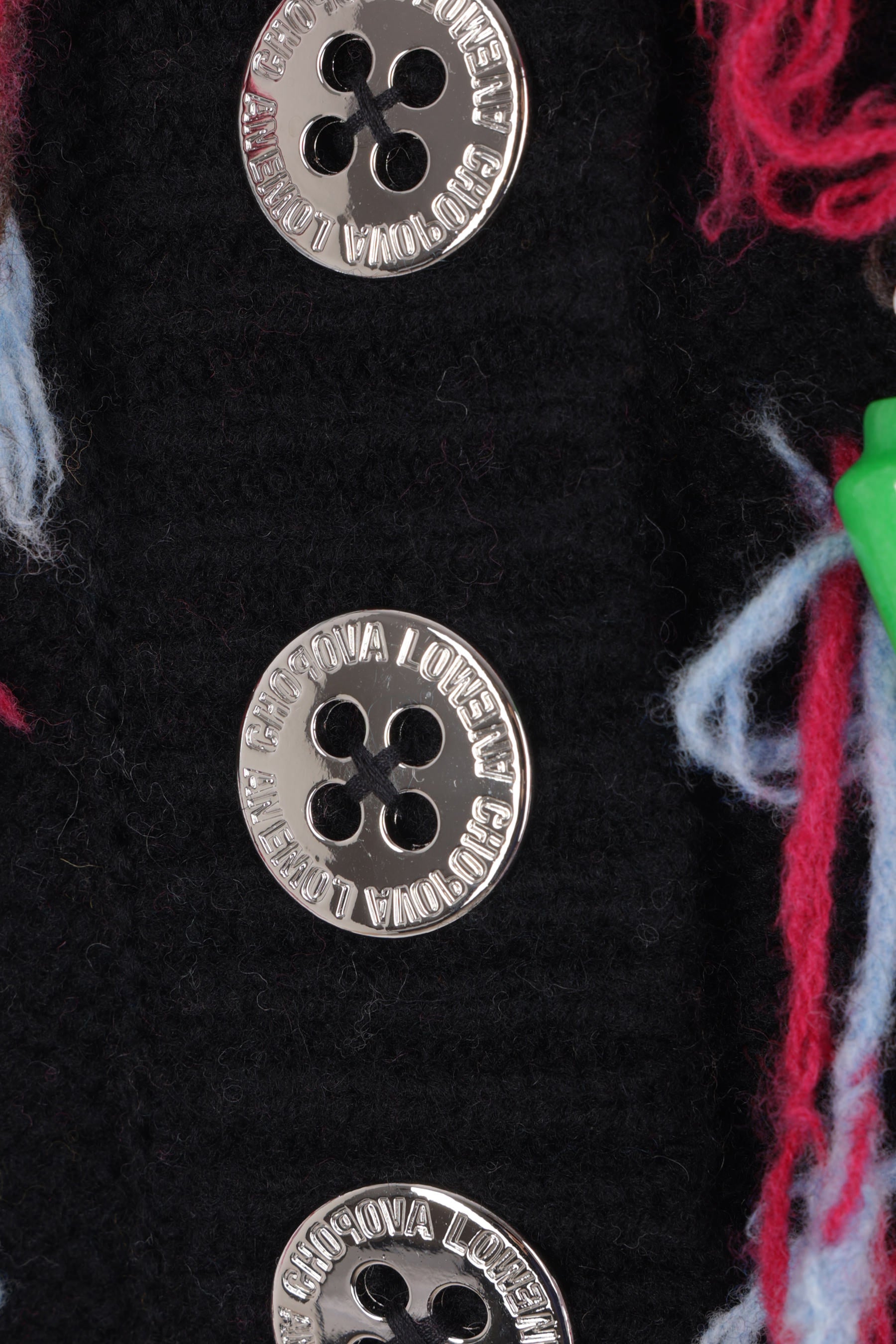 Chopova Lowena cardigan crafted from black wool felt with intertwined multicolored threads and assorted-shaped charms. Featuring a high collar, front closure with logo buttons, long sleeves, and ribbed trims. Each product is a one-of-a-kind piece; charms may vary.