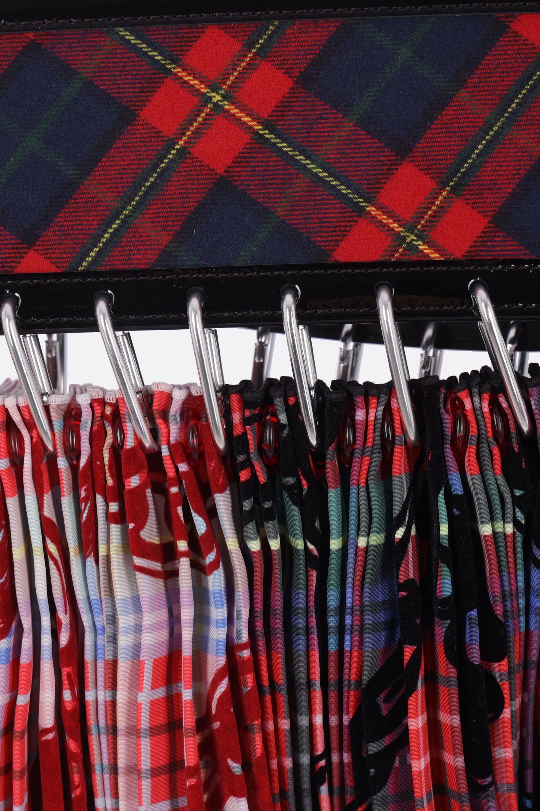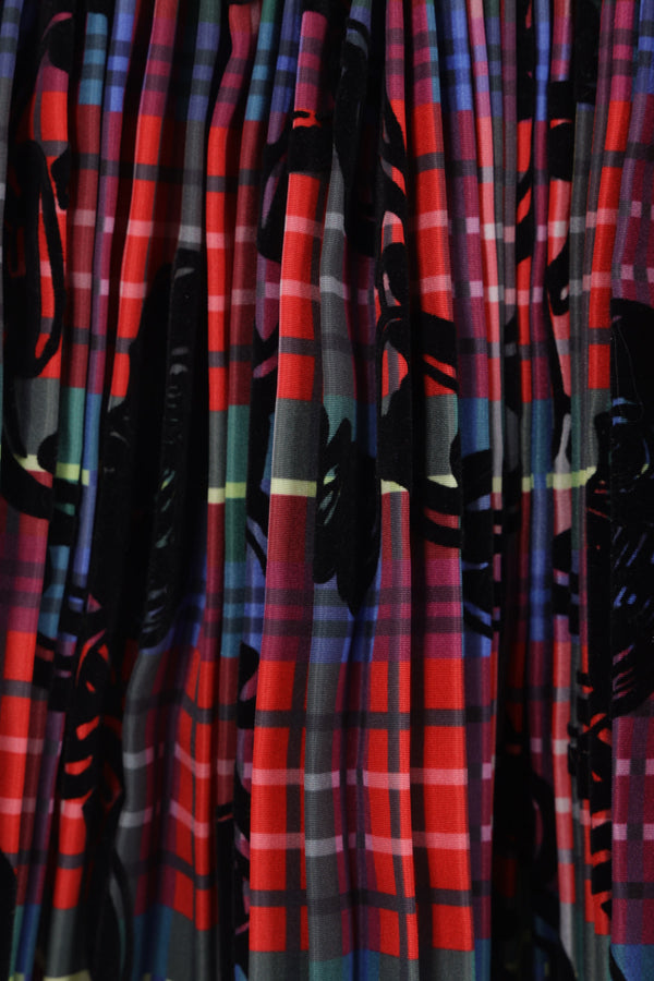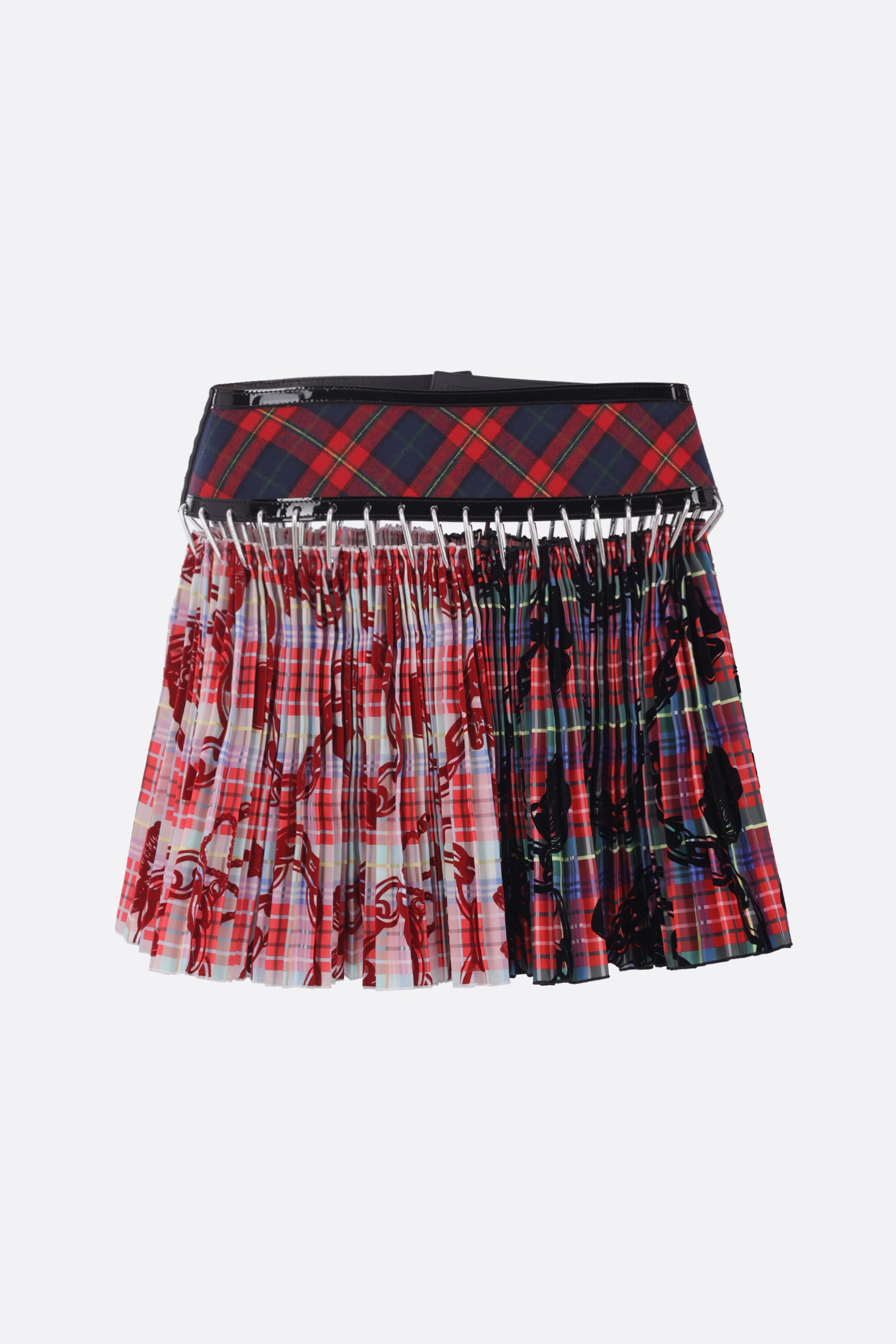 Chopova Lowena mini skirt crafted from pleated tartan nylon taffeta with wool and patent leather belt linked by silver-tone metal carabiners. Featuring an adjustable butterfly buckle waist closure and unlined interior.