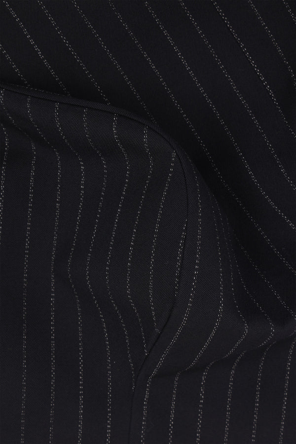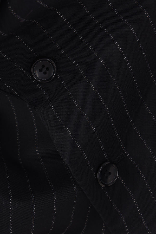Comme des Garçons asymmetric jacket made from black pinstriped wool. Features a classic notch lapel, asymmetric button closure, flap pockets, long sleeves with buttoned cuffs, asymmetric hem with side vents, and lined interior.