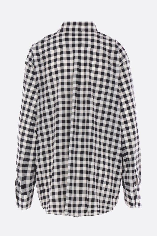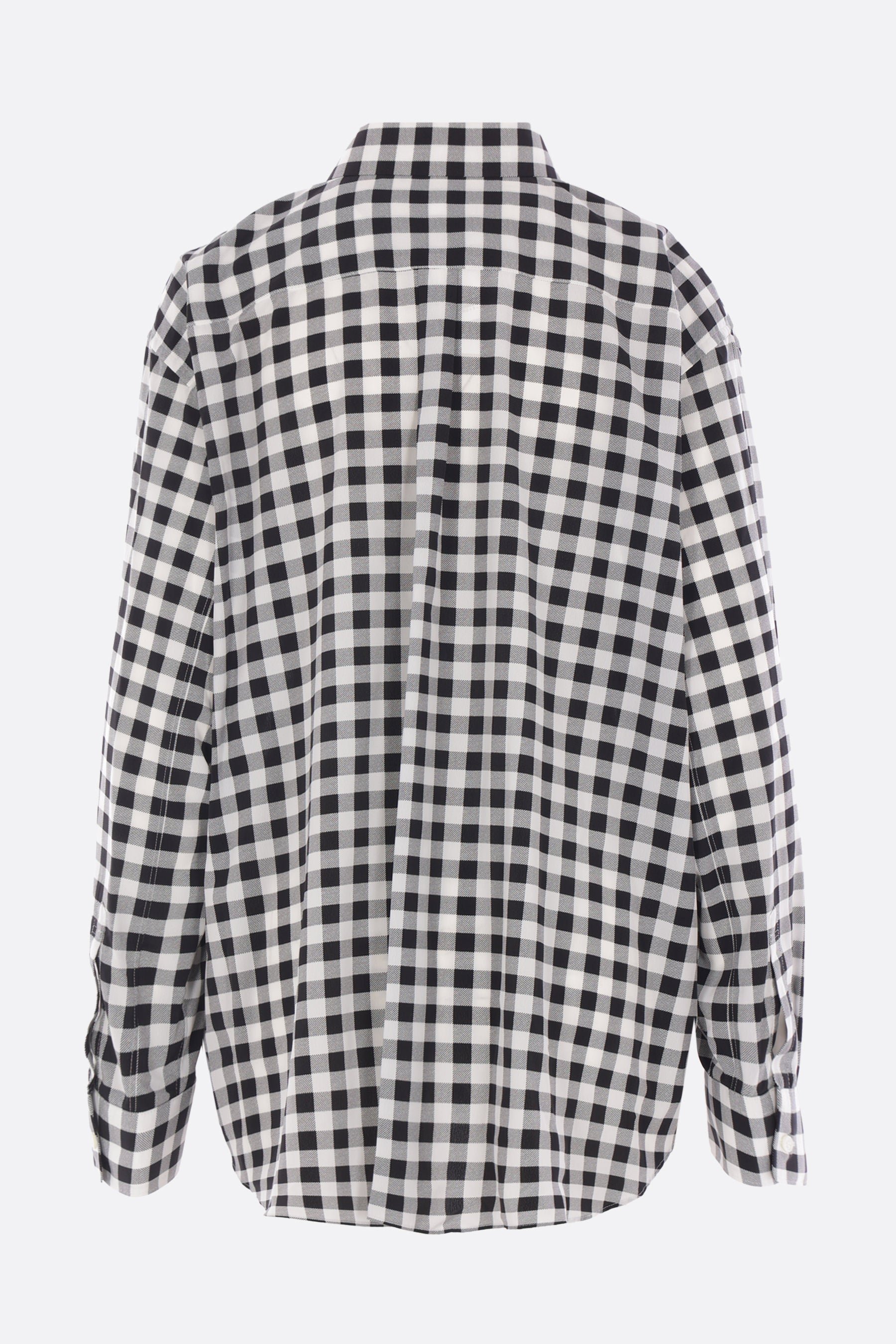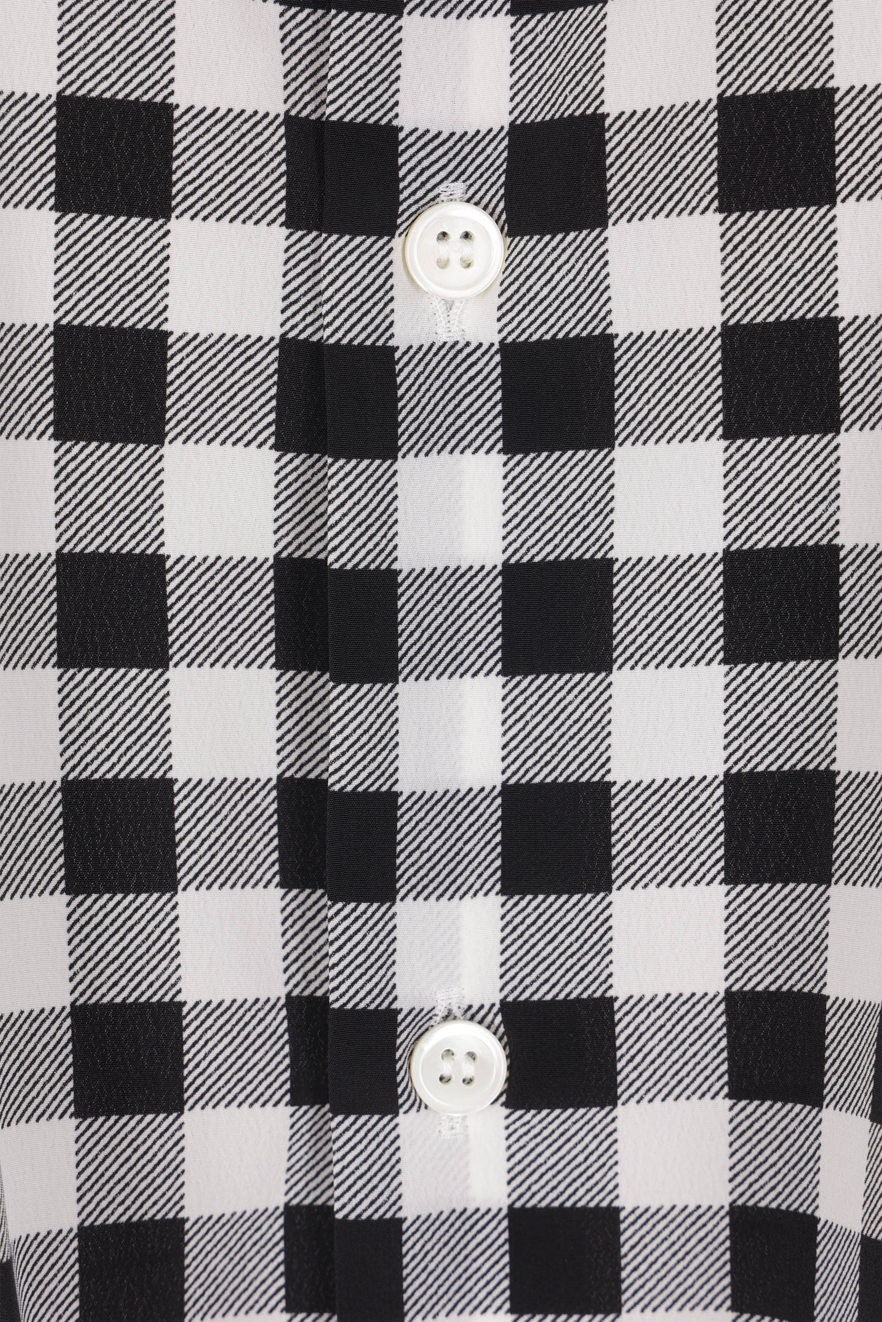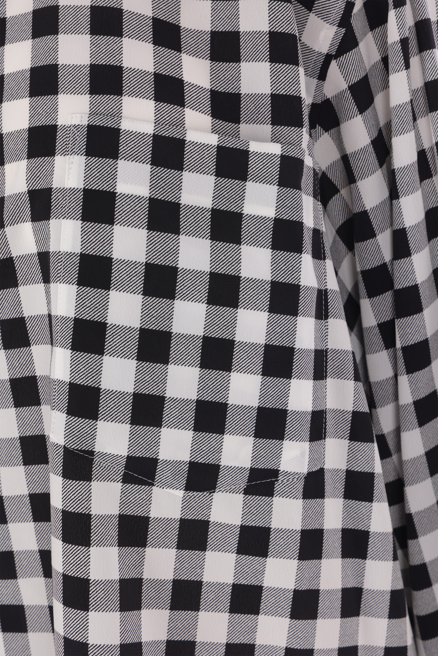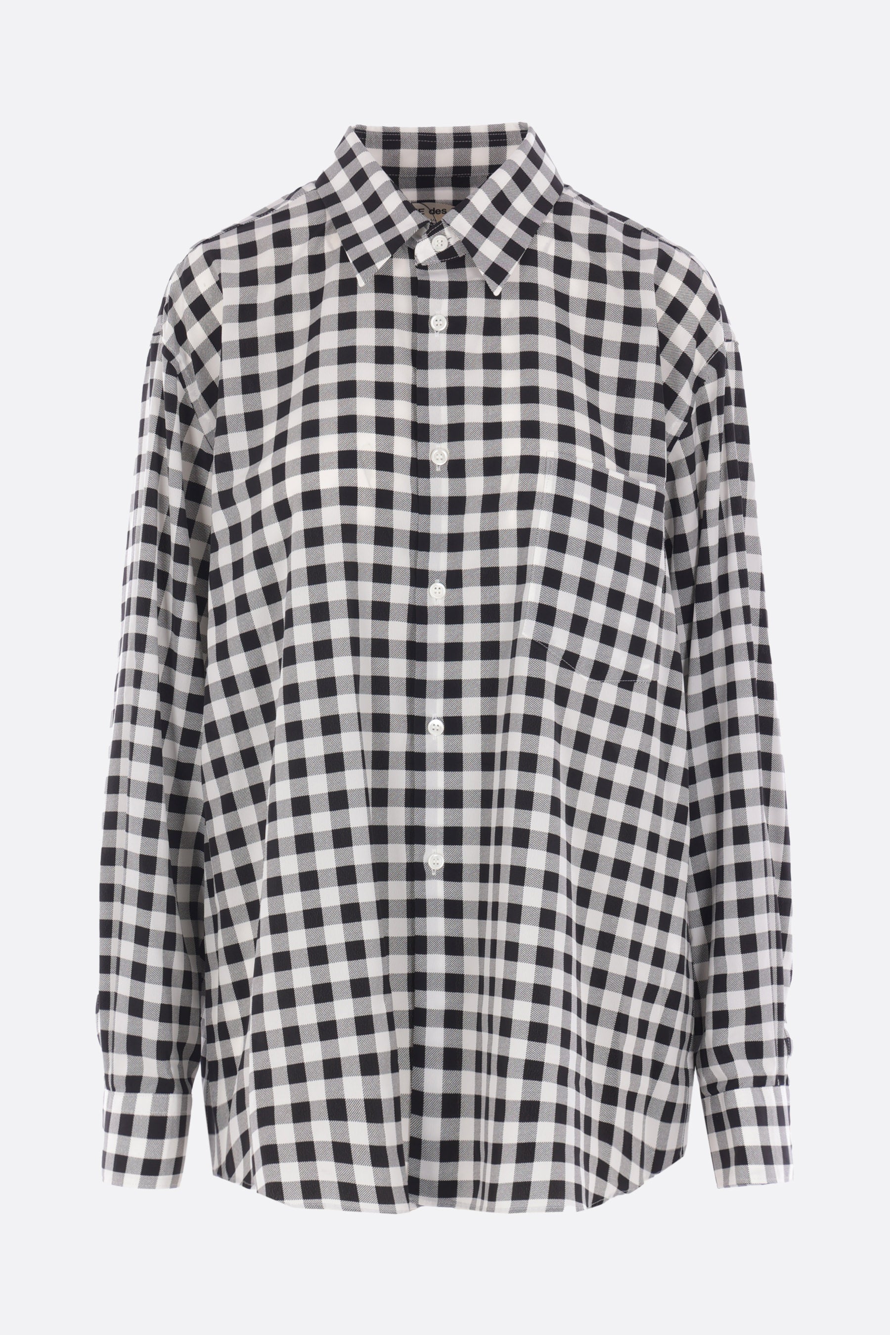 Comme des Garçons shirt made from black and white checked twill. Features a classic collar, front button closure, chest patch pocket, long sleeves with buttoned cuffs, and rounded hem.