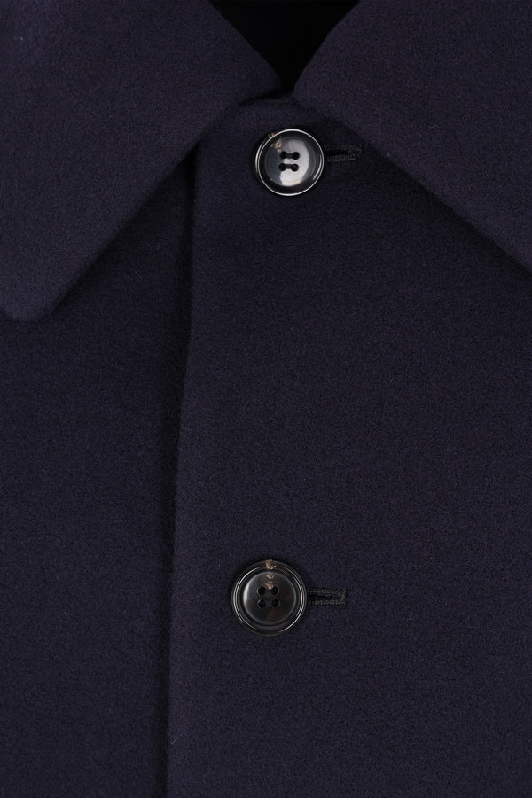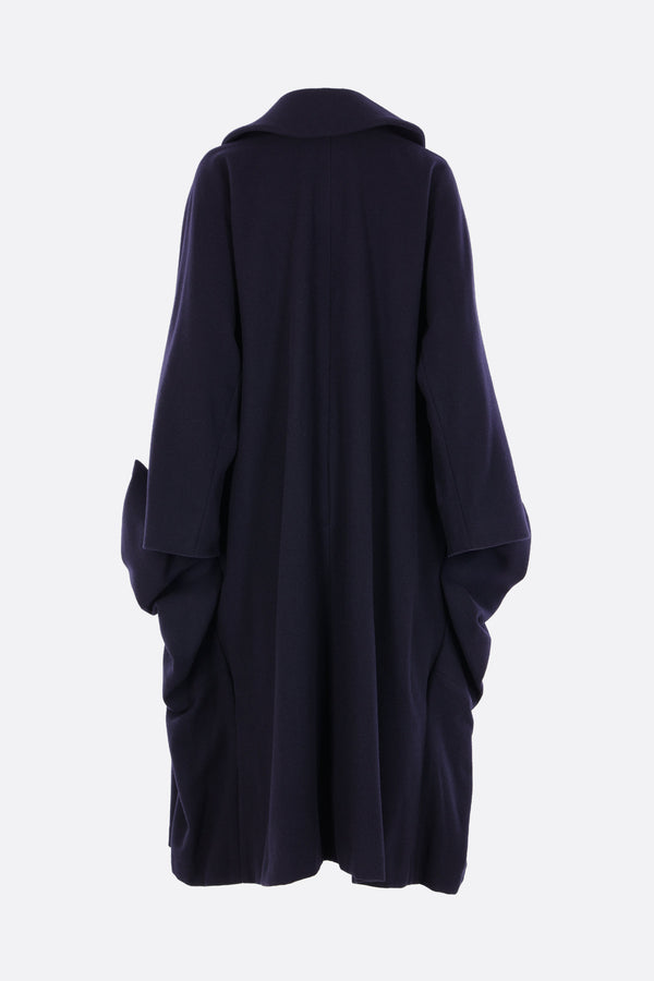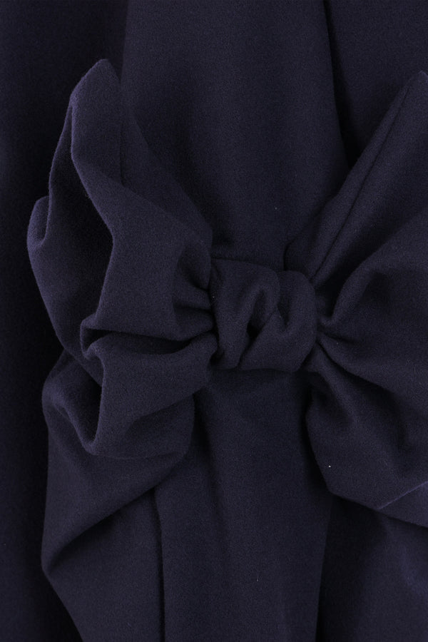 Comme des Garçons Comme des Garçons oversized coat crafted from blue wool blend. Featuring an oversized collar, front button closure, oversized bows, invisible side pockets, long sleeves, straight hem, and lined interior.
