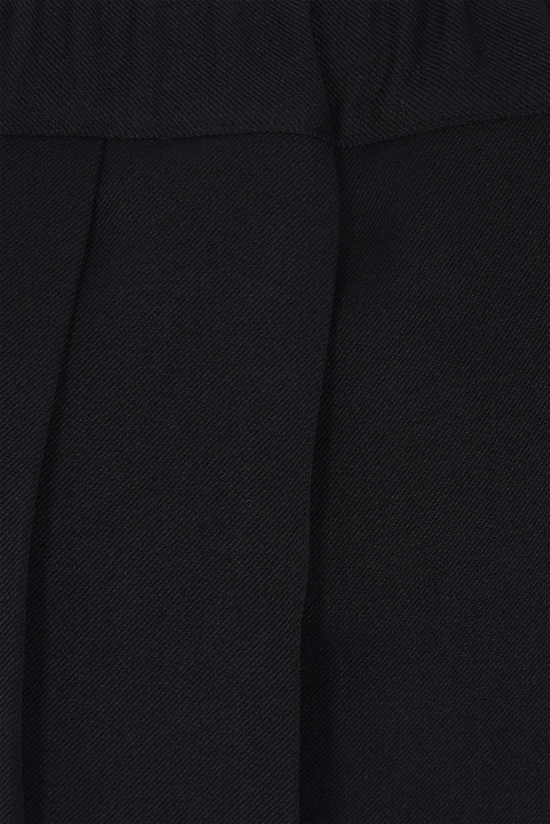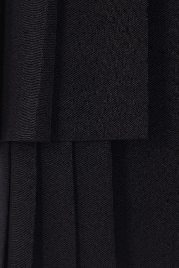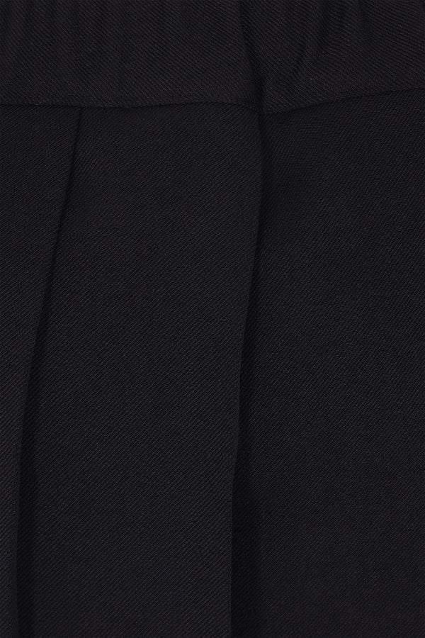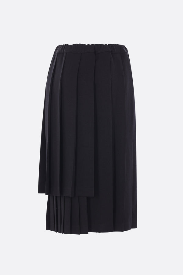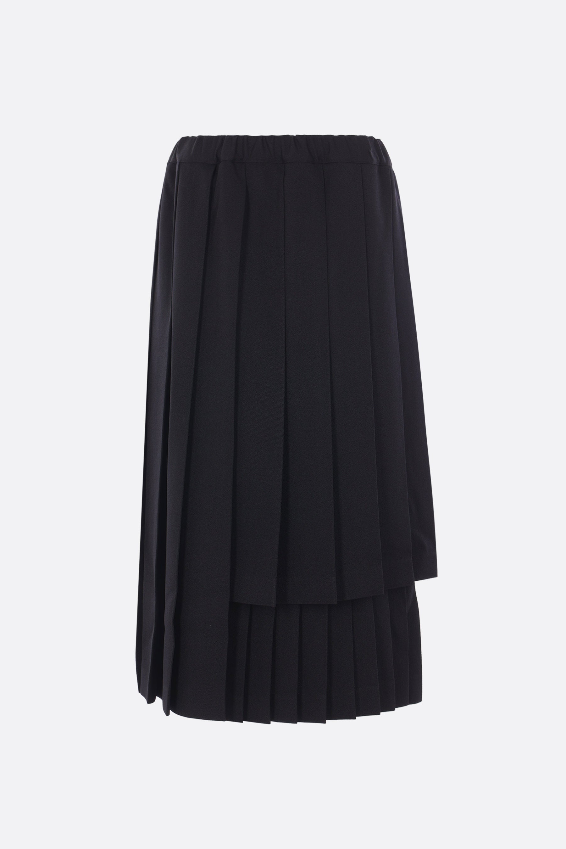Comme des Garçons Comme des Garçons midi skirt made from black drill with asymmetric pleated design. Features elasticated waistband with drawstring, hidden side pockets, asymmetric hem, and lined interior.