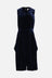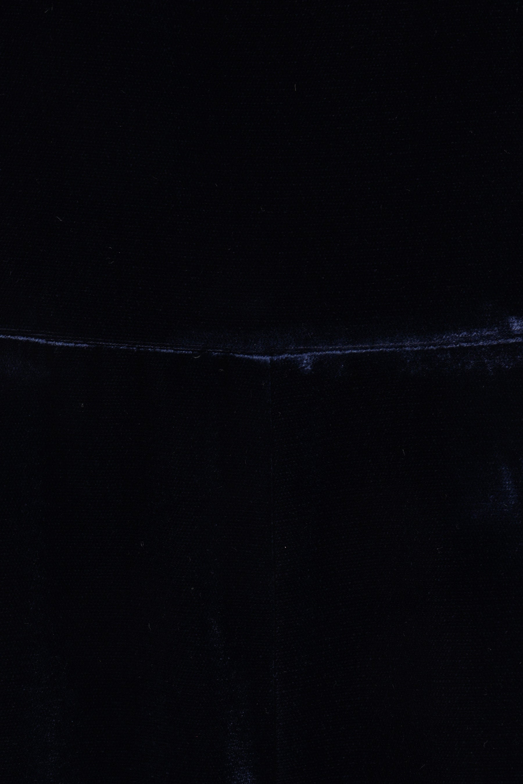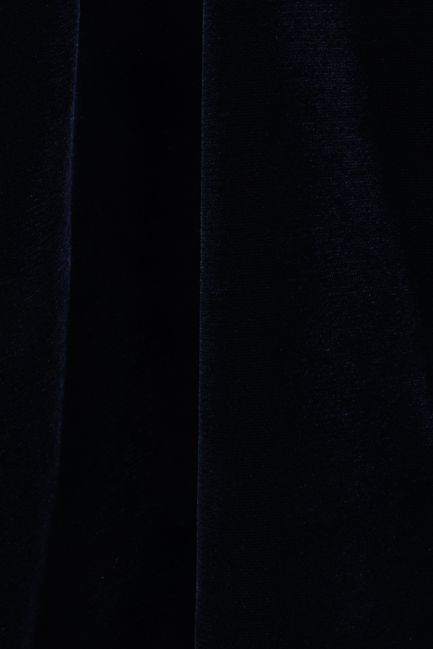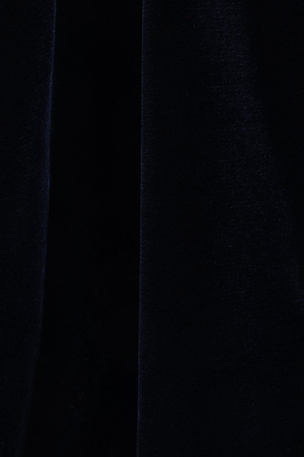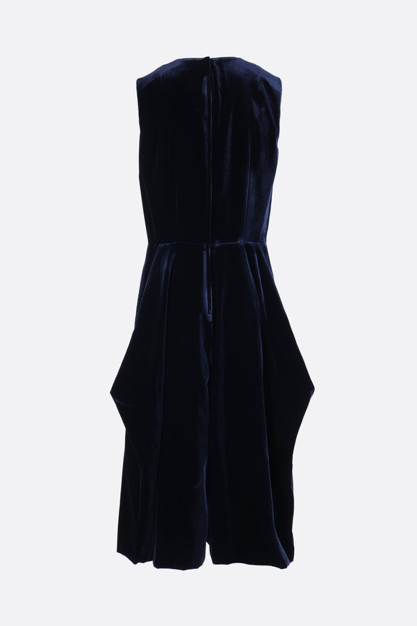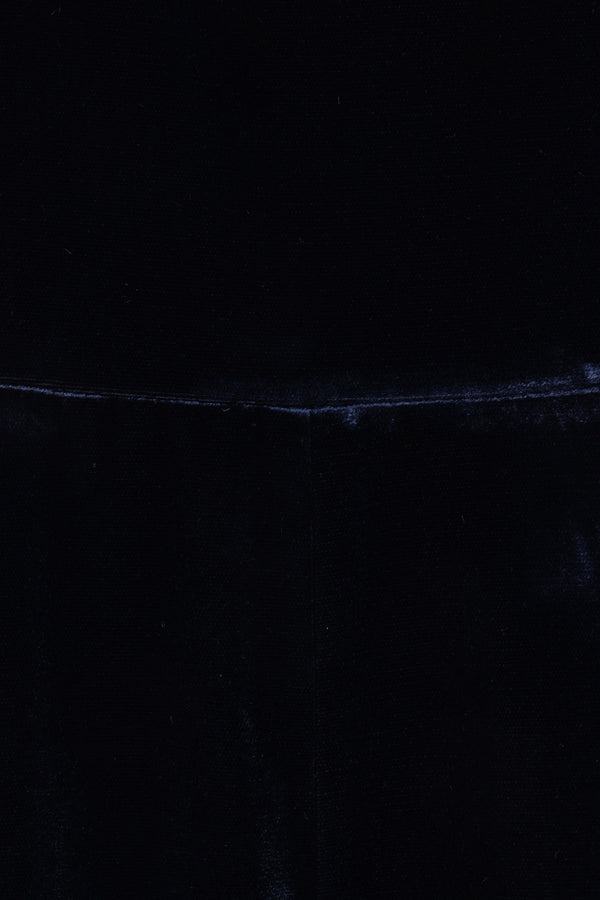Comme des Garçons sleeveless jumpsuit crafted from dark blue velvet. Features a round neckline, back invisible zip closure, side invisible pockets, wide-leg trousers, and a lined interior.