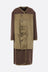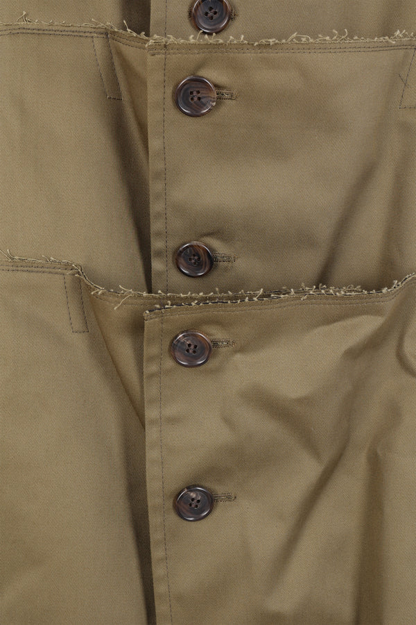 Comme des Garçons Homme Plus oversized deconstructed coat crafted from dark khaki wool felt with raw-cut cotton gabardine panels. Featuring a V-neckline, button closure, side pockets, long sleeves, asymmetric hem, central back vent, and unlined interior.