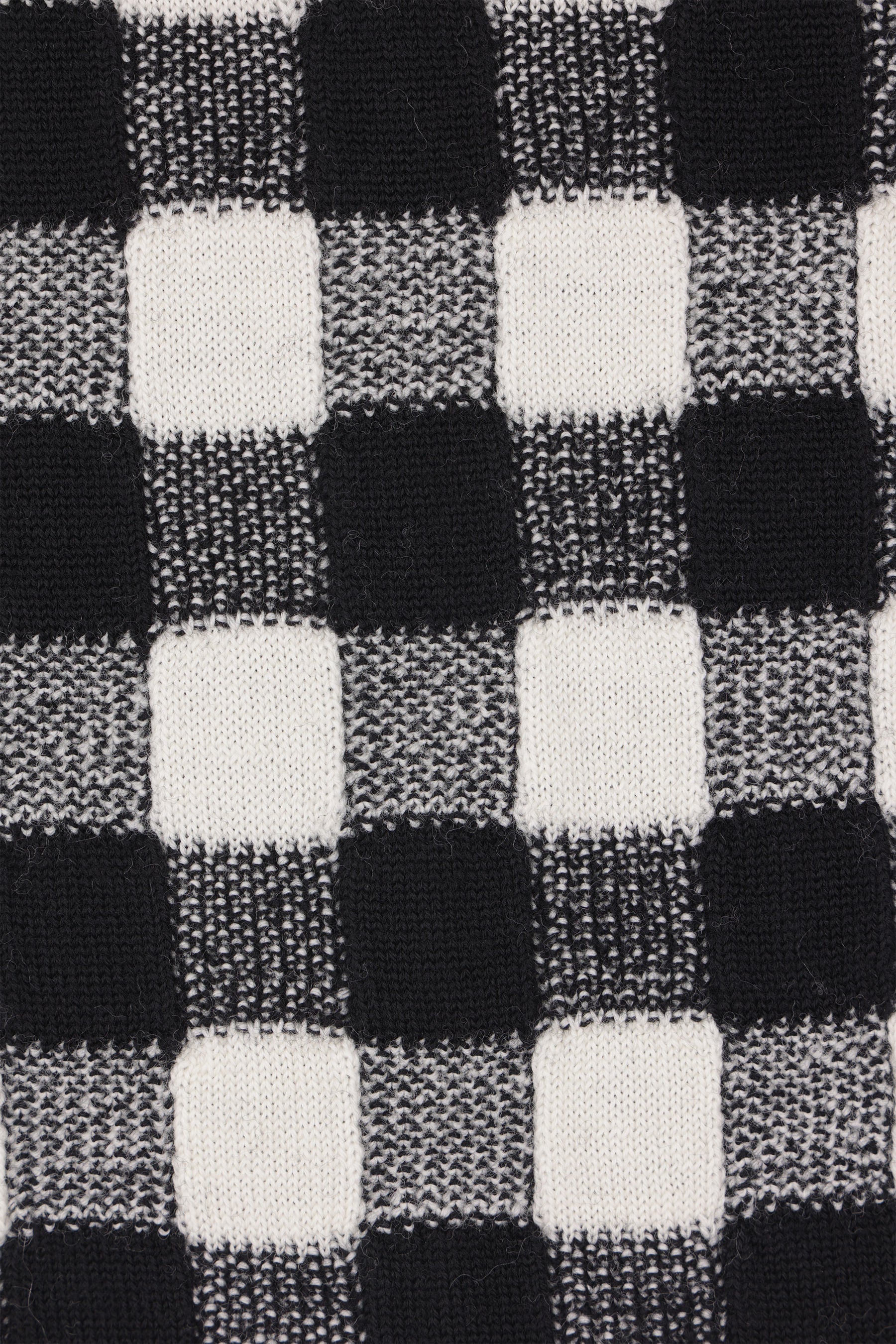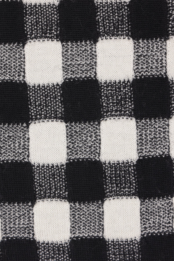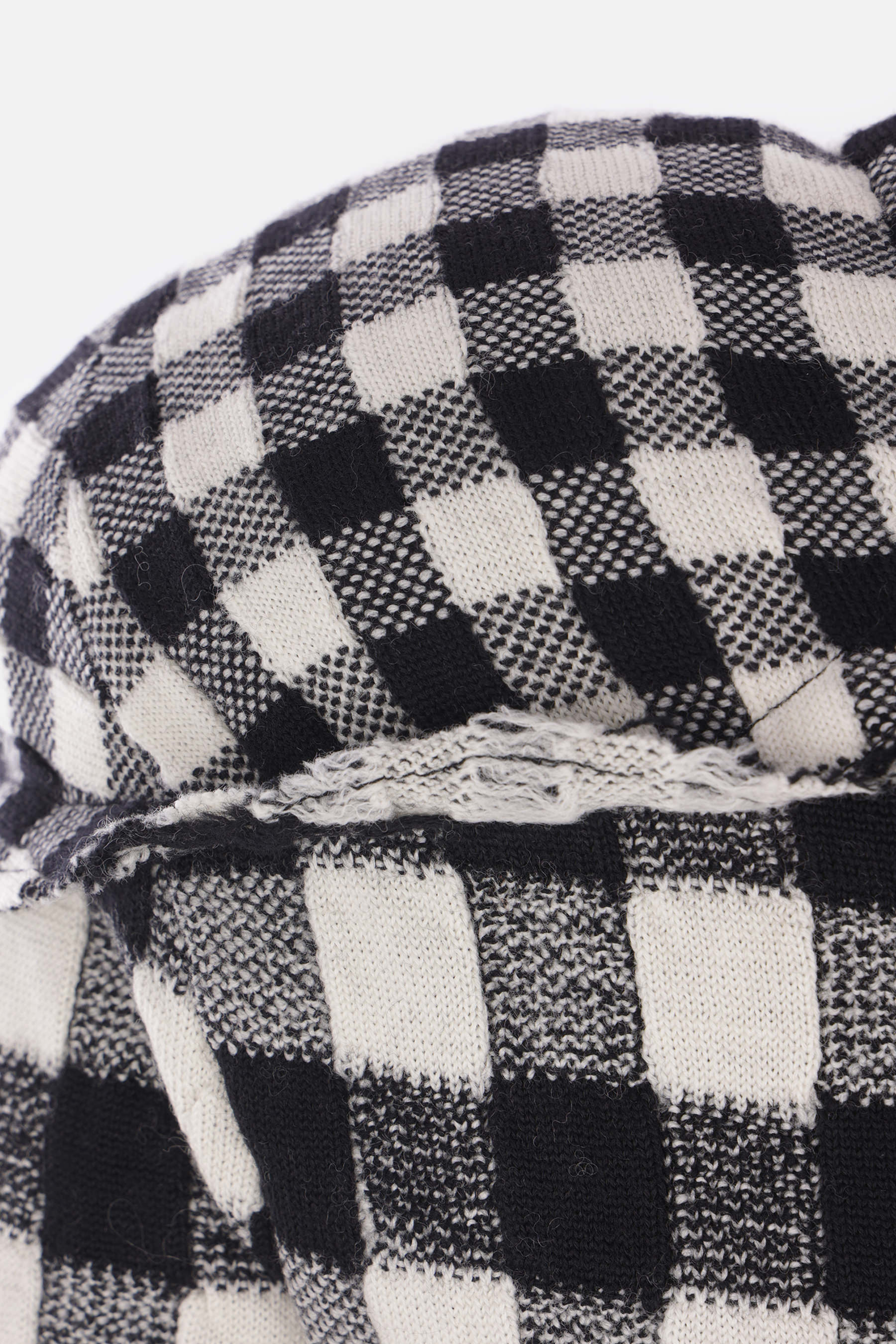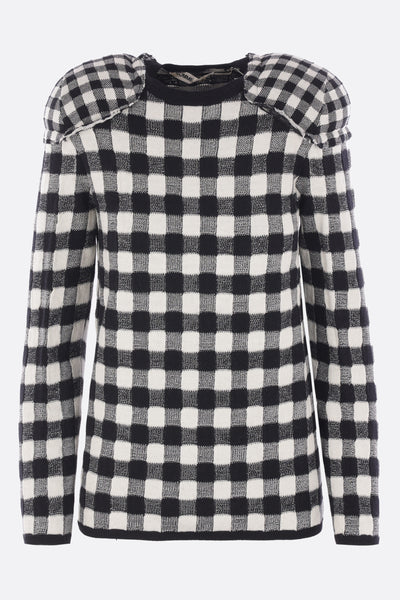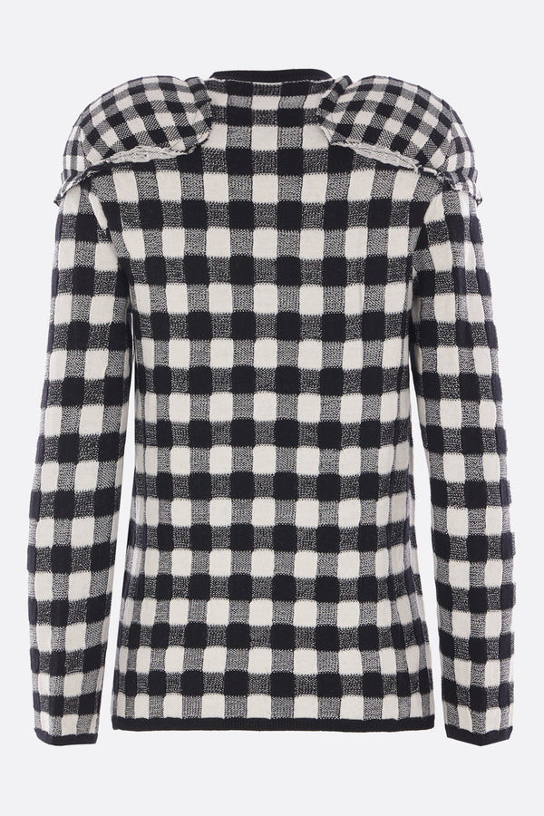 Comme des Garçons sweater made from black and white checked wool jacquard knit. Features a crew neckline, oversized padded shoulders, long sleeves, and straight hem.