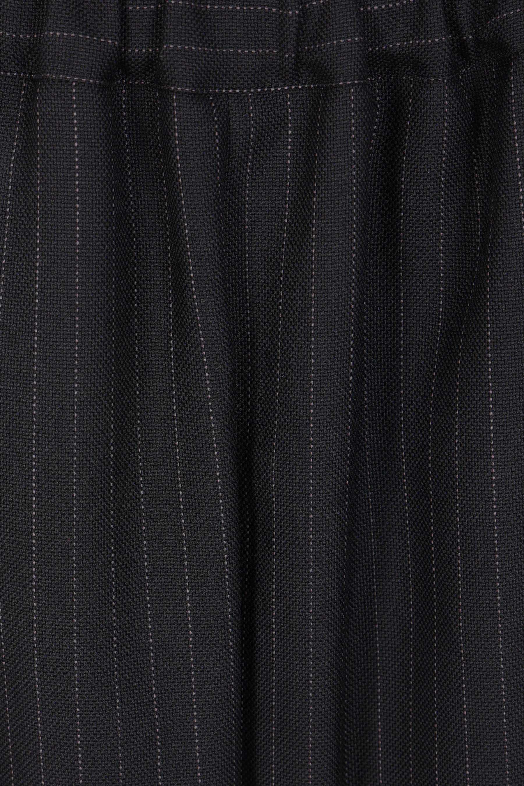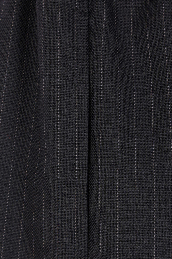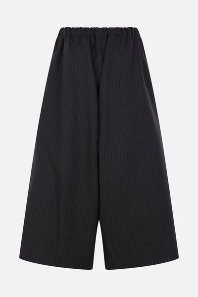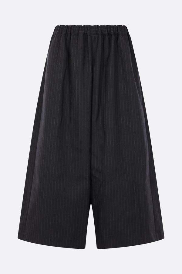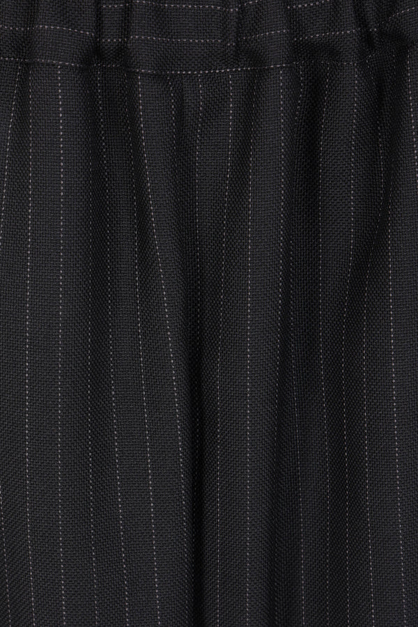 Comme des Garçons culotte trousers crafted from black wool canvas with a pinstripe pattern. They feature an elastic waistband with drawstring, hidden side pockets, and an unlined interior.