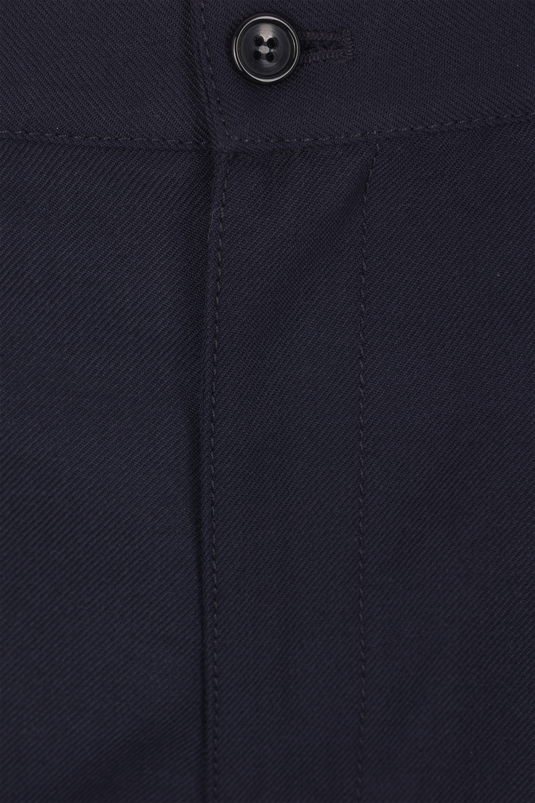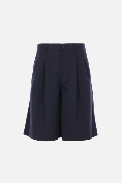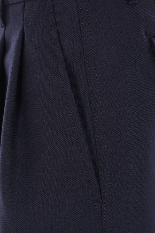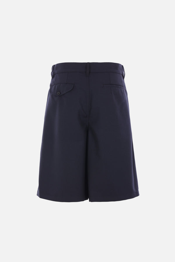 Comme des Garçons Shirt shorts made from blue wool-blend. Features front button and zip closure, belt loops, multiple pockets, double pleats, and unlined interior.