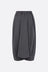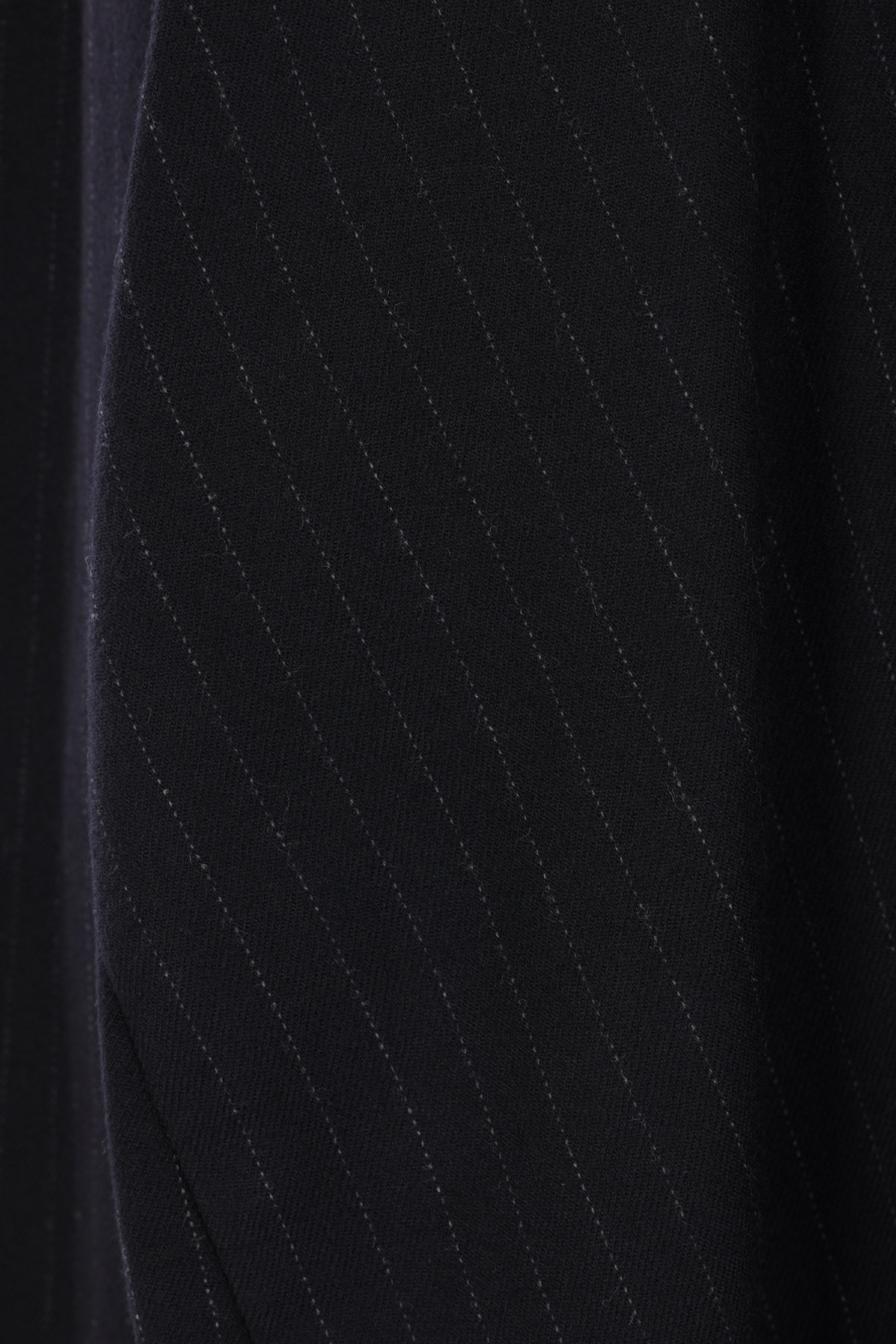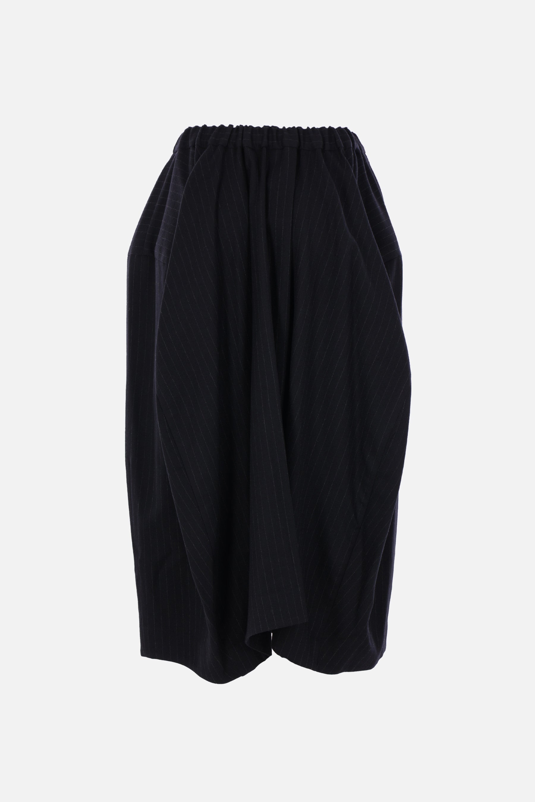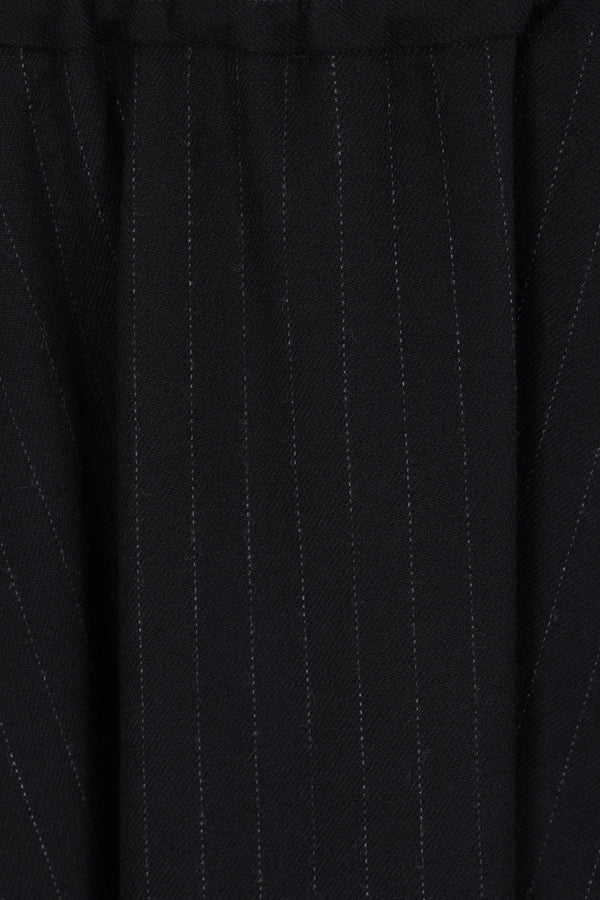 Comme des Garçons wide skirt crafted from black pinstriped wool. Features an elasticized waistband with drawstring, welt pockets, and an unlined interior.