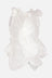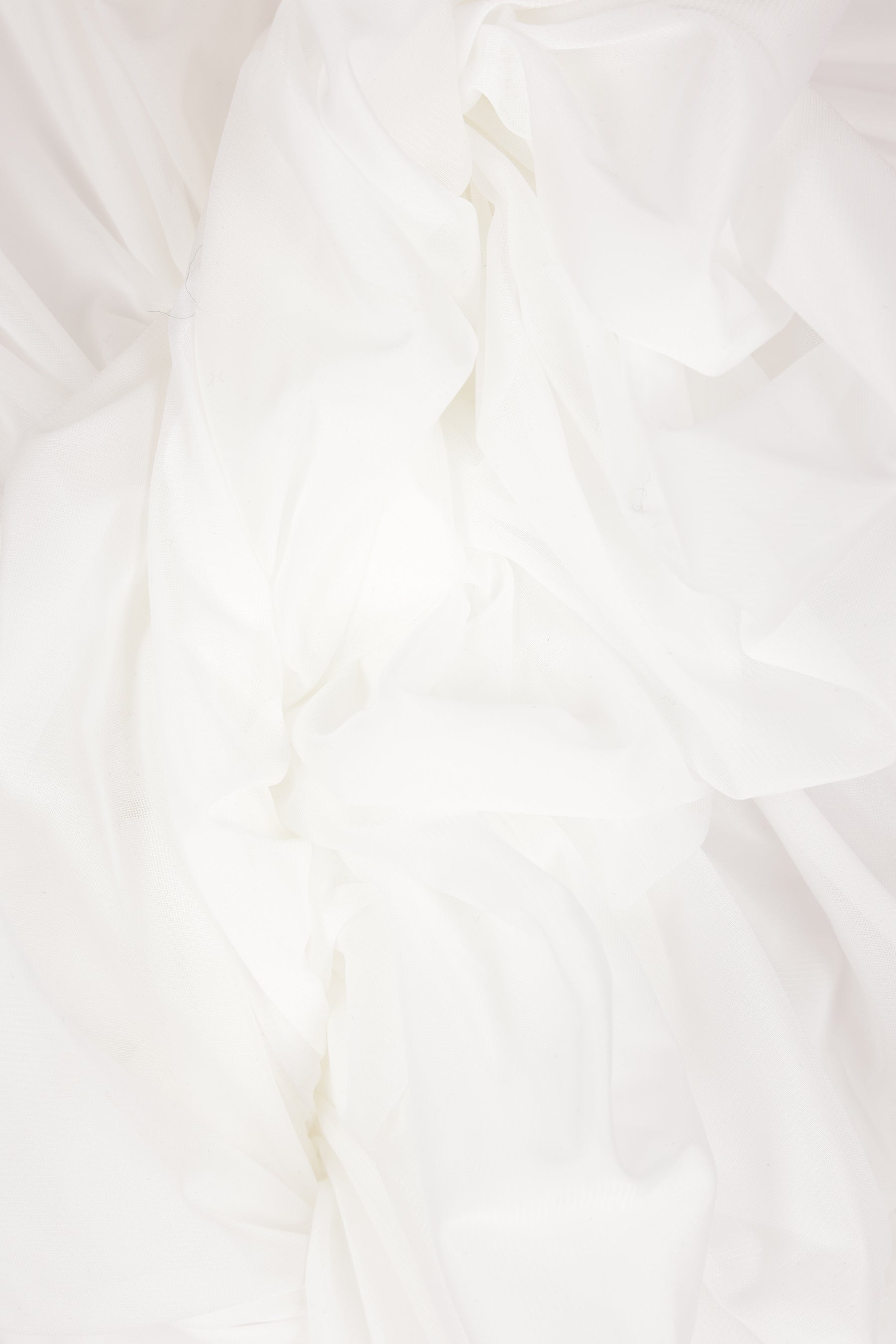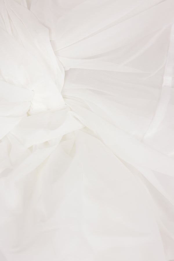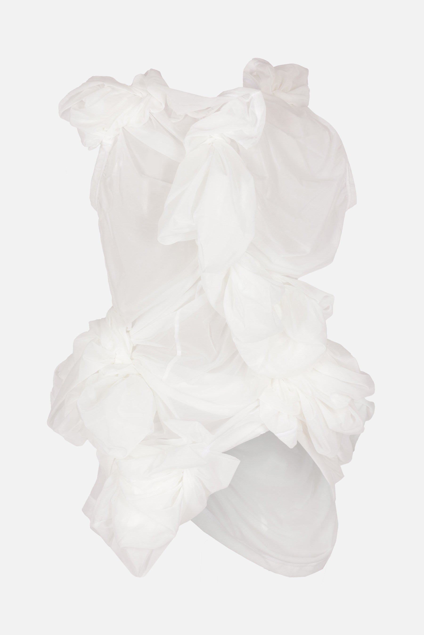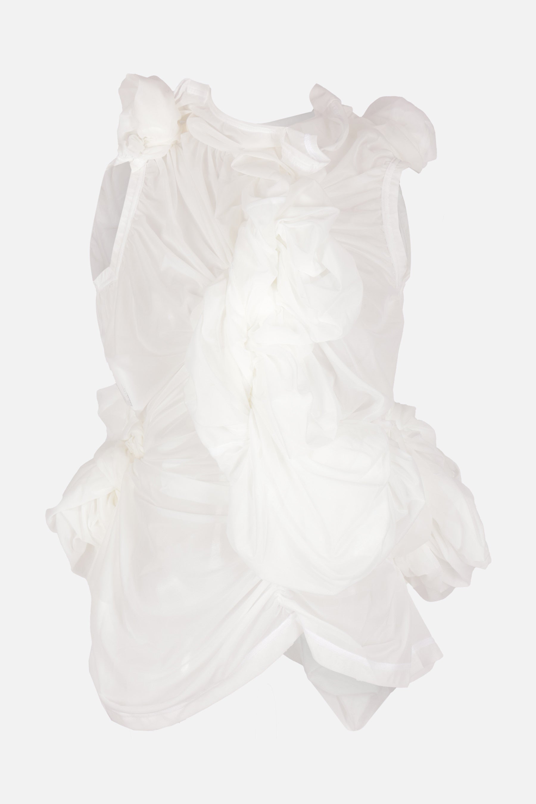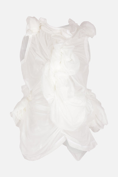 Comme des Garçons sleeveless top made from white chiffon. Features an asymmetric neckline, ruched design with ruffles, and asymmetric hem.
