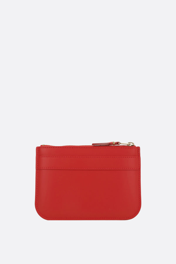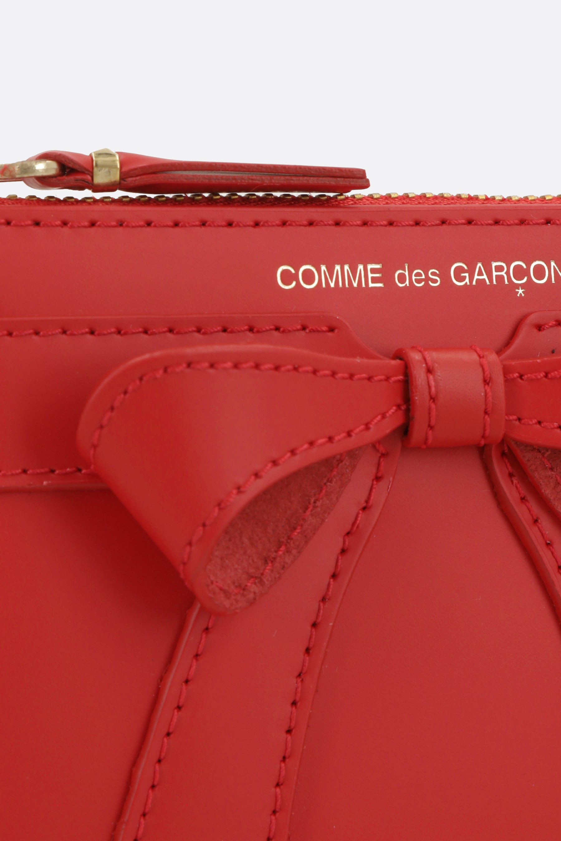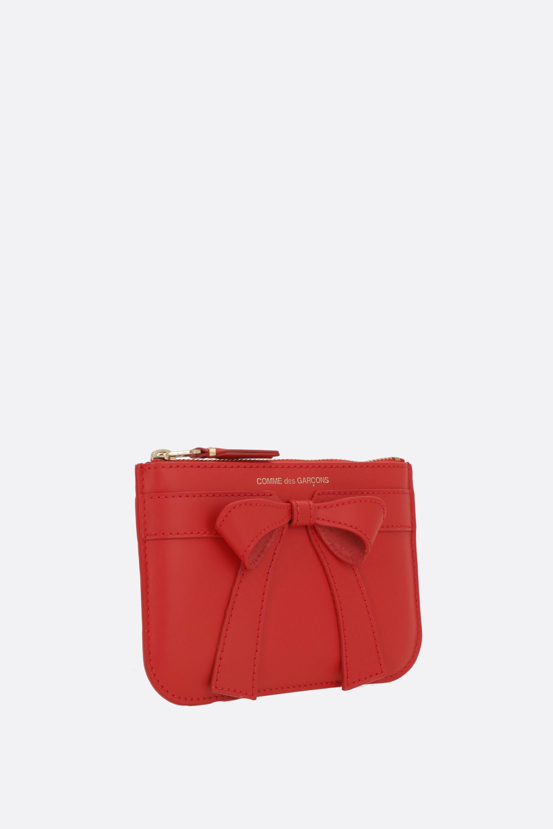 Pouch by Comme des Garçons Wallet made of smooth red leather with a 3D tone-on-tone bow. Featuring gold-tone hardware and a top zip closure. The interior is lined with black leather. The design is completed by the embossed front logo.