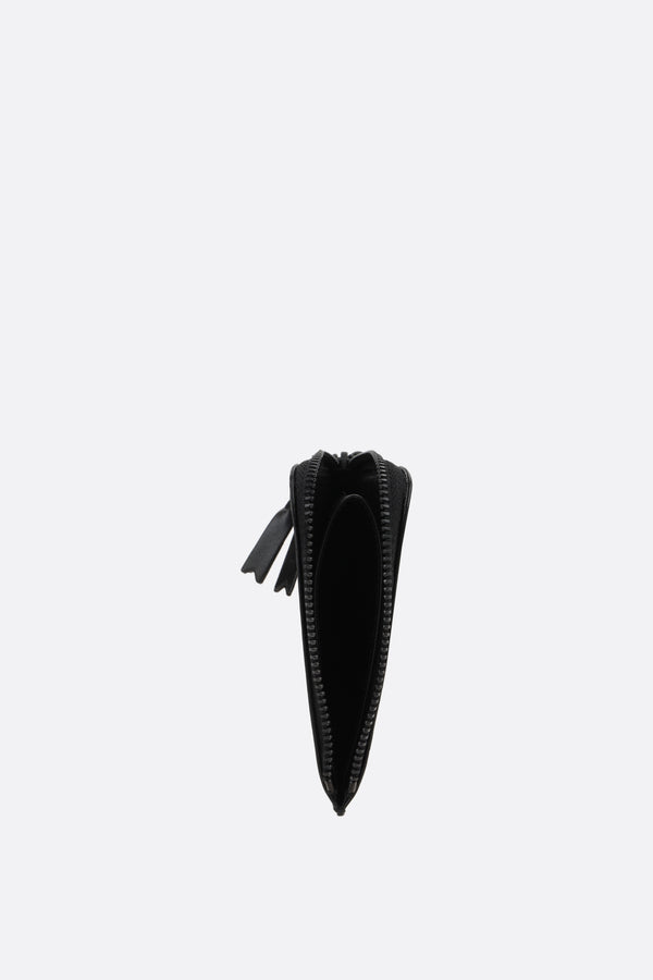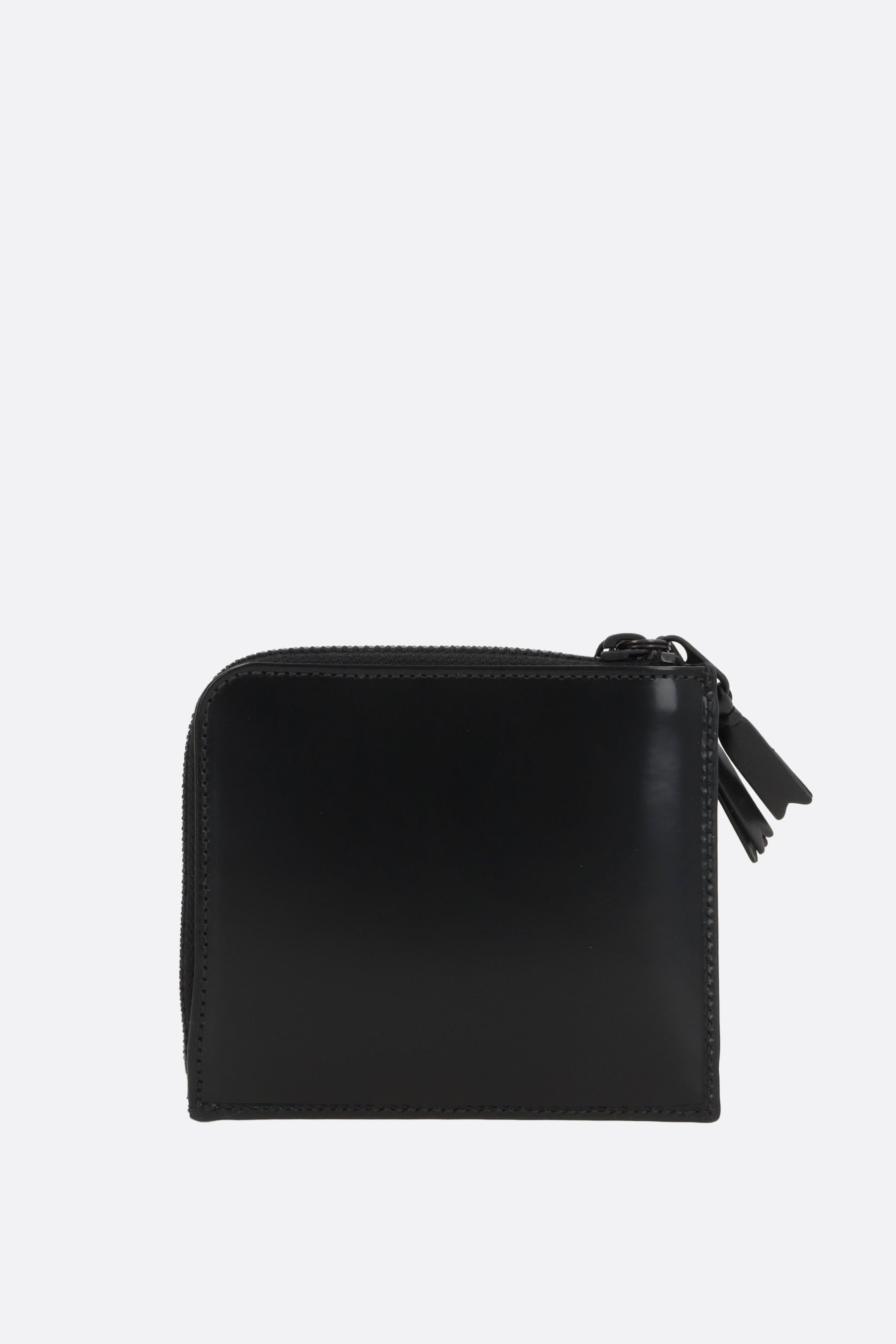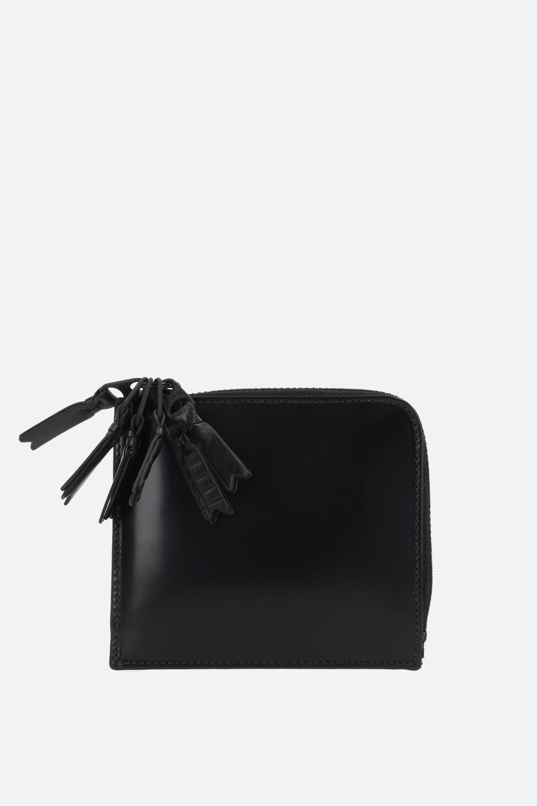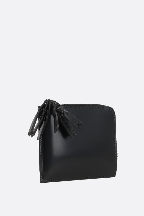 Comme des Garçons wallet crafted from glossy black leather. Featuring black metal hardware and a half-zip closure with six zip pulls. The leather-lined interior includes a central compartment. The design is completed with an embossed internal logo.