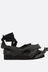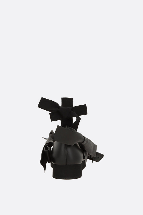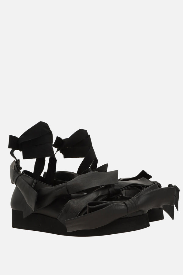 Ballet flat by PHILEO, designed in collaboration with Comme des Garçons and crafted from smooth black leather. Featuring a square toe with softened edges, a criss-cross ankle strap, leather lining, and a rubber sole.