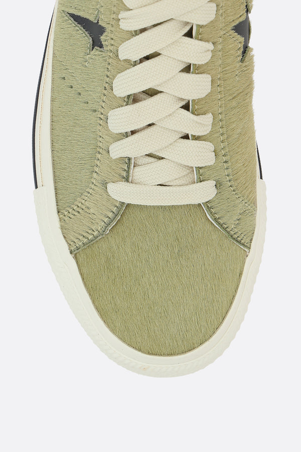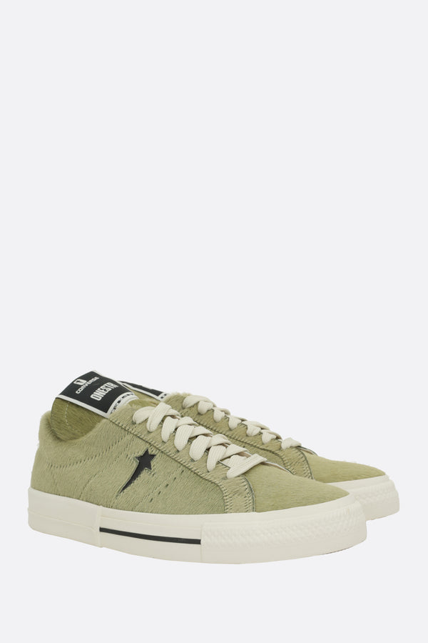 Converse x DRKSHDW low-top sneakers made of acid green pony hair. They feature a lace-up closure, round toe, faux leather and fabric lining, and rubber sole. The design is completed by the oversized Onestr label on the tongue and the signature Pentagram Collab logo on the side.
