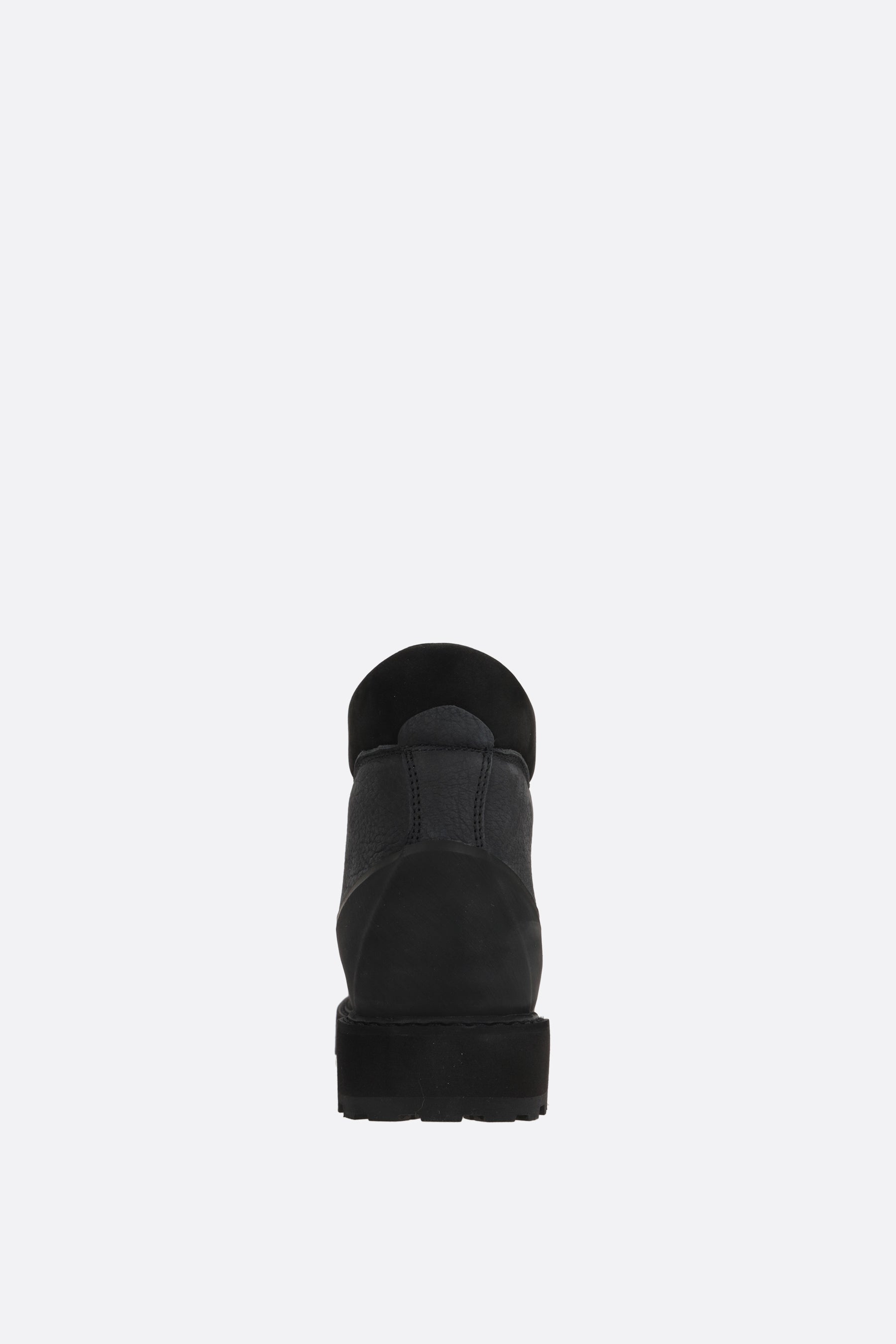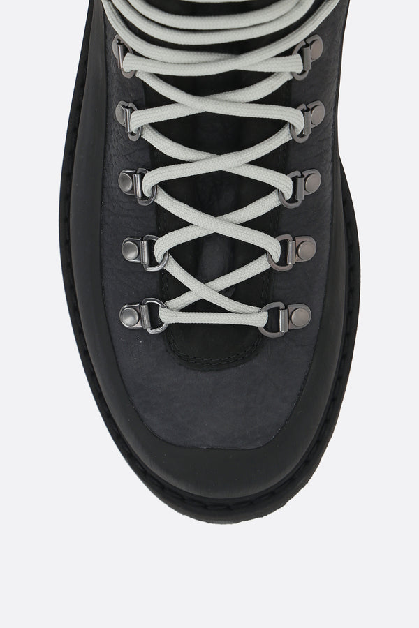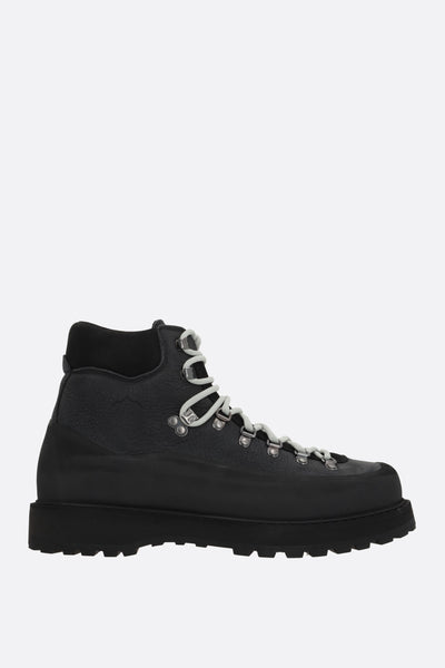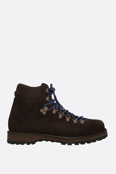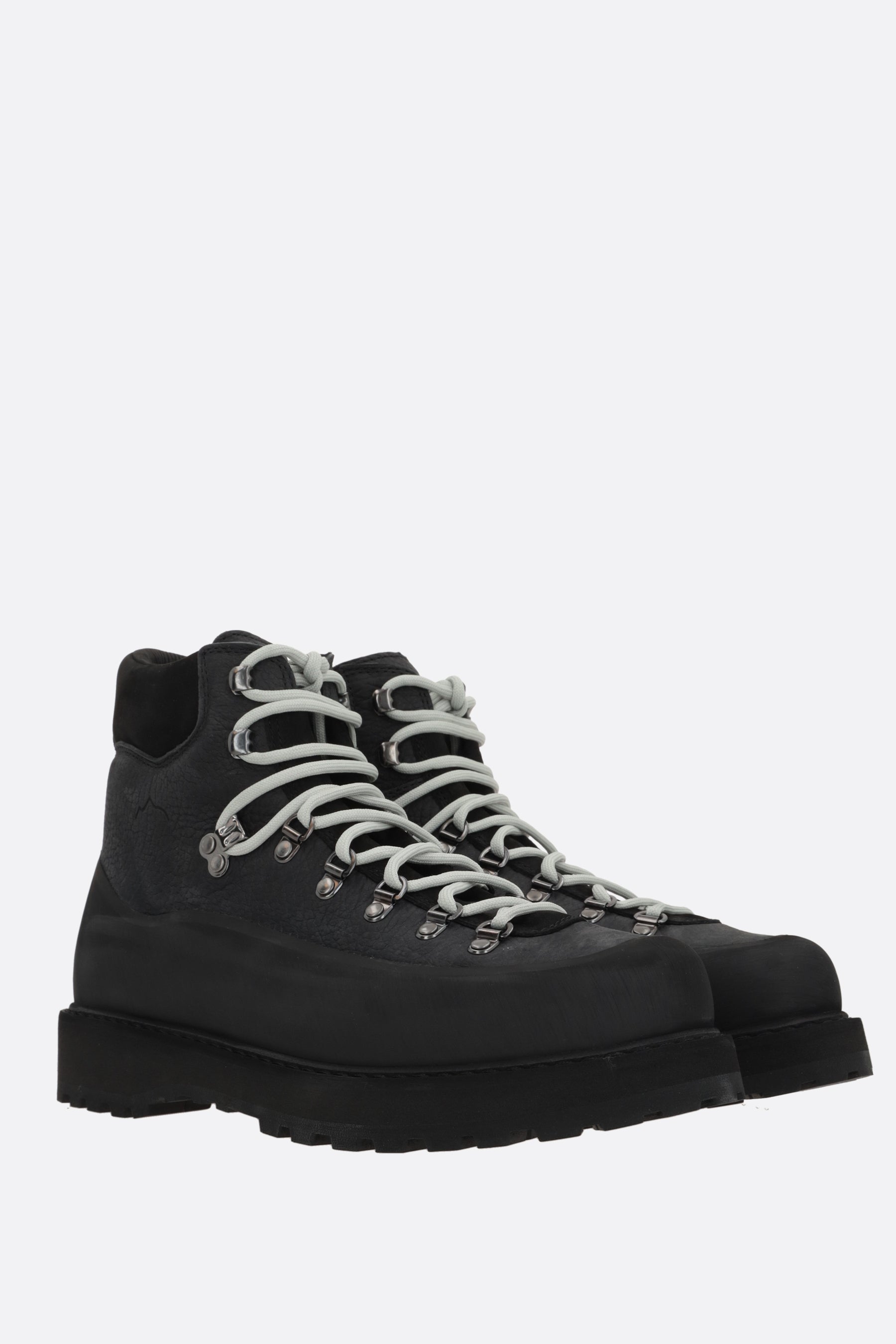 Diemme hiking boot made of black nubuck with suede ankle reinforcement and rubber trims. Features a rounded toe, lace-up closure, leather linings, and rubber lug sole. The design is completed by the Diemme logo embossed on the tongue.