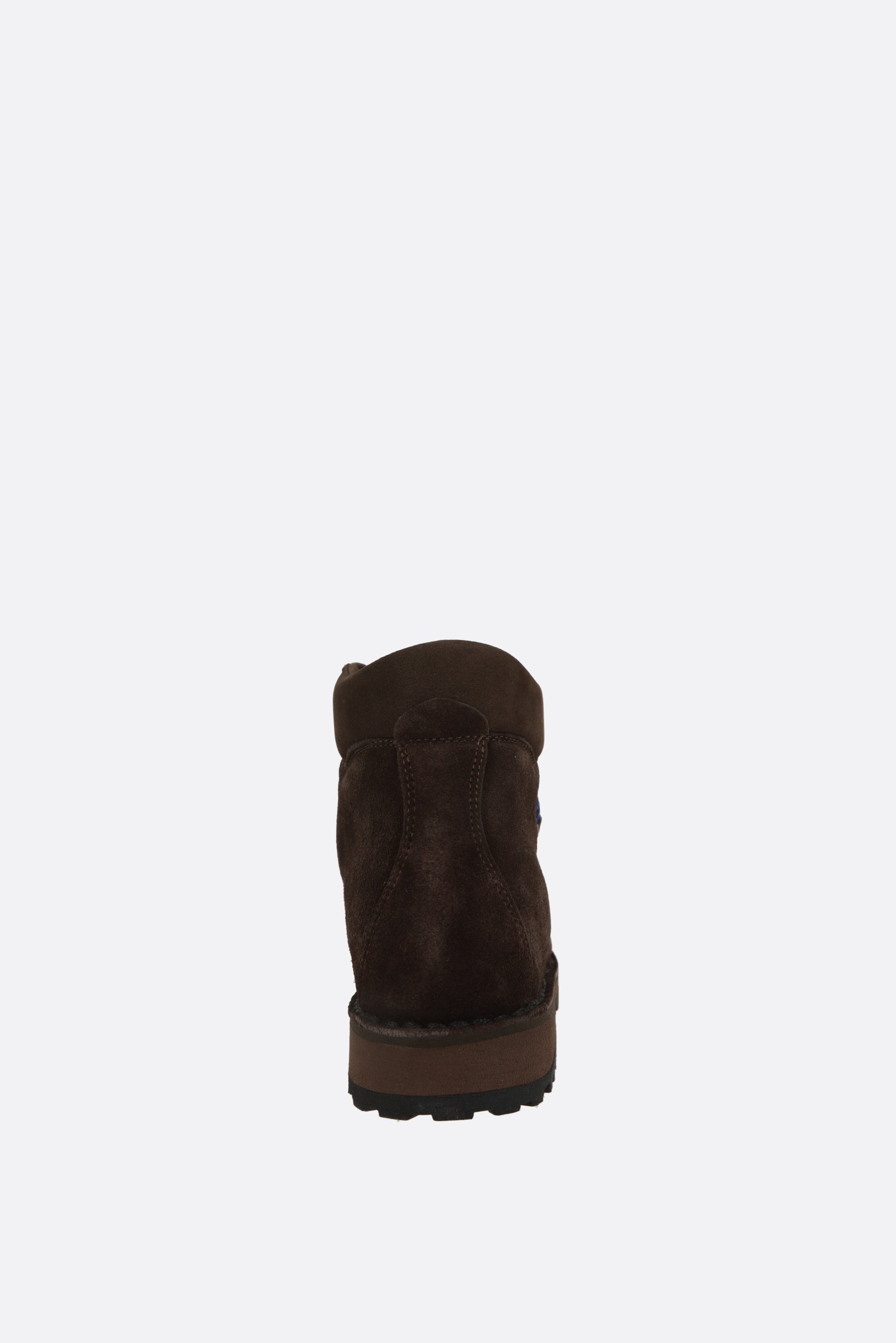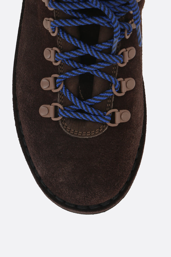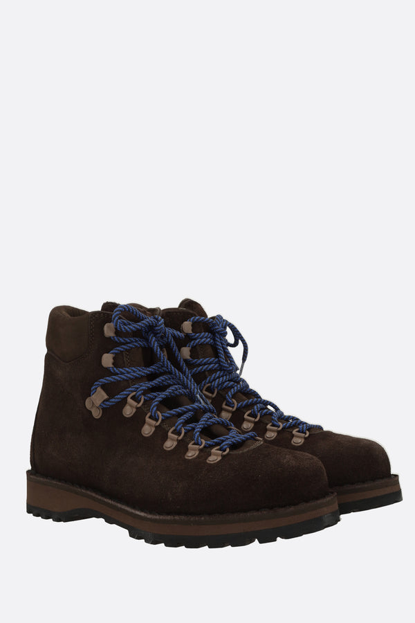 Diemme hiking boot made of dark brown suede with nubuck ankle reinforcement and rubber trims. Features a rounded toe, lace-up closure, leather linings, and rubber lug sole. The design is completed by the Diemme logo embossed on the tongue.