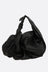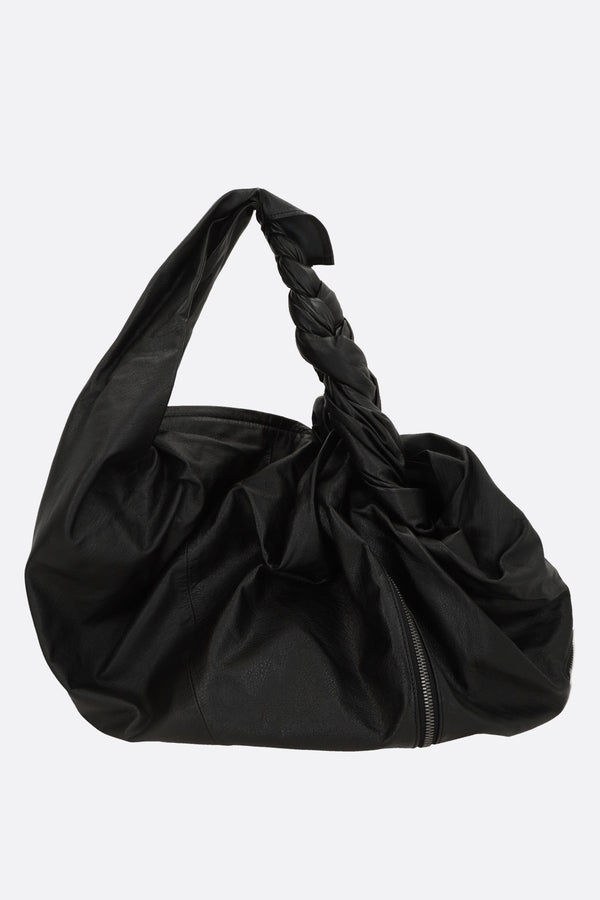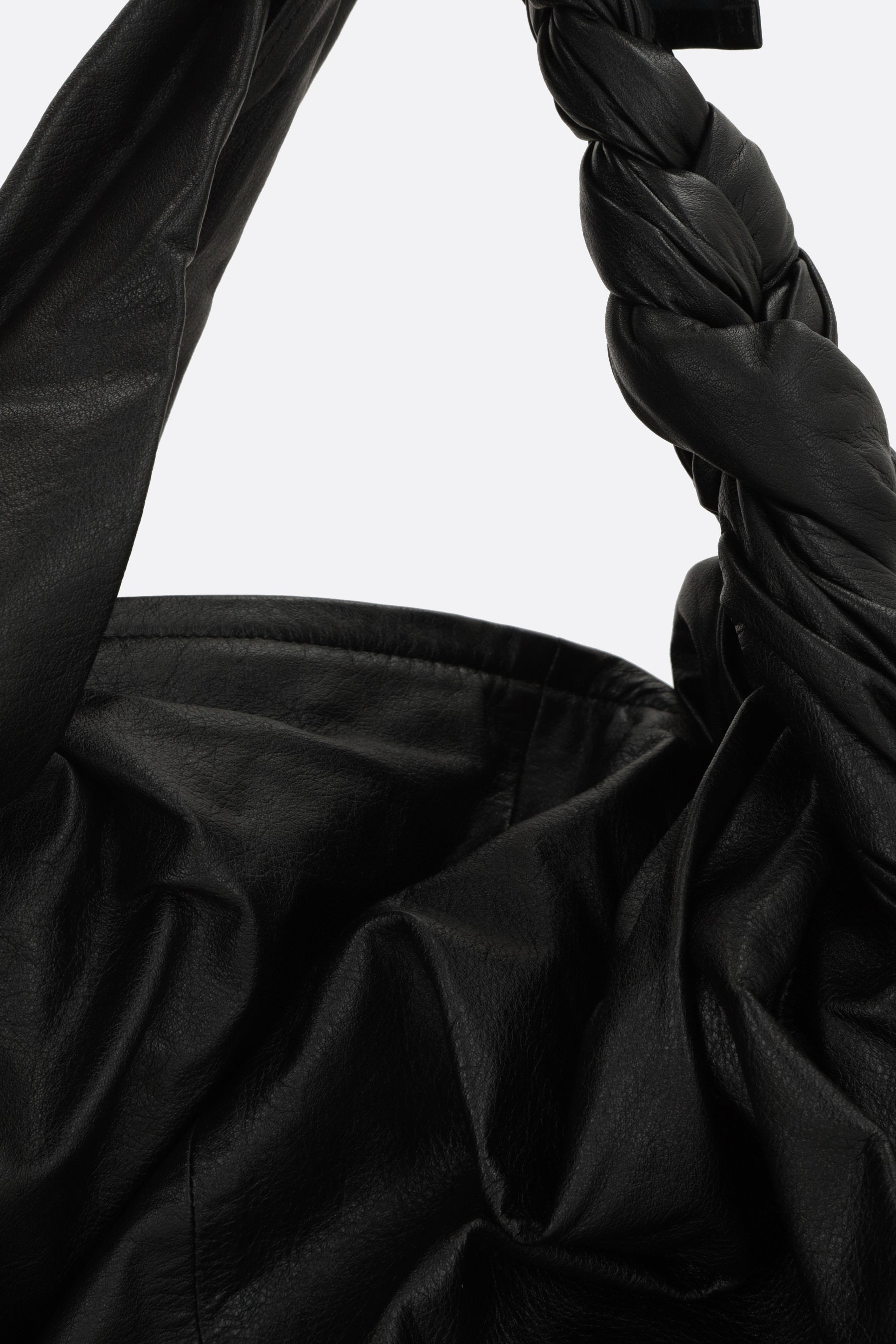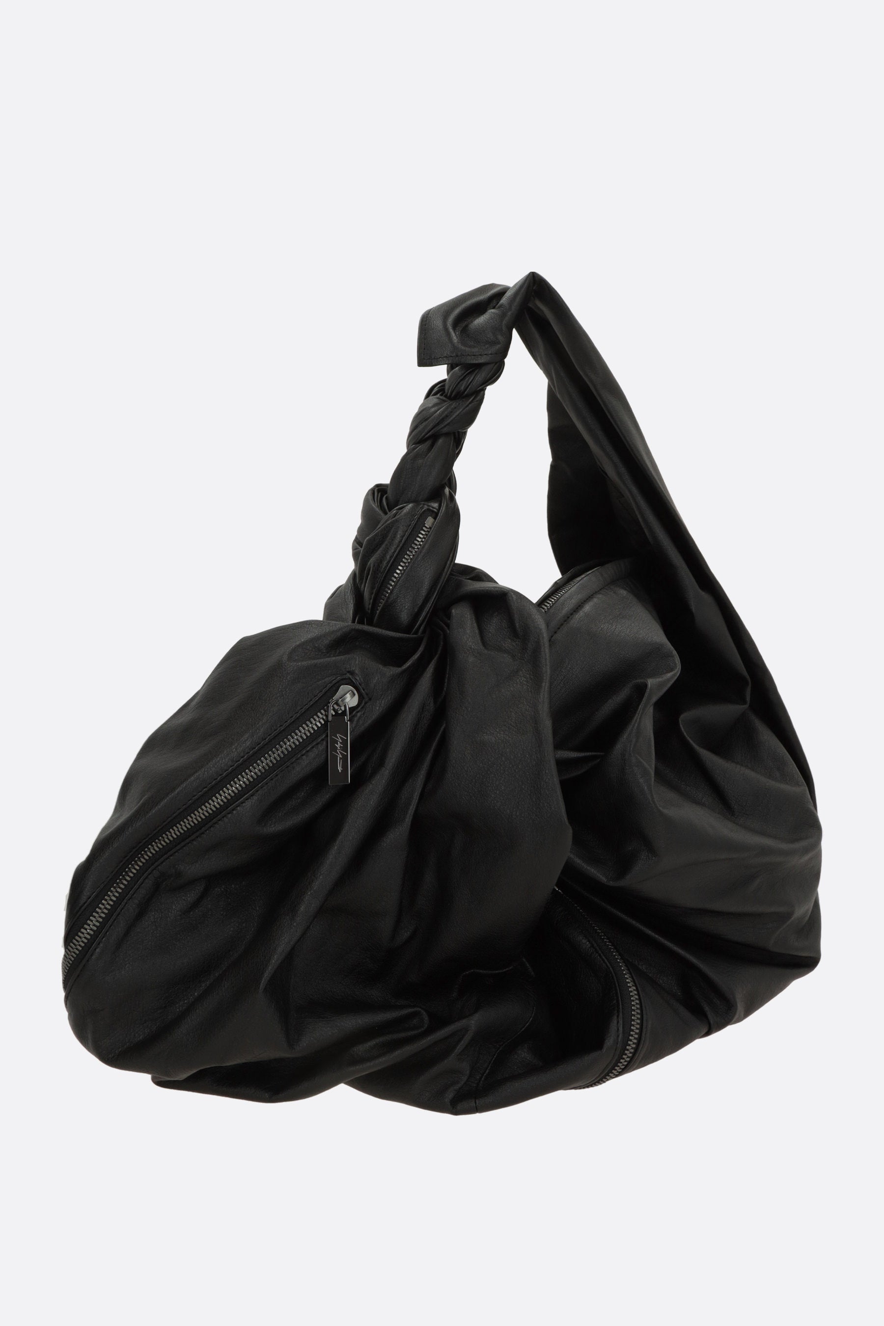 Discord Yohji Yamamoto draped bag crafted from black glossy leather. Featuring ruthenium-tone hardware, zip closure, and a handle with braided detail. The black canvas-lined interior includes a flat pocket. The design is completed by zip pockets revealing a tweed lining.