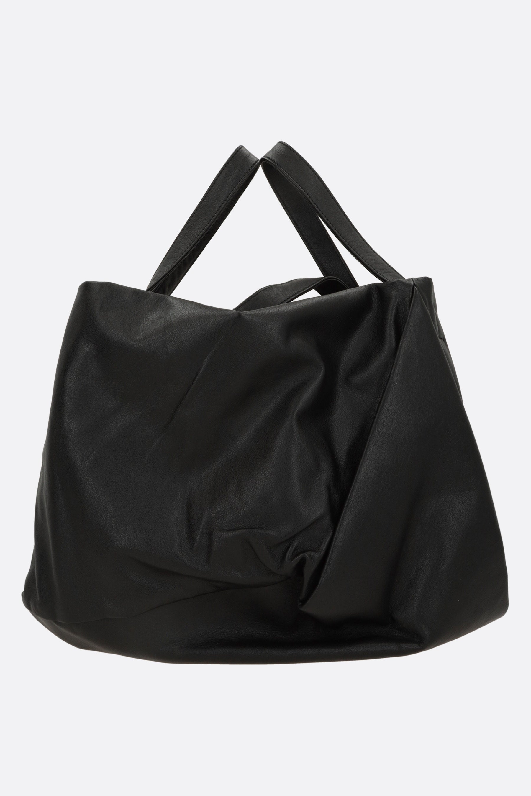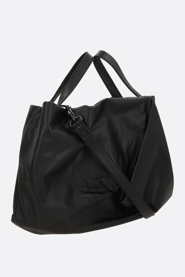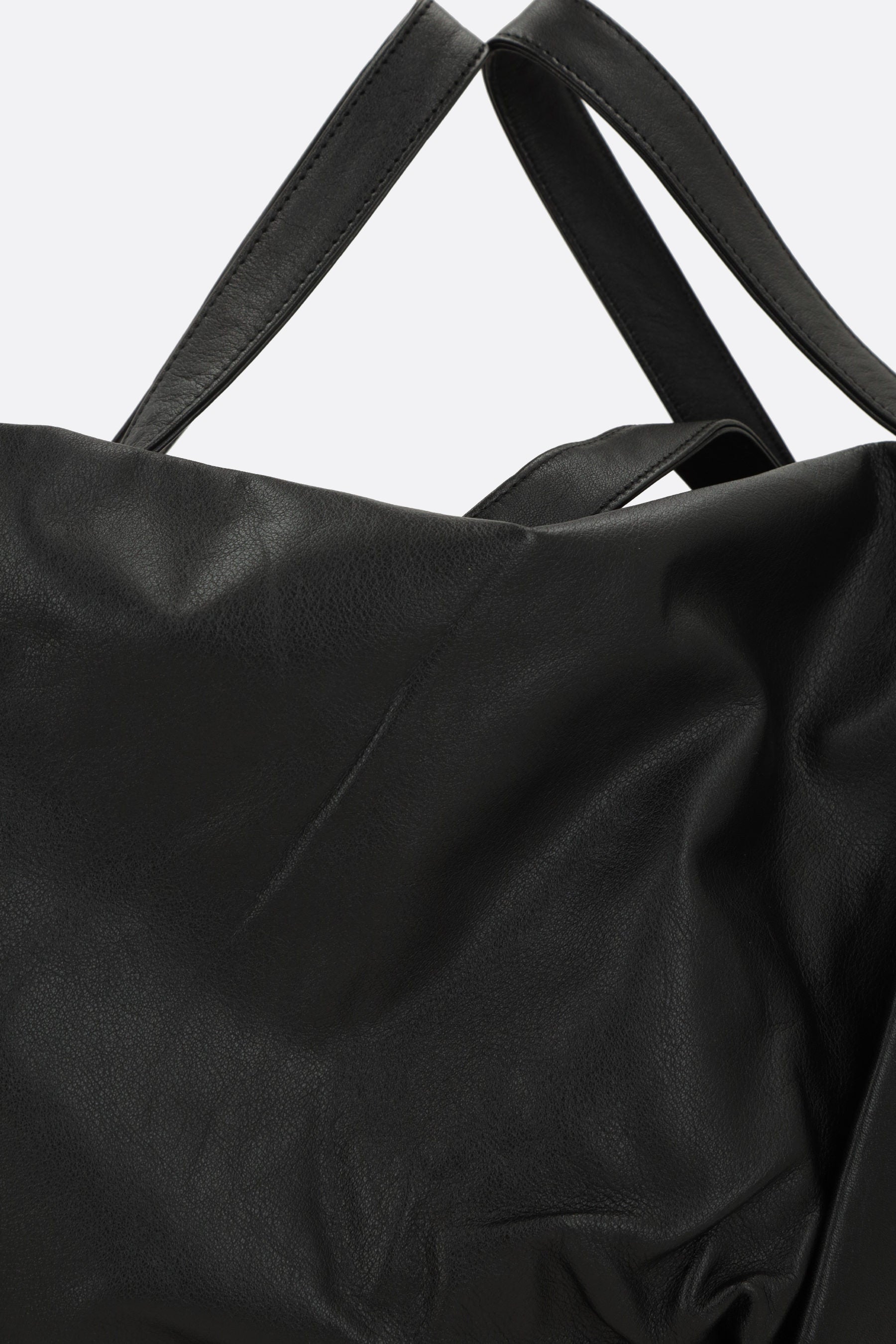 Discord Yohji Yamamoto handbag crafted from black glossy leather. Featuring ruthenium-tone hardware, zip closure, adjustable side handles, flat handles, and an adjustable / removable shoulder strap. The black canvas-lined interior includes a zip pocket.