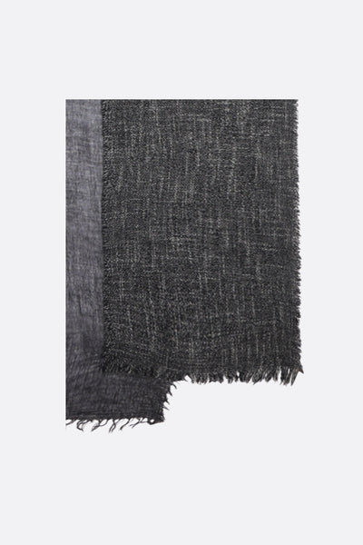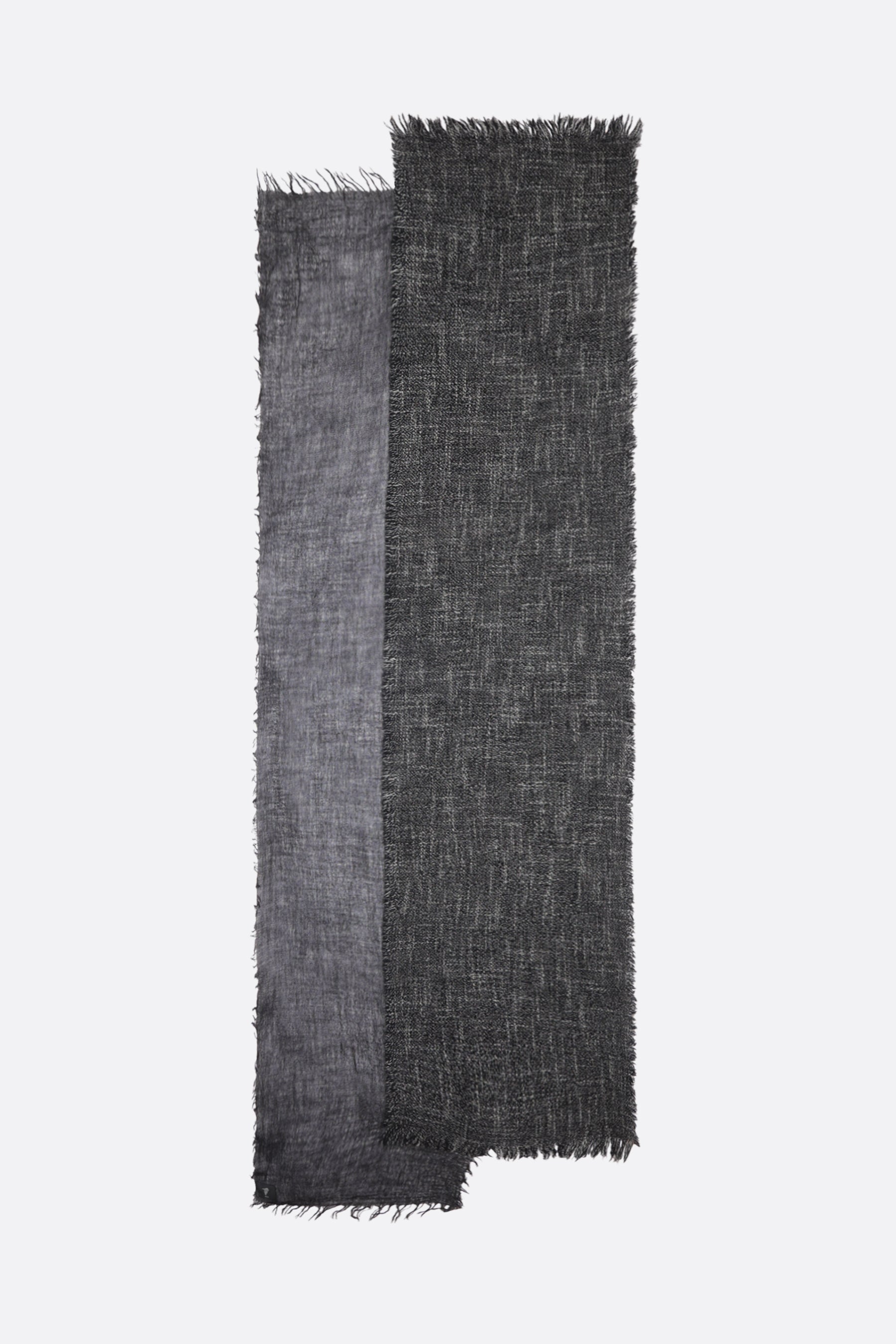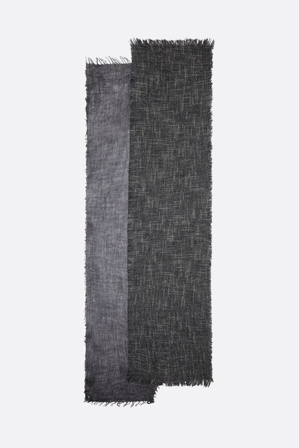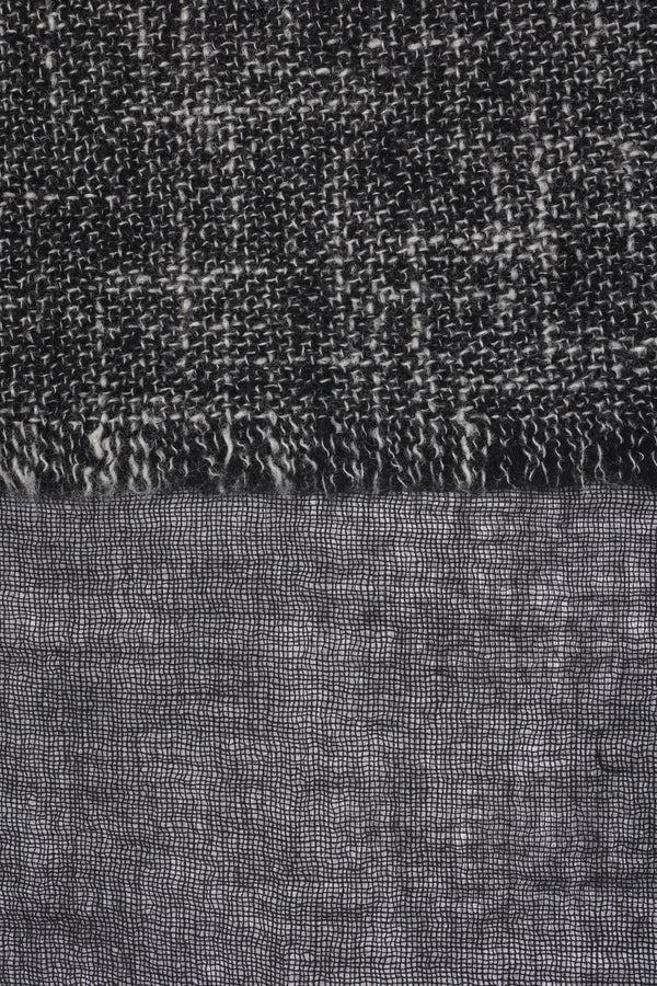 Discord Yohji Yamamoto asymmetric scarf crafted from black wool gauze and needle-punched tweed with fringed edges.