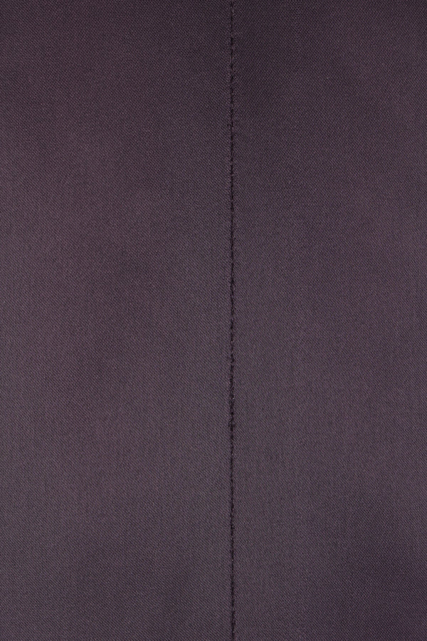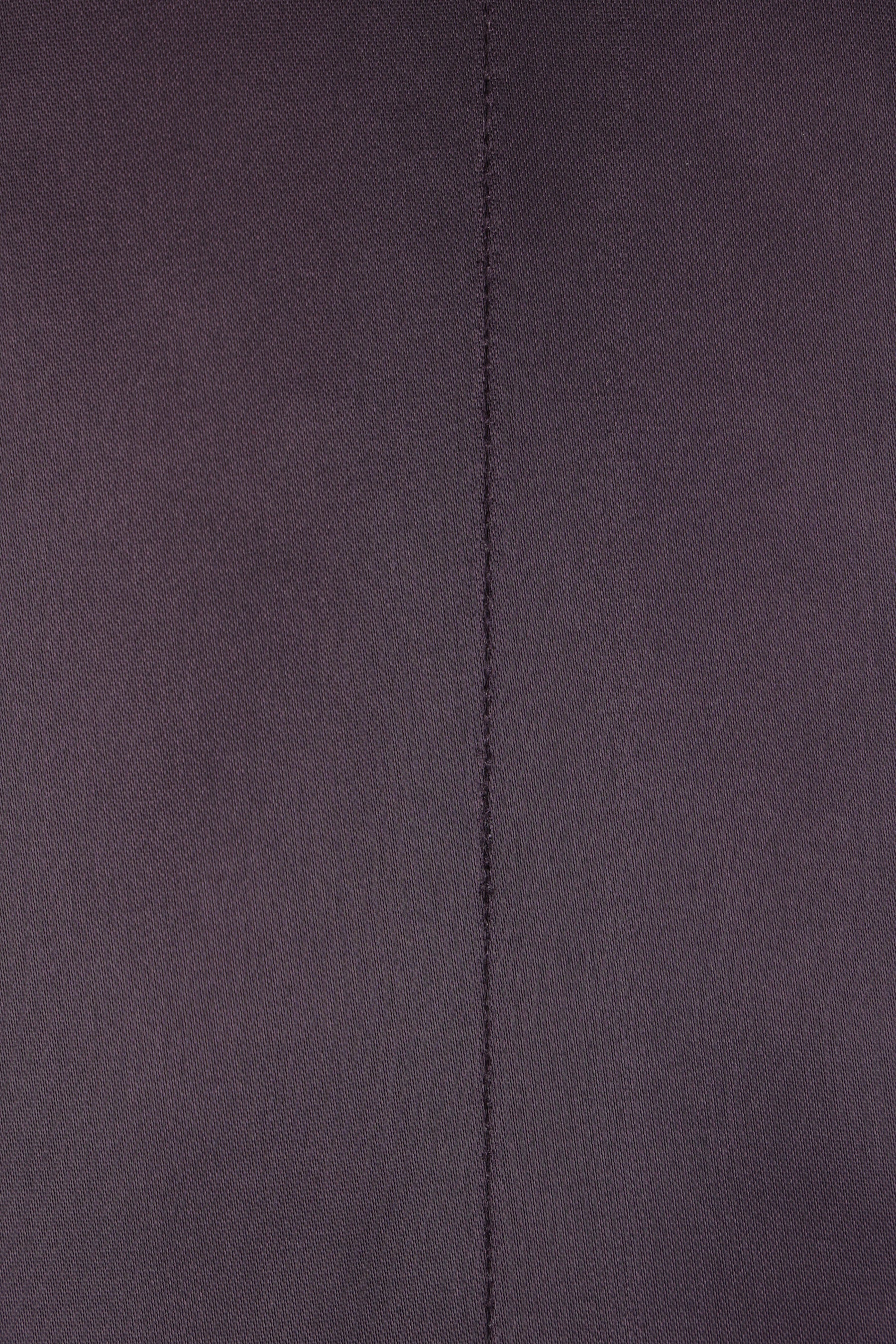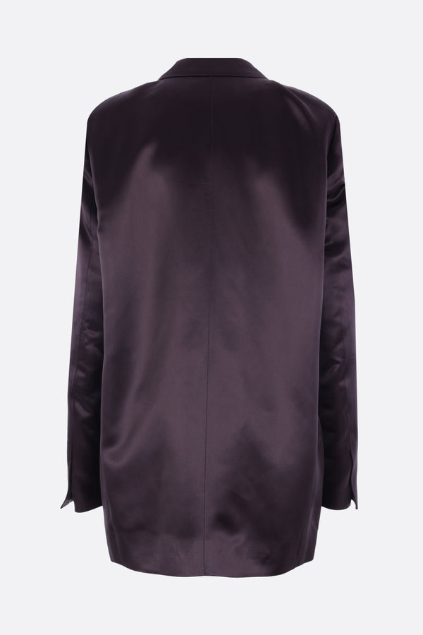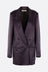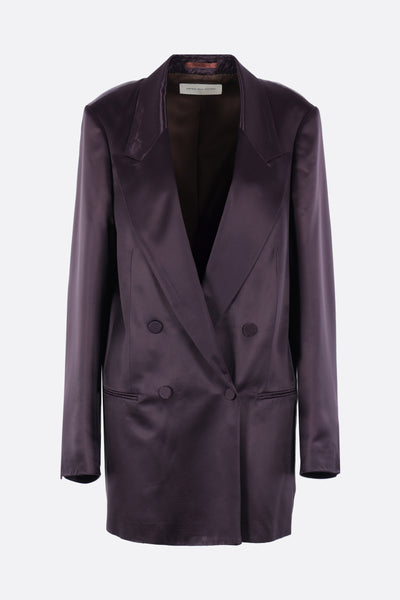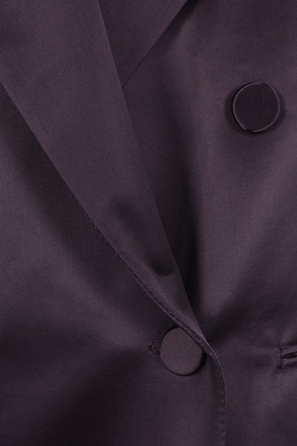 Dries Van Noten double-breasted jacket crafted from dark purple satin. Featuring peaked lapels, front closure with covered buttons, double welt pockets, long sleeves with slit cuffs, and lined interior.