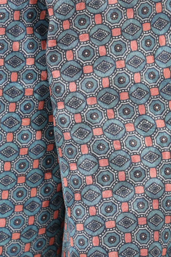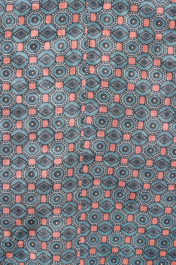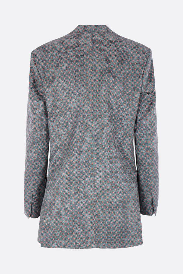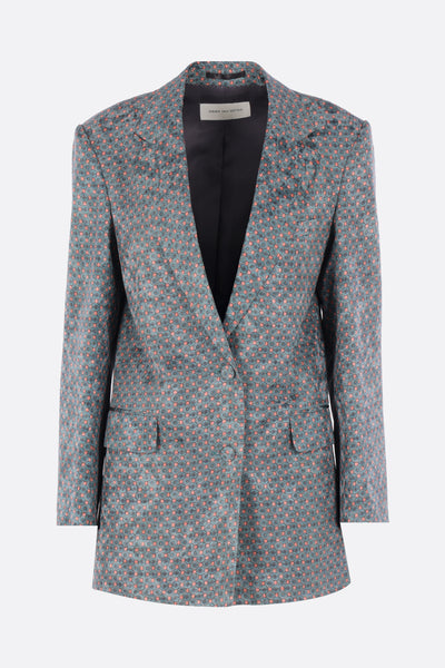 Dries Van Noten single-breasted jacket crafted from viscose satin with all-over tie print and floral jacquard motif. Featuring classic lapels, front closure with covered buttons, flap pockets, padded shoulders, long sleeves with slit cuffs, side slits, and lined interior.