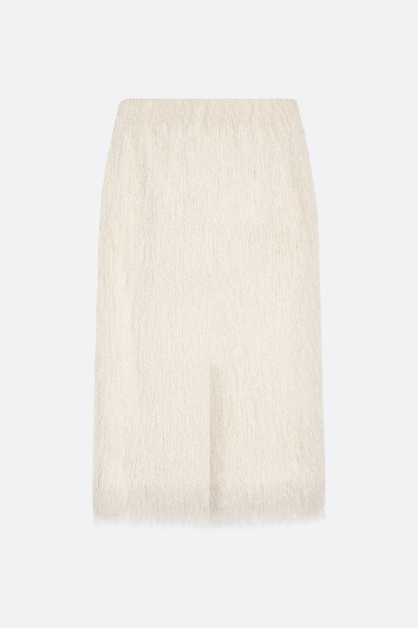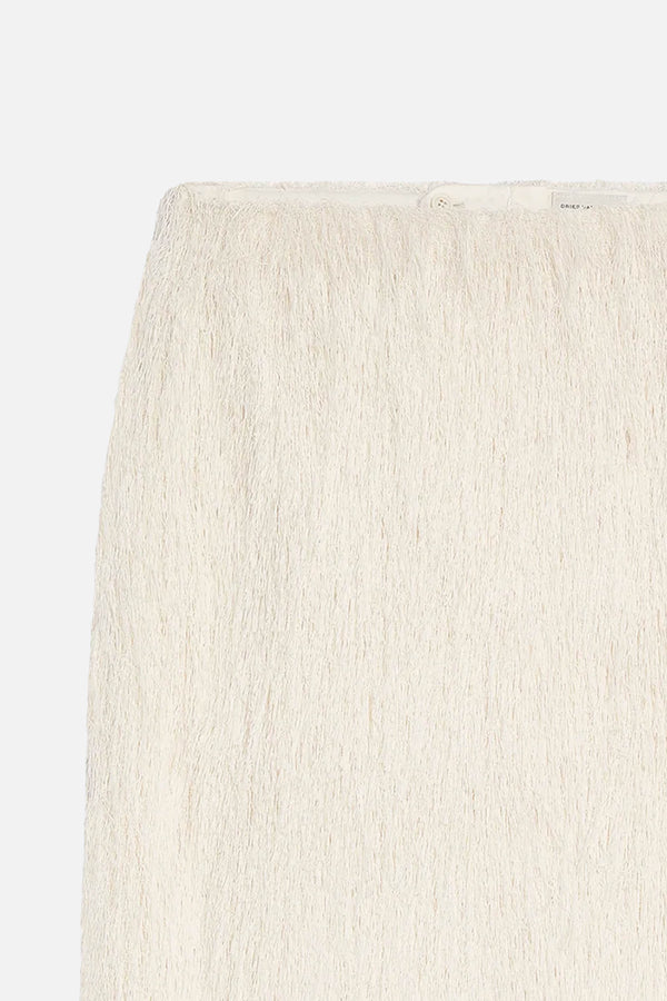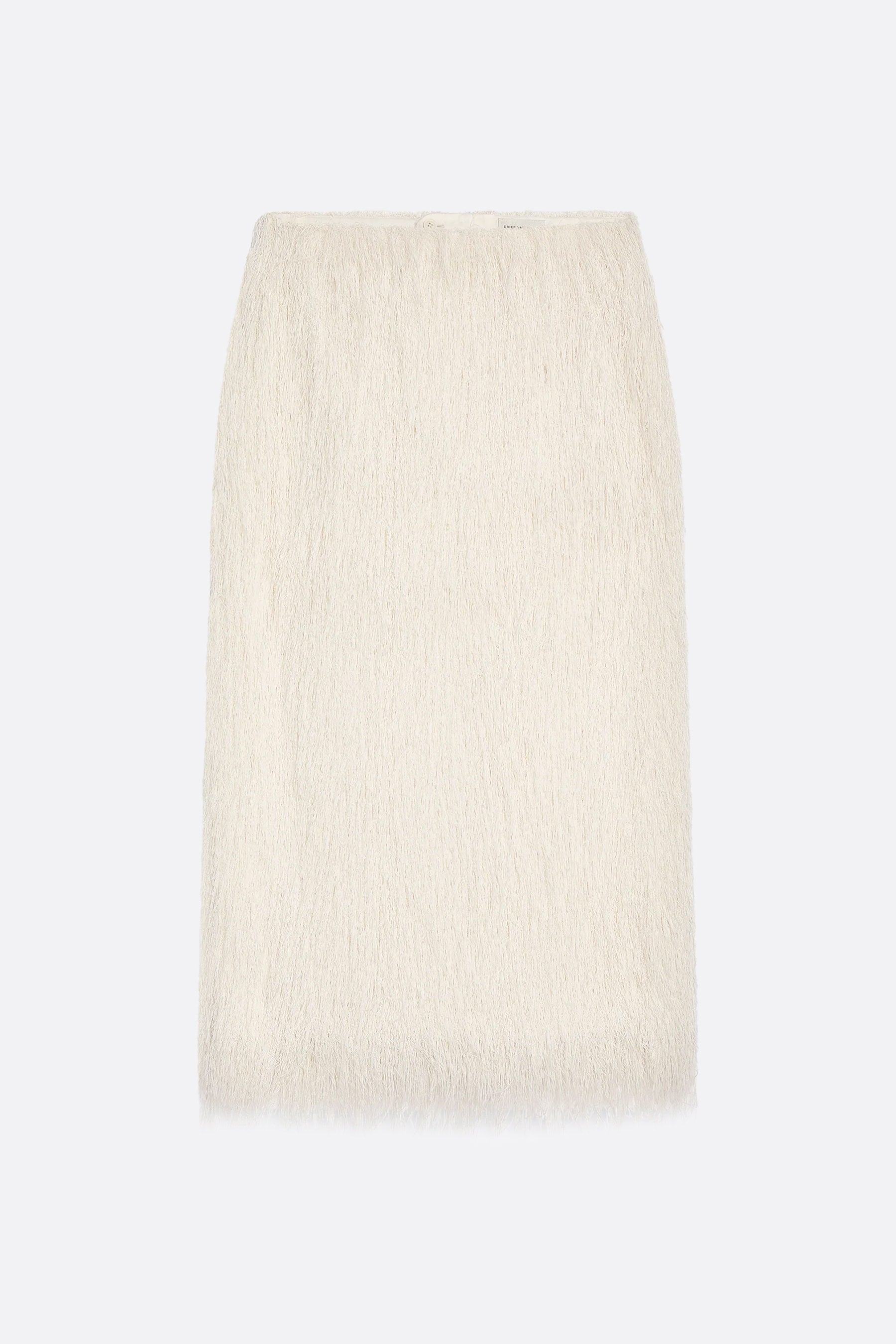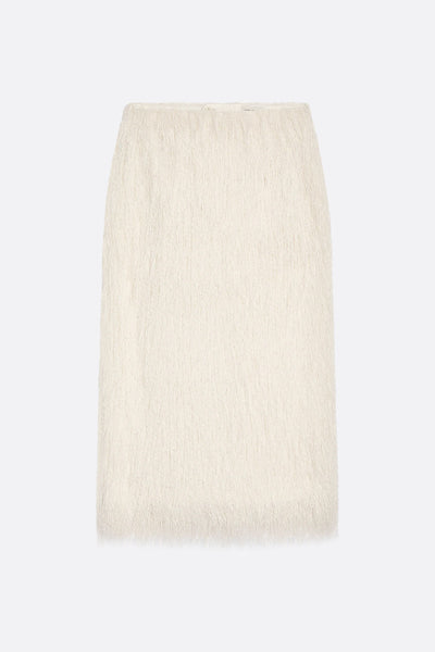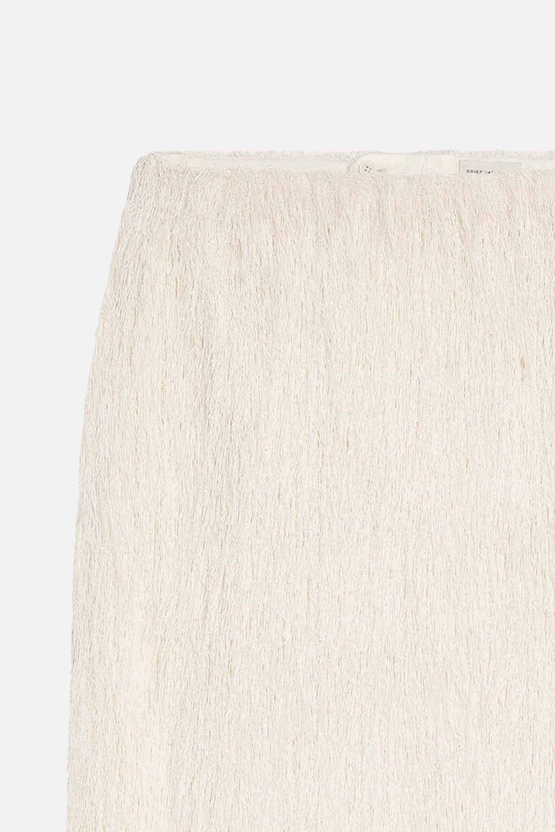 Dries Van Noten midi skirt crafted from lightweight fringe fabric. Featuring a back hook and button closure, a rear slit, and a lined interior.