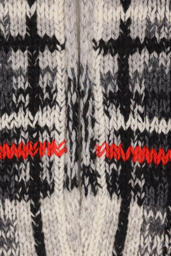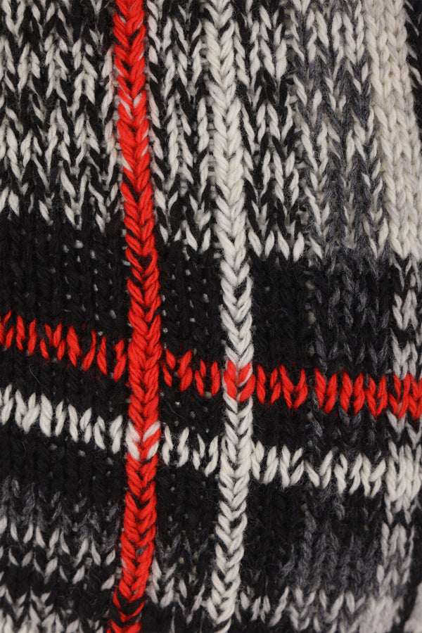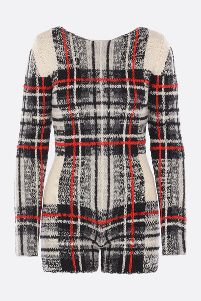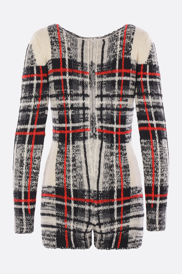 Duran Lantink jumpsuit crafted in wool knit with a check pattern in cream, black, and red tones. Featuring a crew neckline, back zip closure, long sleeves, shorts-style pants, and ribbed trims.