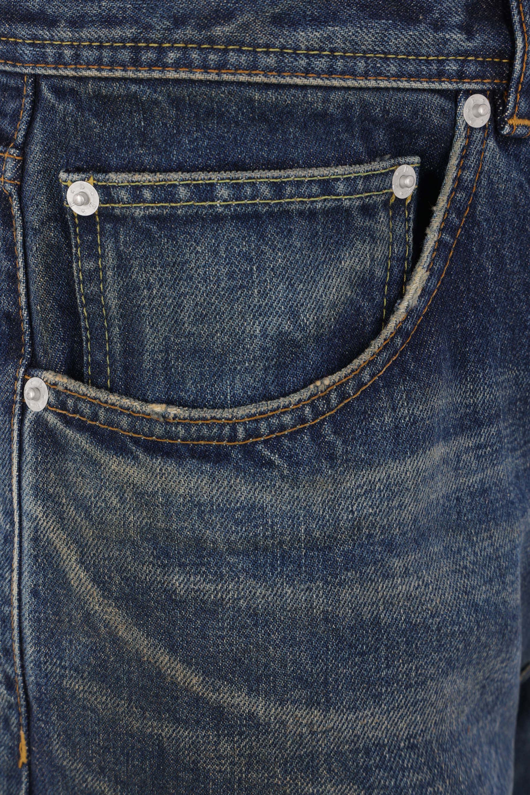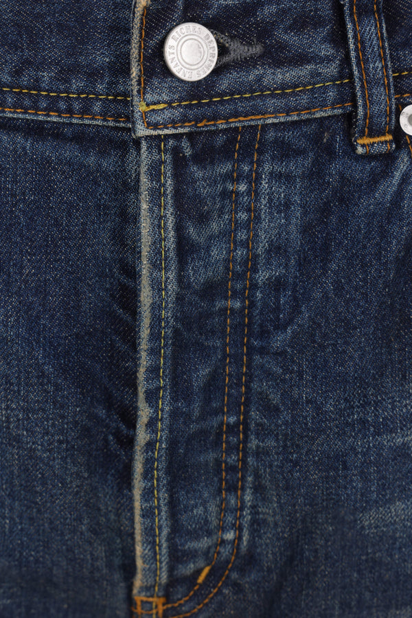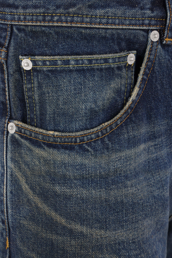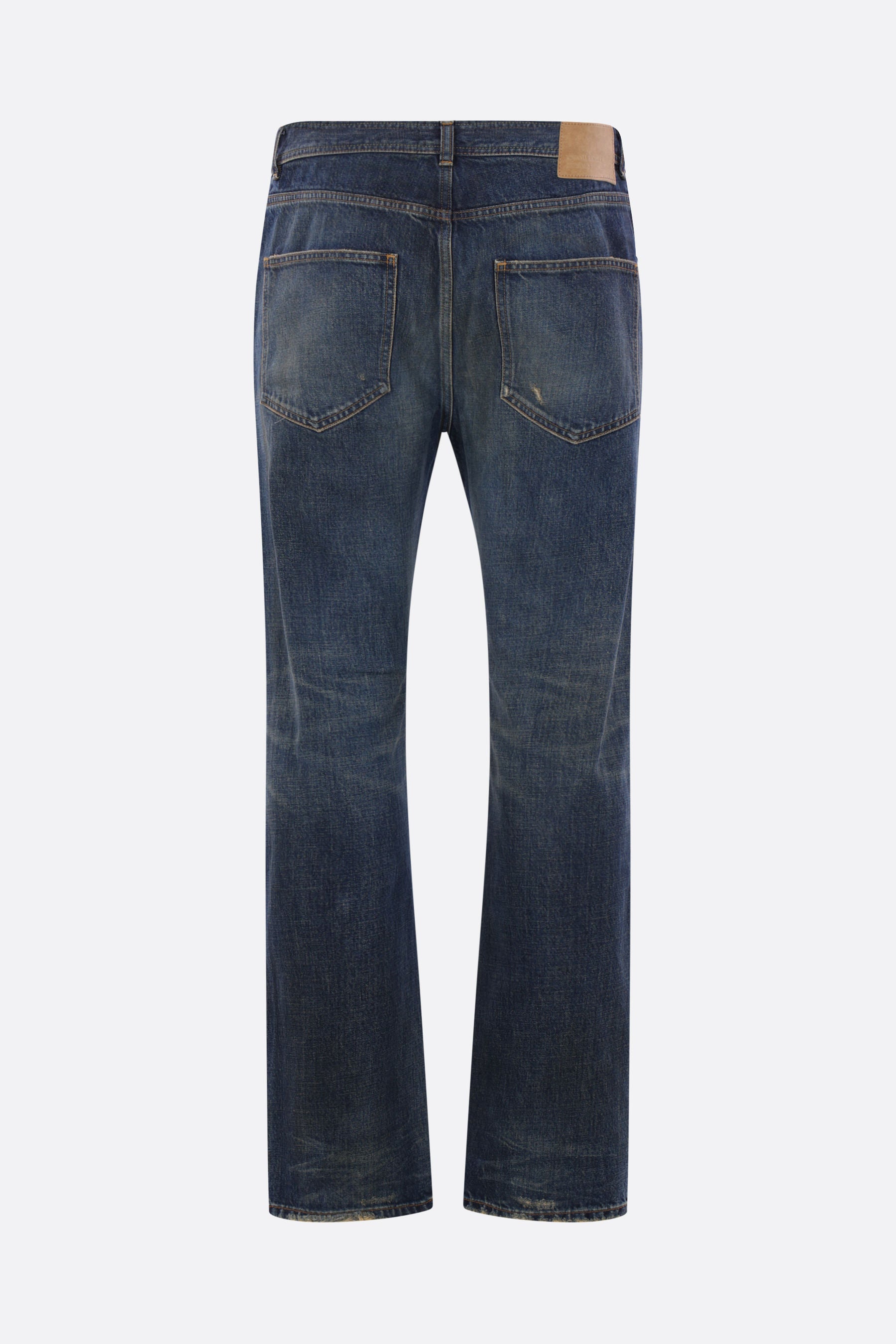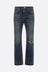 Enfants Riches Déprimés straight-leg jeans crafted from blue cotton denim with a distressed effect. Featuring a front metal button closure, belt loops, five classic pockets, and a logo patch on the back.