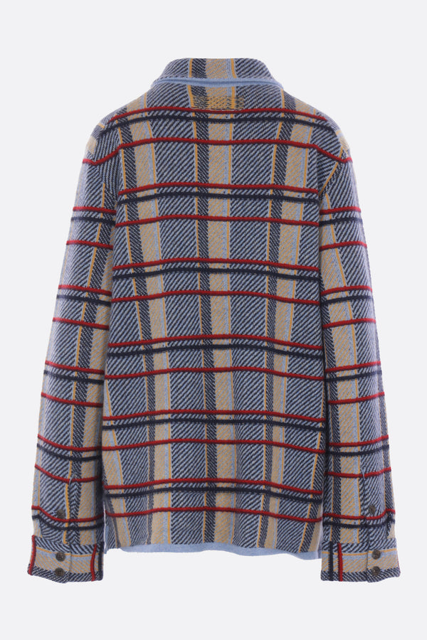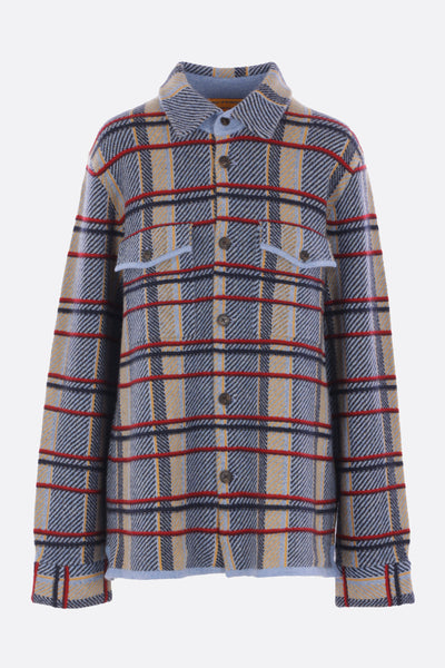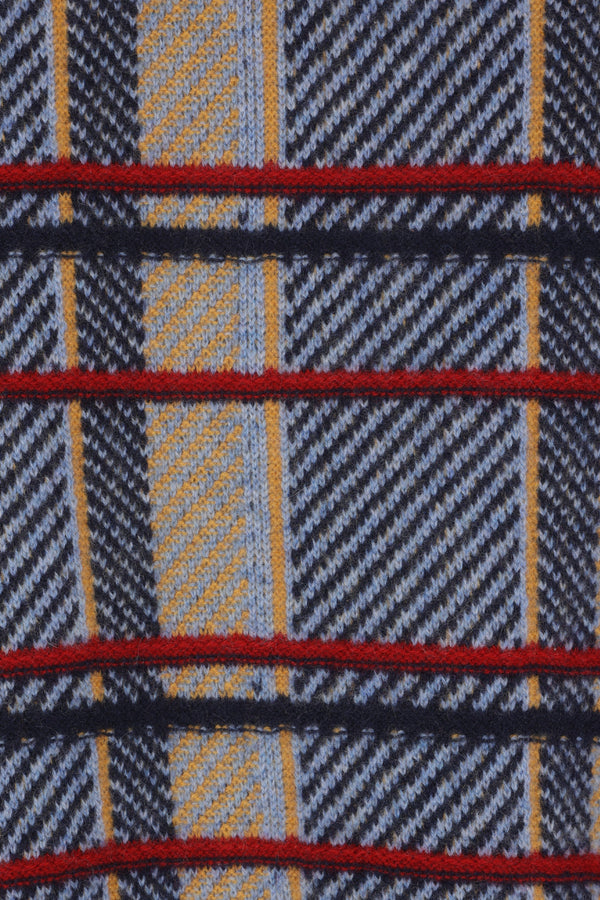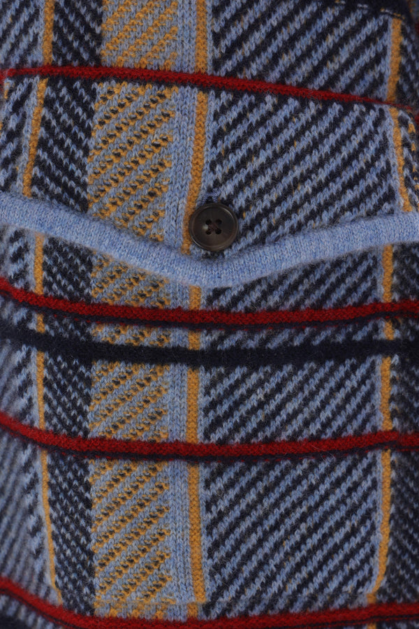 Guest In Residence checkered cardigan crafted from cashmere in shades of light blue, yellow, and blue. Featuring a pointed collar, button closure, flap pockets, long sleeves with buttoned cuffs, and a straight hem with small side slits.
