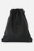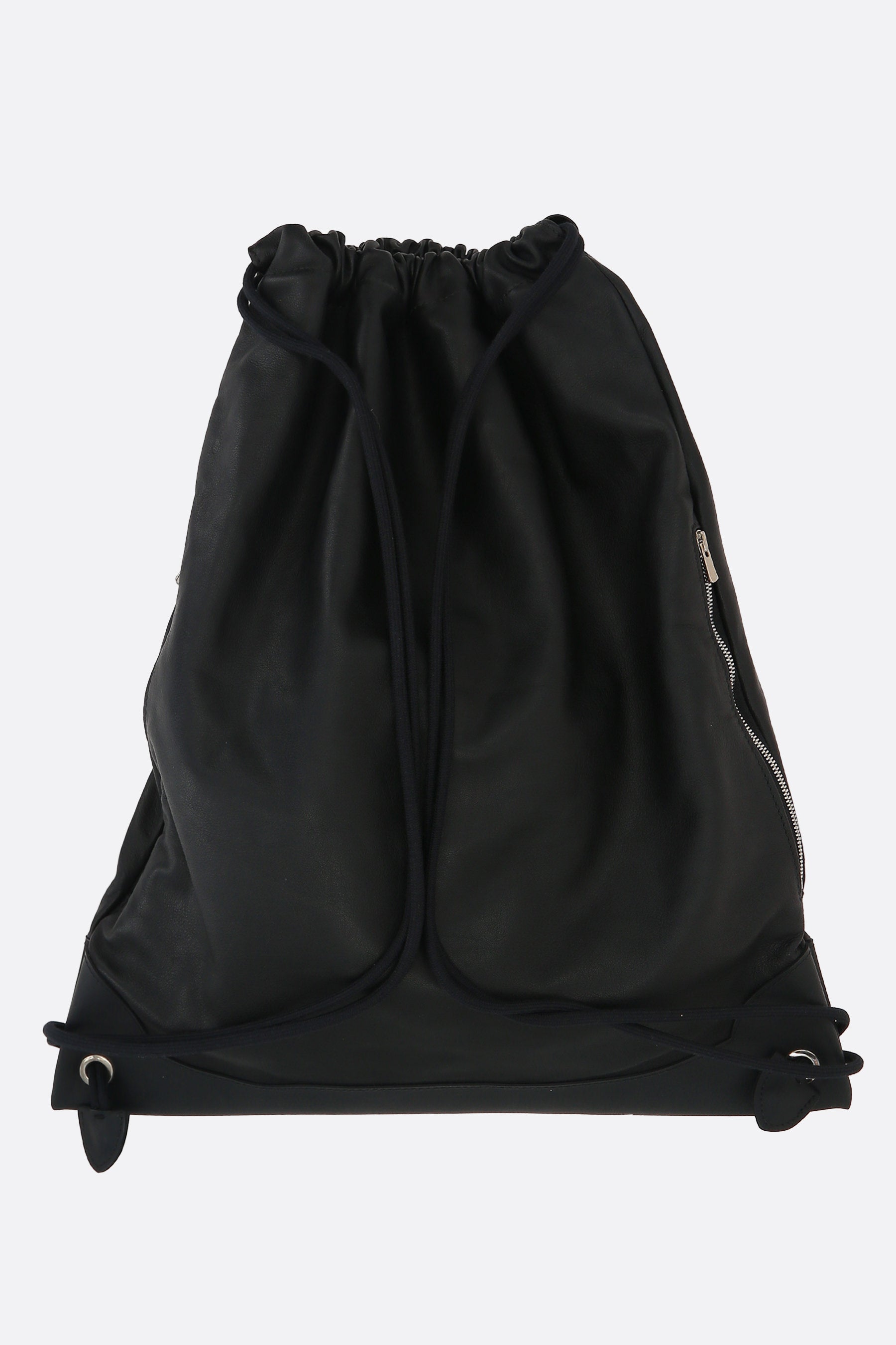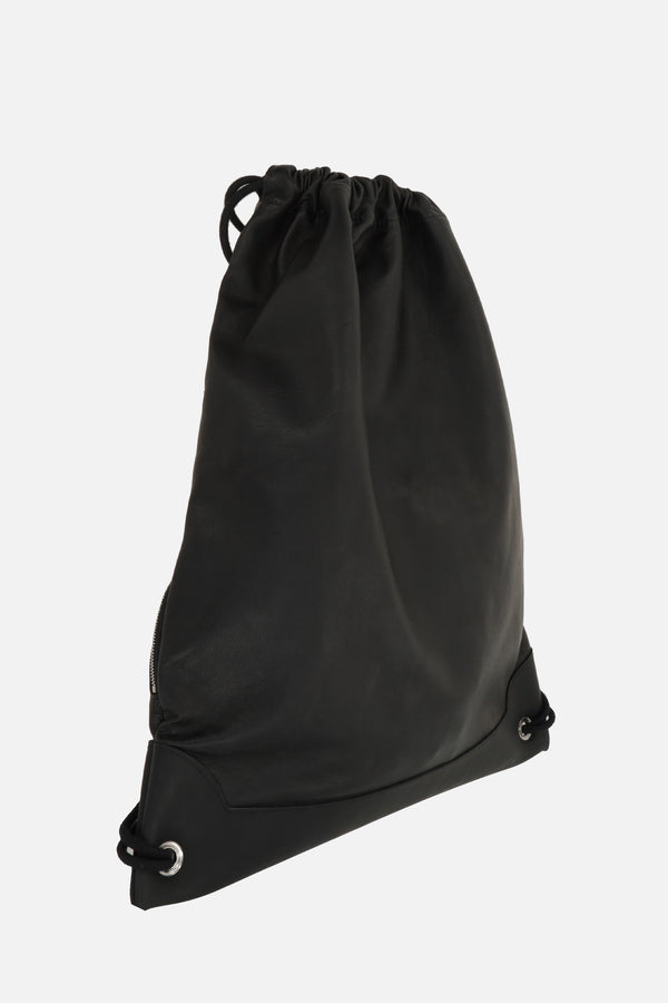 Guidi drawstring backpack crafted from black grained leather with a tonal rubberized leather base. Featuring silver-tone hardware, a drawstring closure, rope shoulder straps, and side zip pockets. The interior is lined in black nylon.