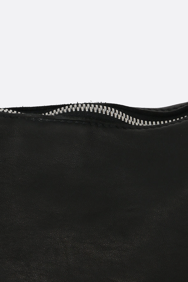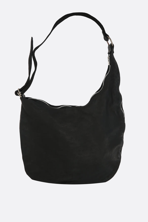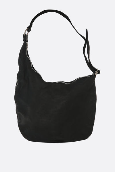 Guidi shoulder bag crafted in black soft grained leather. It features antique silver-tone hardware, zip closure and adjustable shoulder strap. Black suede-lined interior. The design is completed by side zip pocket.