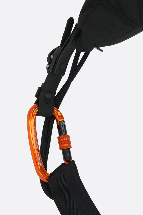 Shoulder bag by Innerraum crafted from black quilted nylon. Features black hardware, double-slider zip closure, and an adjustable shoulder strap with oversized orange metal carabiner. The tone-on-tone fabric-lined interior includes a zip pocket.